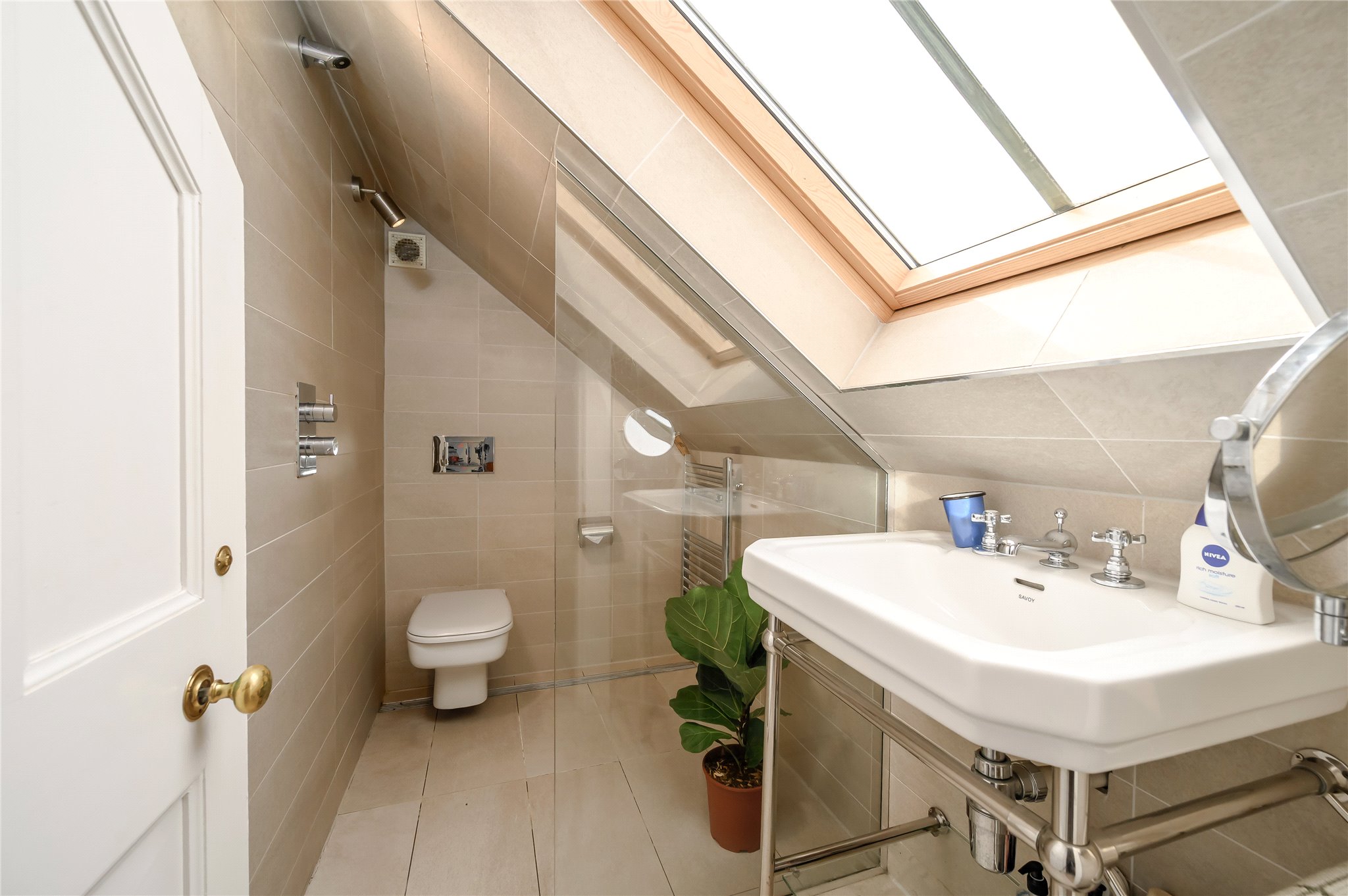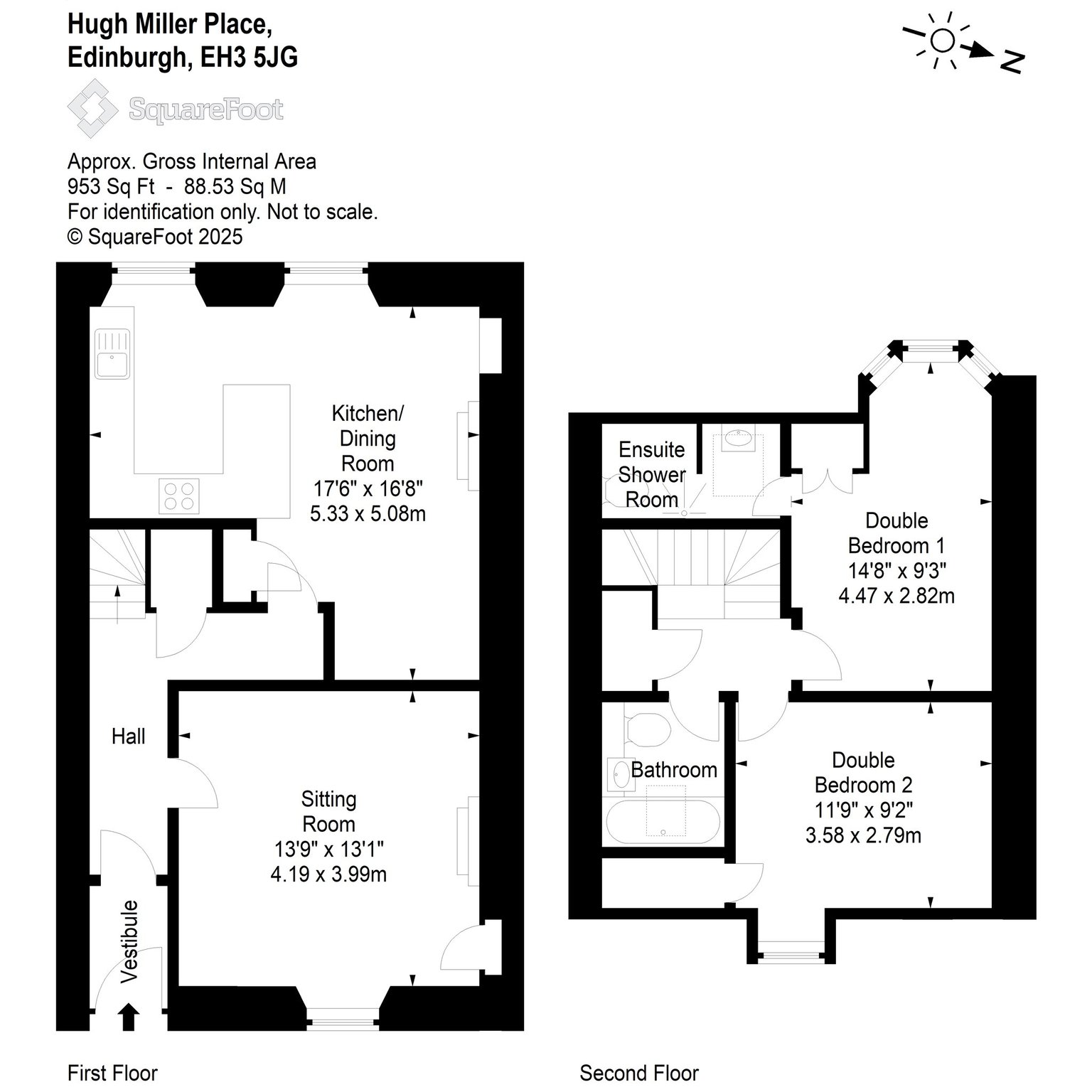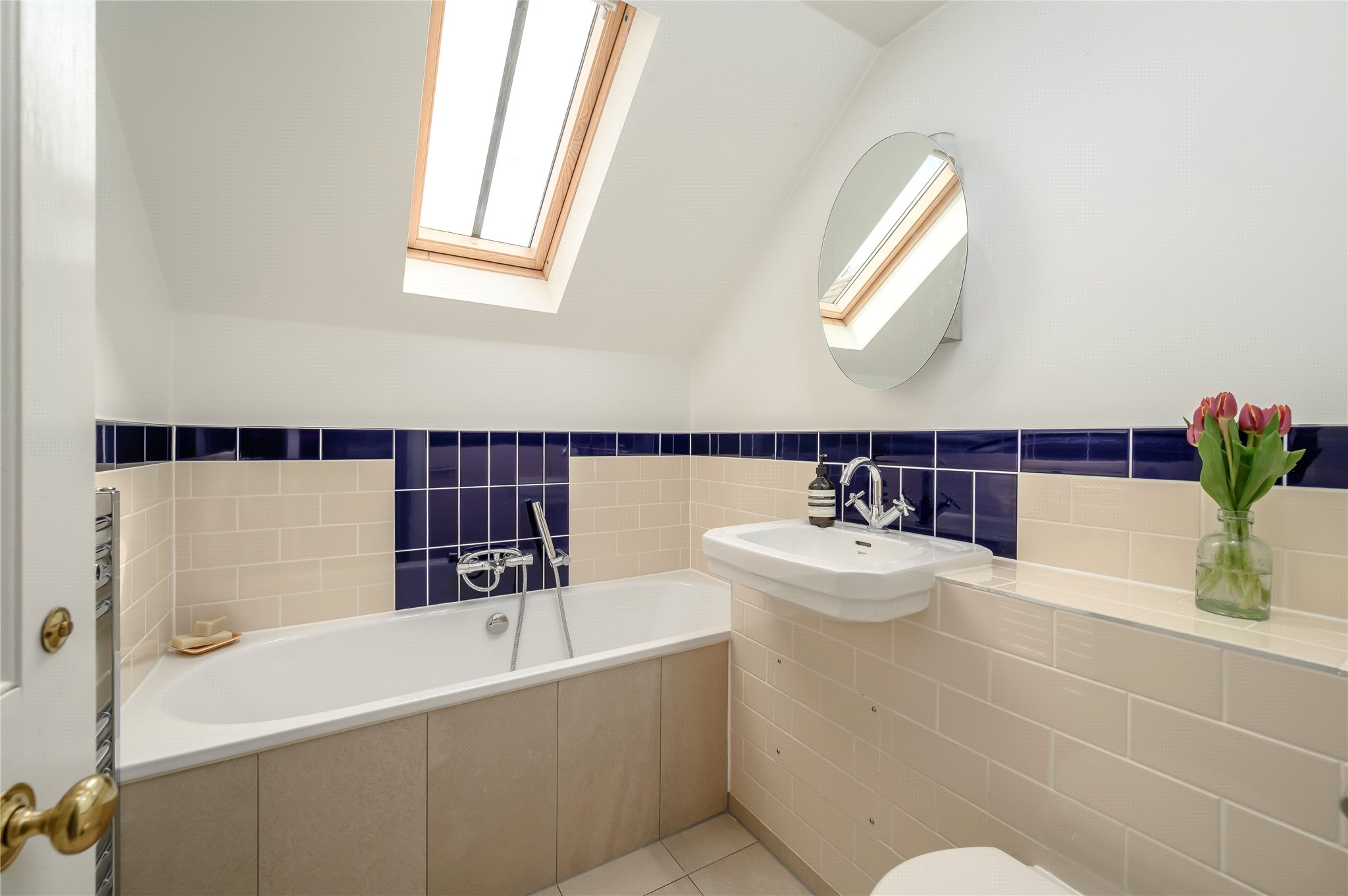 To the rear, the kitchen/dining room serves as the heart of the home, boasting sleek cabinetry, quality integrated appliances, and ample space for a large dining table – ideal for modern open-plan living. This space is perfect for hosting friends or enjoying cosy dinners at home. Upstairs, the second floor features two well-proportioned double bedrooms. The principal bedroom benefits from a charming bay window and a stylish ensuite shower room, while the second double bedroom is served by a modern and spacious family bathroom, complete with a bath and overhead shower.