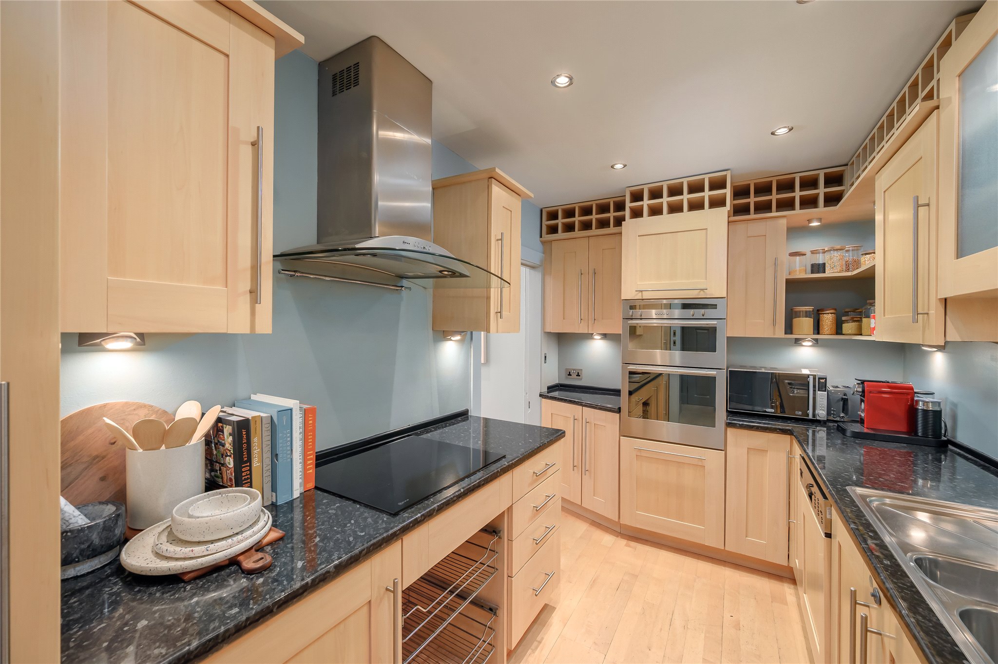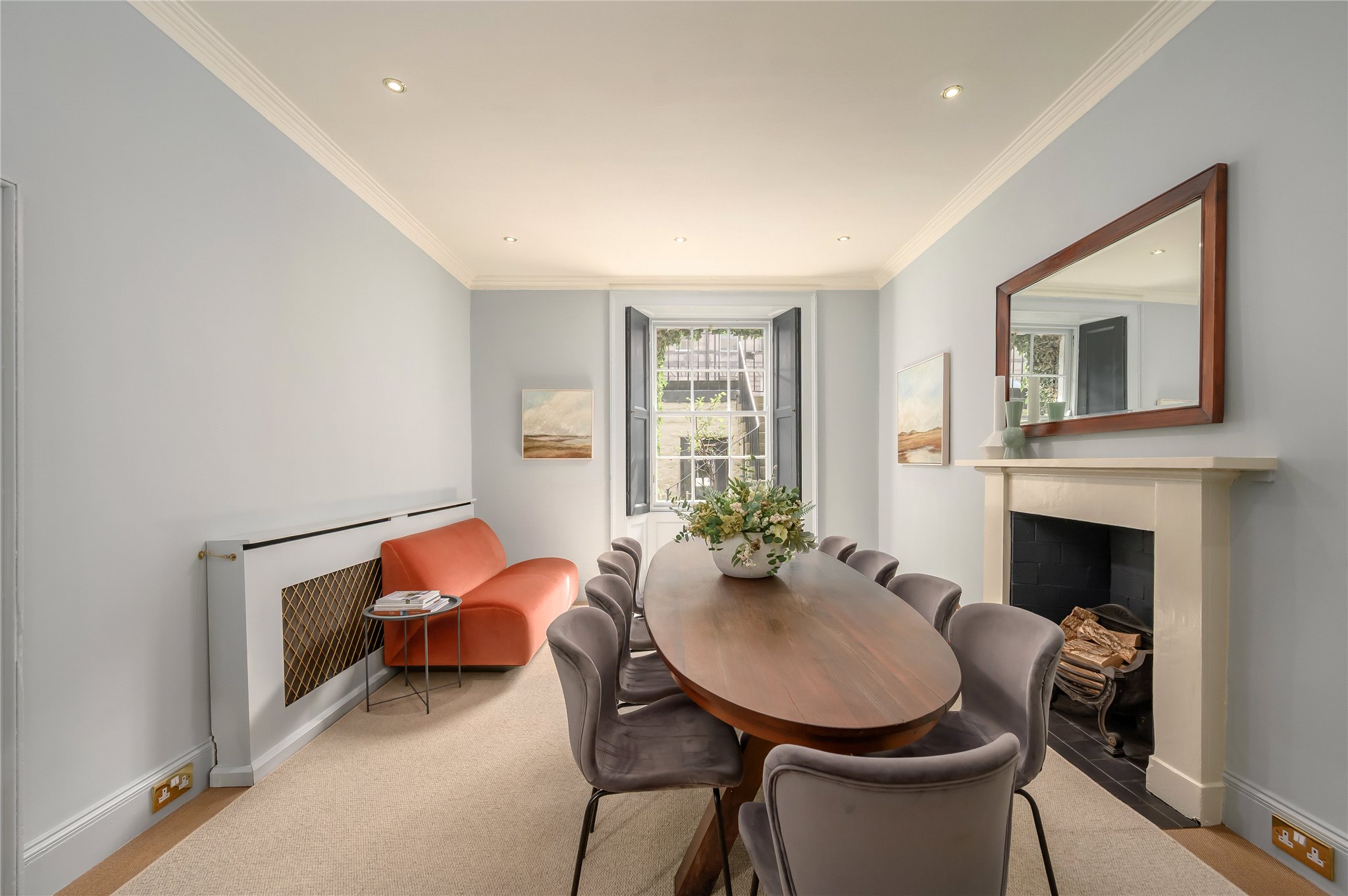 - Elegant dining room with south facing aspect and fireplace, opening to a fitted galley kitchen