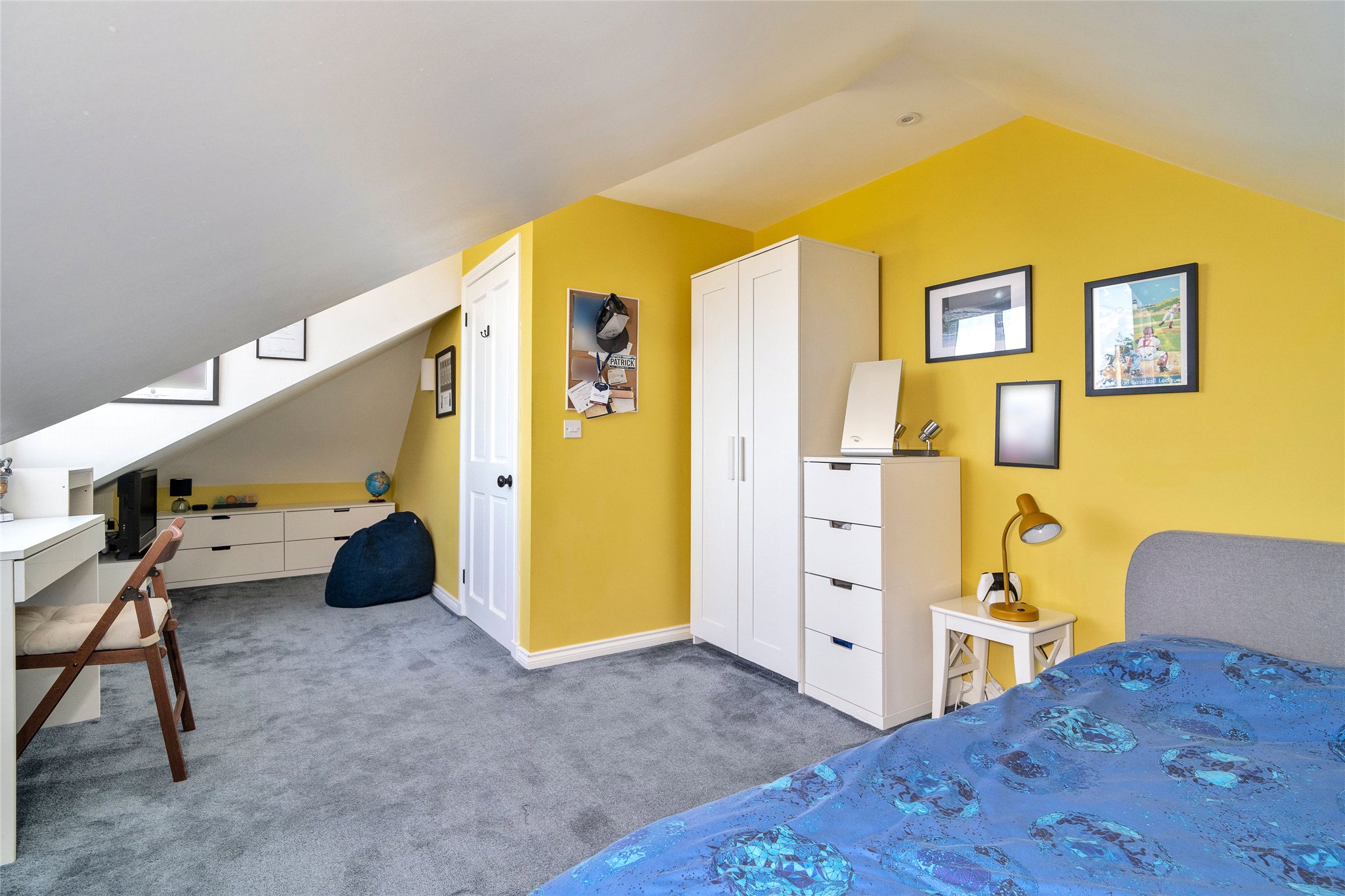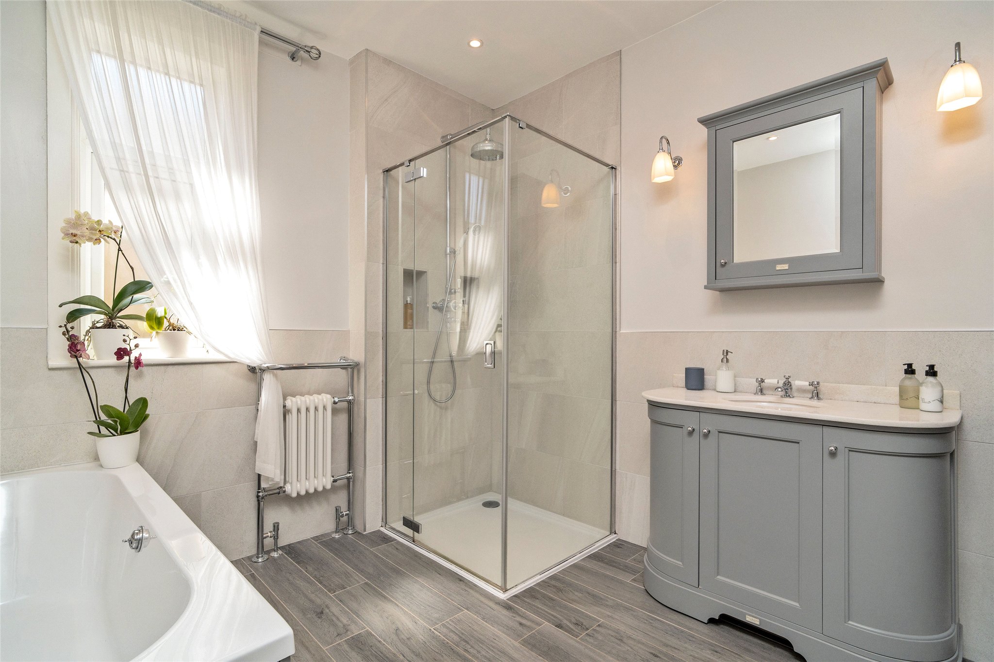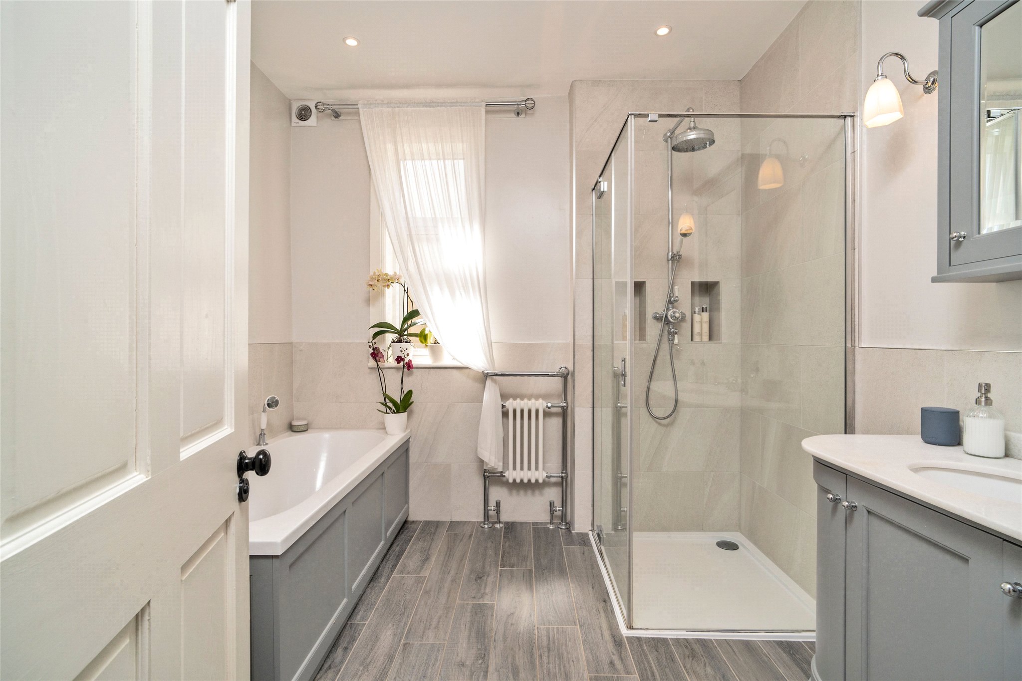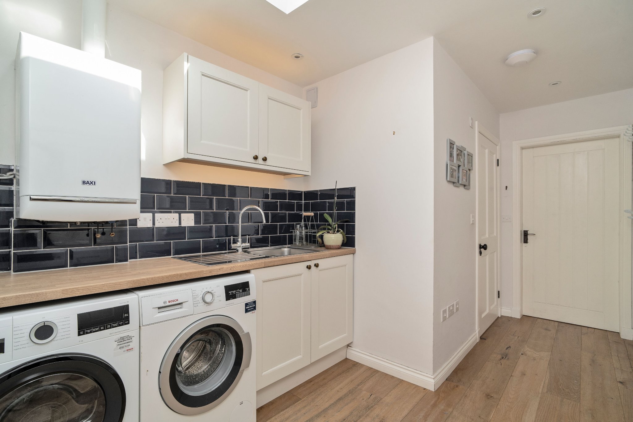 The ground floor also features a bright sitting room and the principal bedroom, which is fitted with bespoke Hammonds wardrobes. A further double bedroom - currently used as a guest room - benefits from fitted IKEA wardrobes. The ground floor is completed by a beautifully finished family bathroom with underfloor heating, a practical utility room with a separate WC, and internal access to the garage.