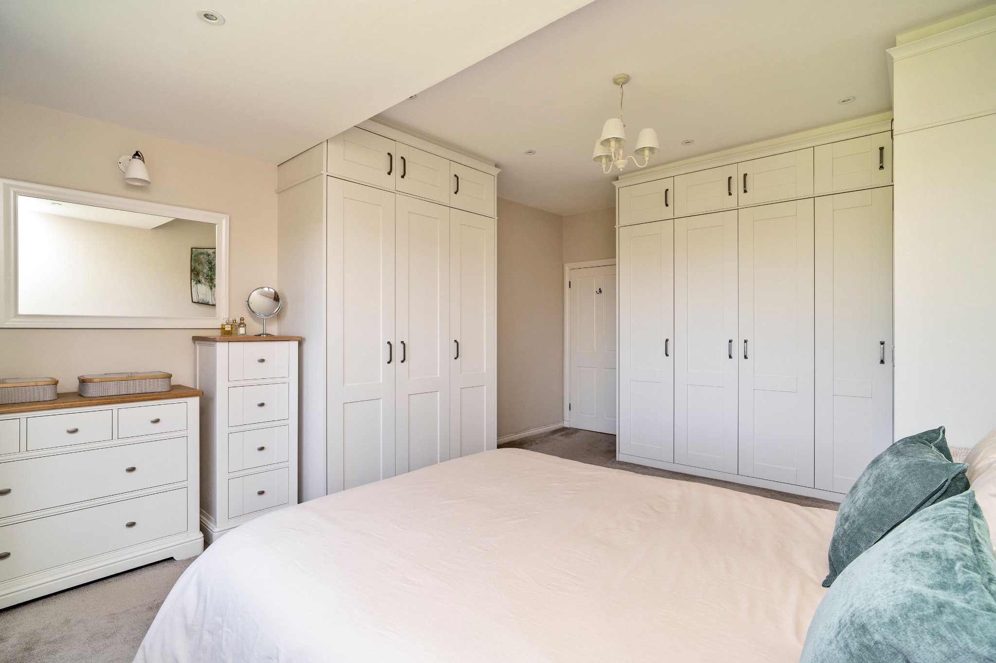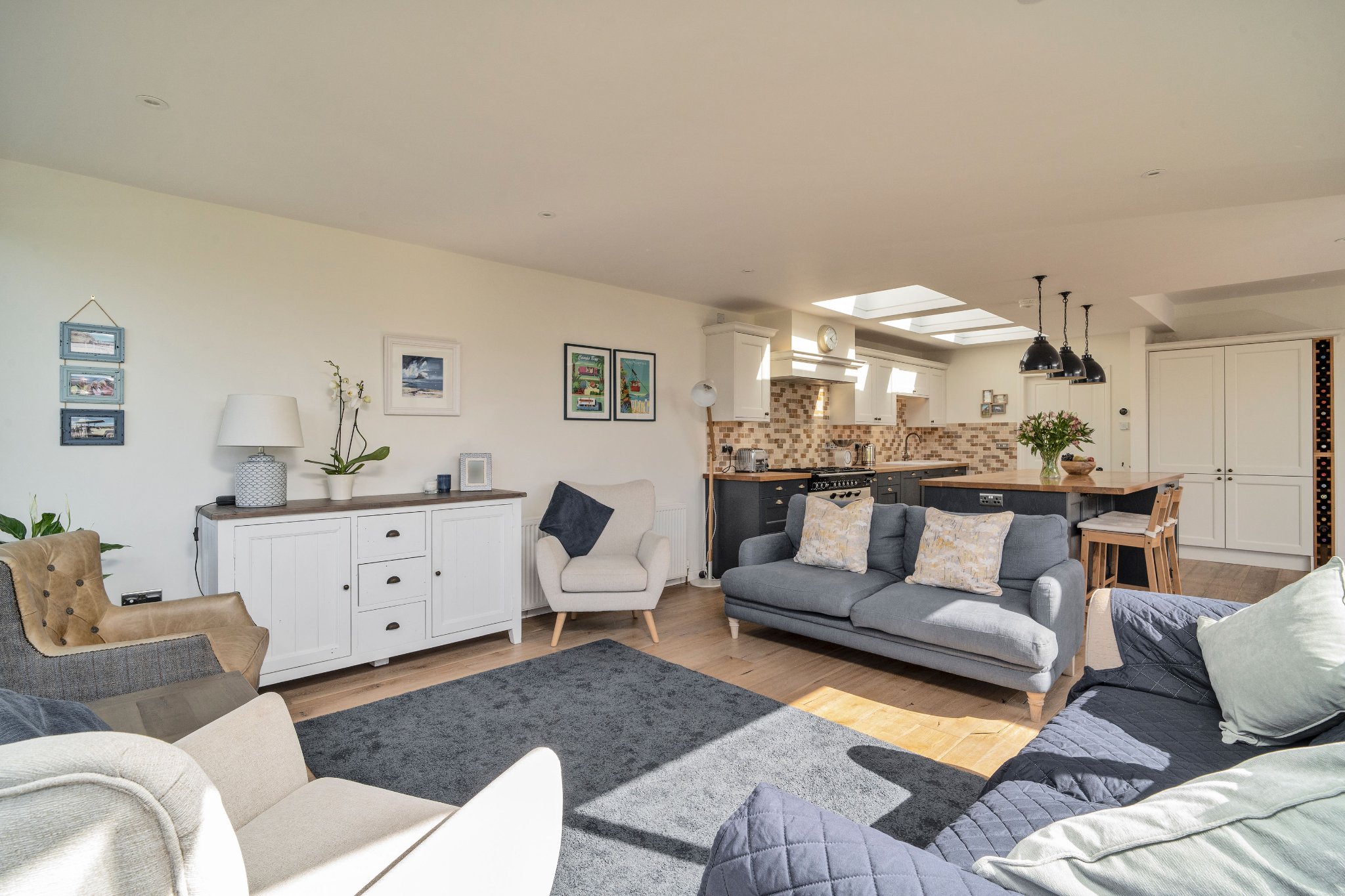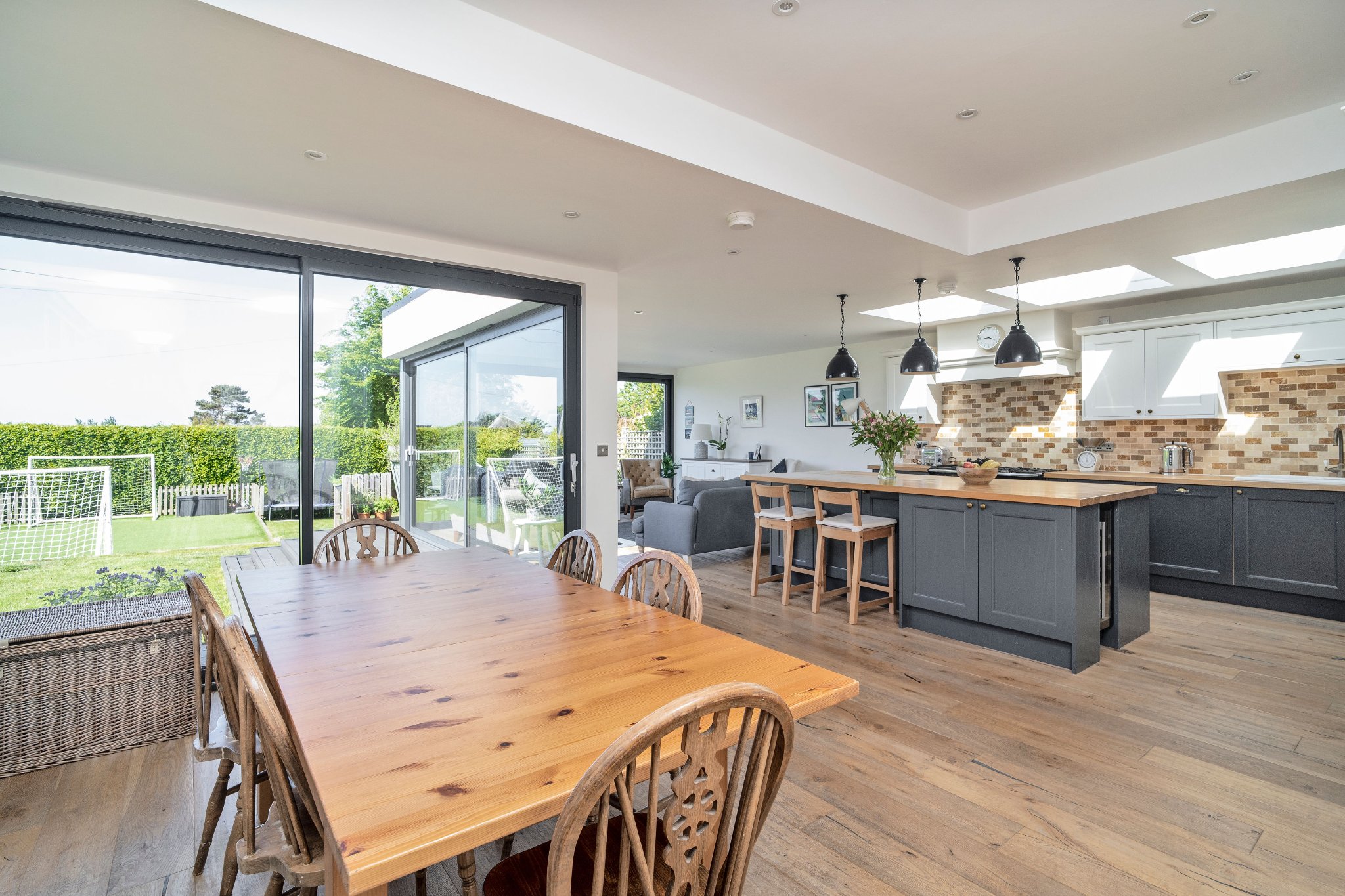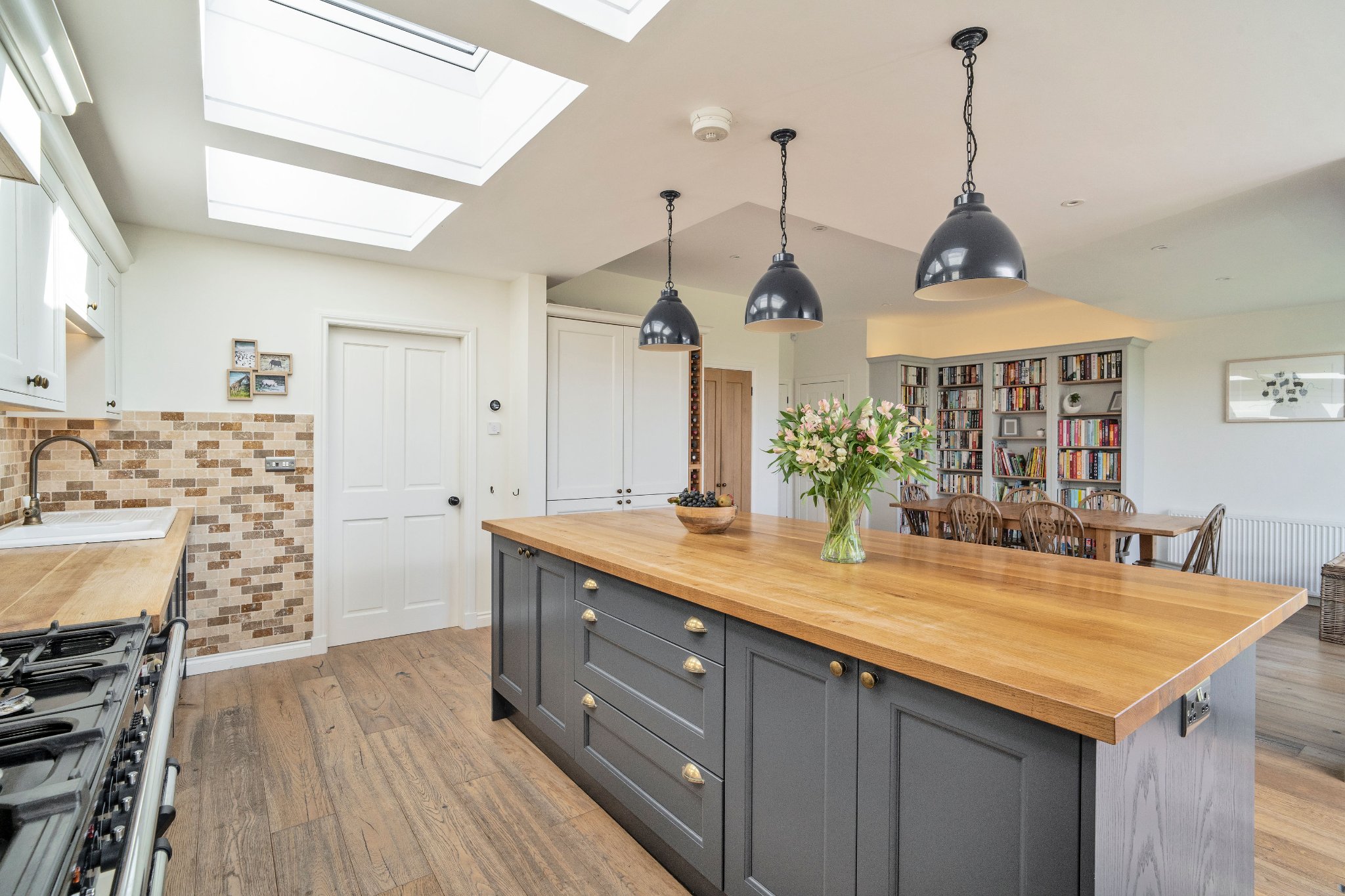 The heart of the home is the impressive open-plan kitchen and dining area, designed for both everyday living and entertaining. The bespoke Mornington range units from Second Nature Kitchens, installed by The Pentland Kitchen Company, feature solid wood doors, veneered centre panels, and full stave solid oak worktops. Premium appliances include a Rangemaster Classic Deluxe 5-ring gas hob with hot plate and double oven, Neff dishwasher and larder fridge, and a CDA wine cooler. A generous walk-in pantry provides excellent storage, while Velux electric roof windows with rain sensors flood the space with natural light. A stylish Neptune Pembroke bookcase with solid oak shelves sits perfectly beside the dining area, creating a warm and elegant focal point.