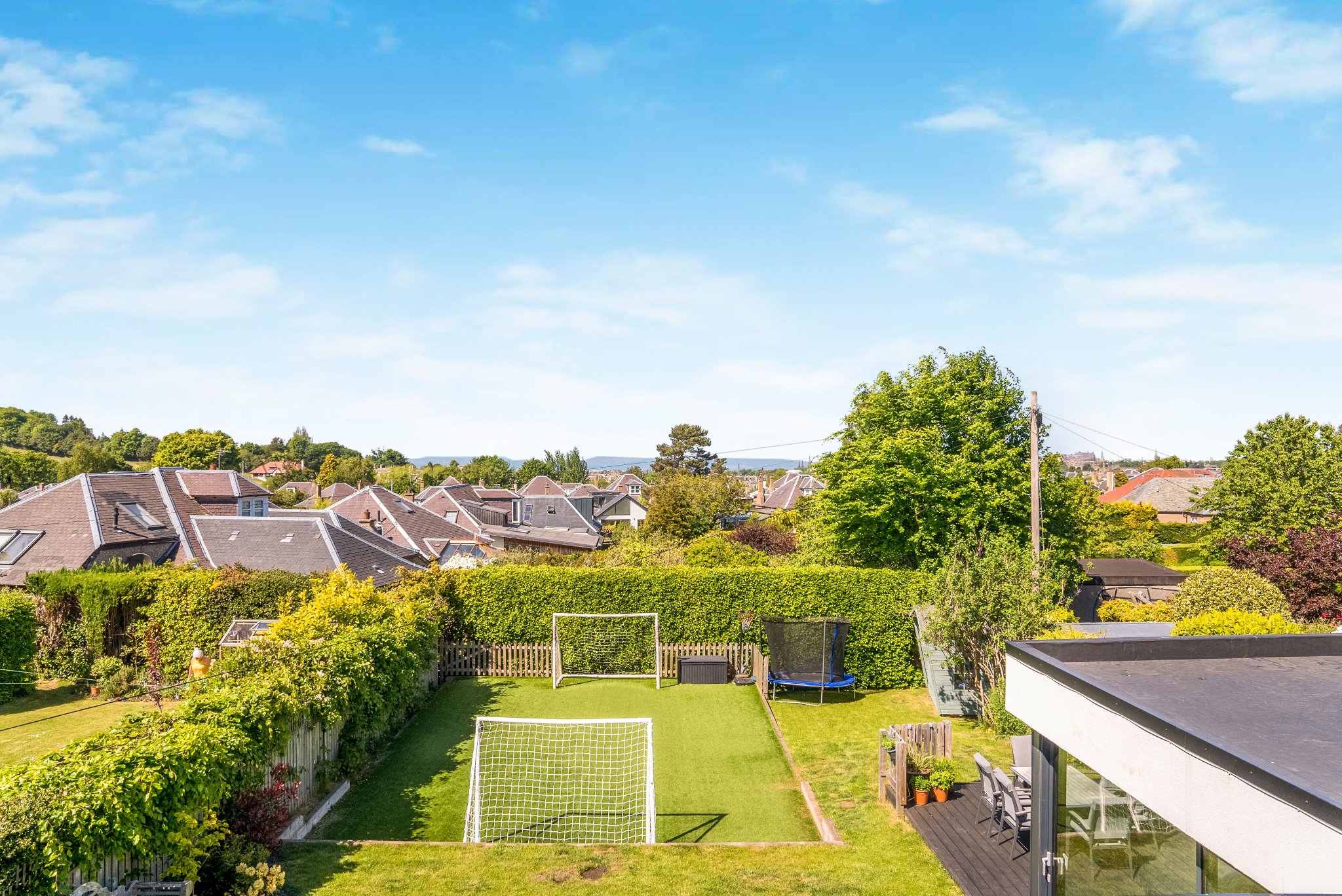 Externally, the property boasts easily maintained front and rear gardens. The front garden is landscaped with a mature rockery beside the driveway, while the secure rear garden features an astro pitch (installed in summer 2021), a small lawn, shrubbery, and a decking area ideal for outdoor entertaining. The summer house and bike shed are included in the sale. Additional outdoor features include an outside tap and power point, and fence lighting to illuminate the astro area.