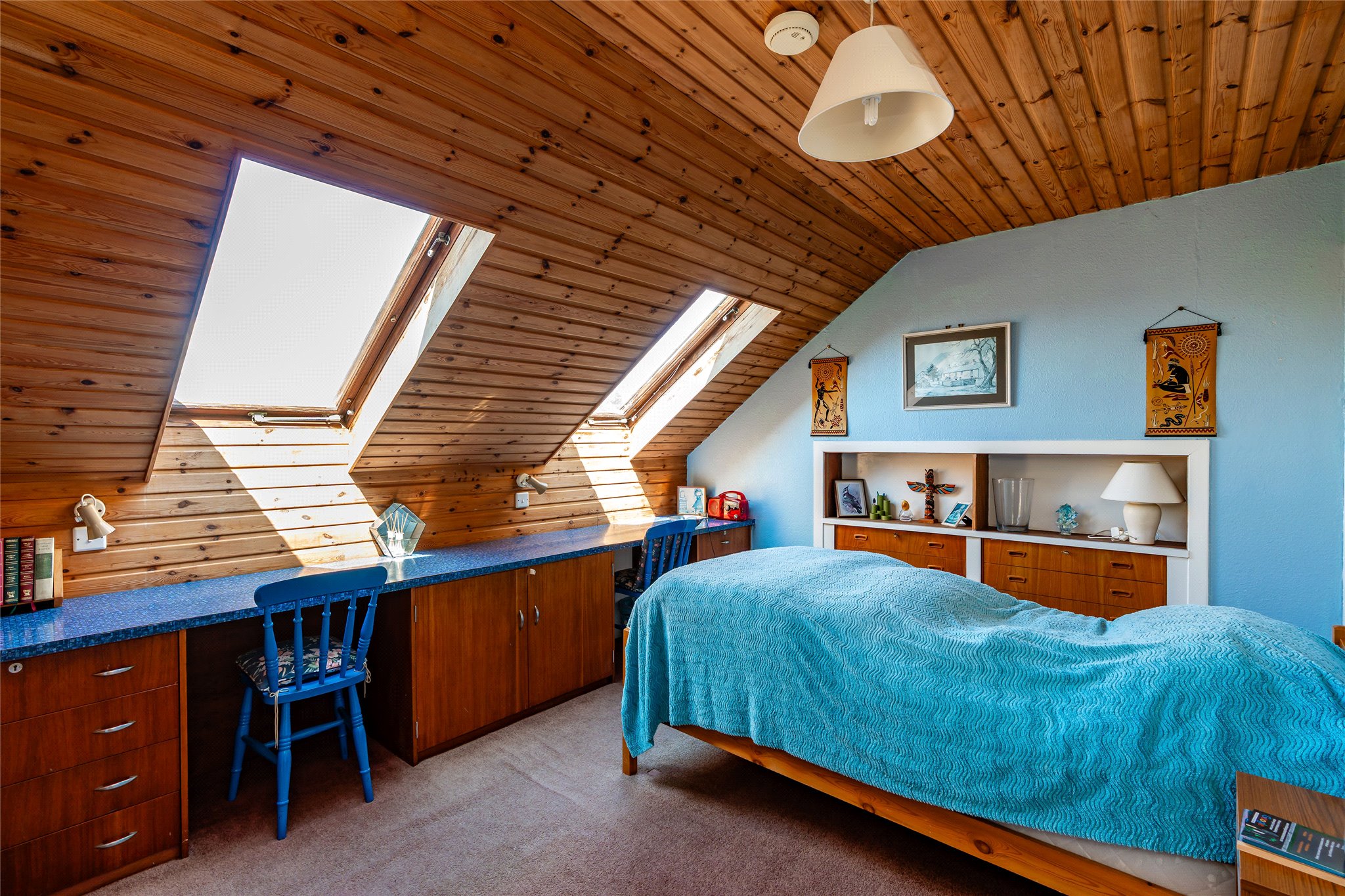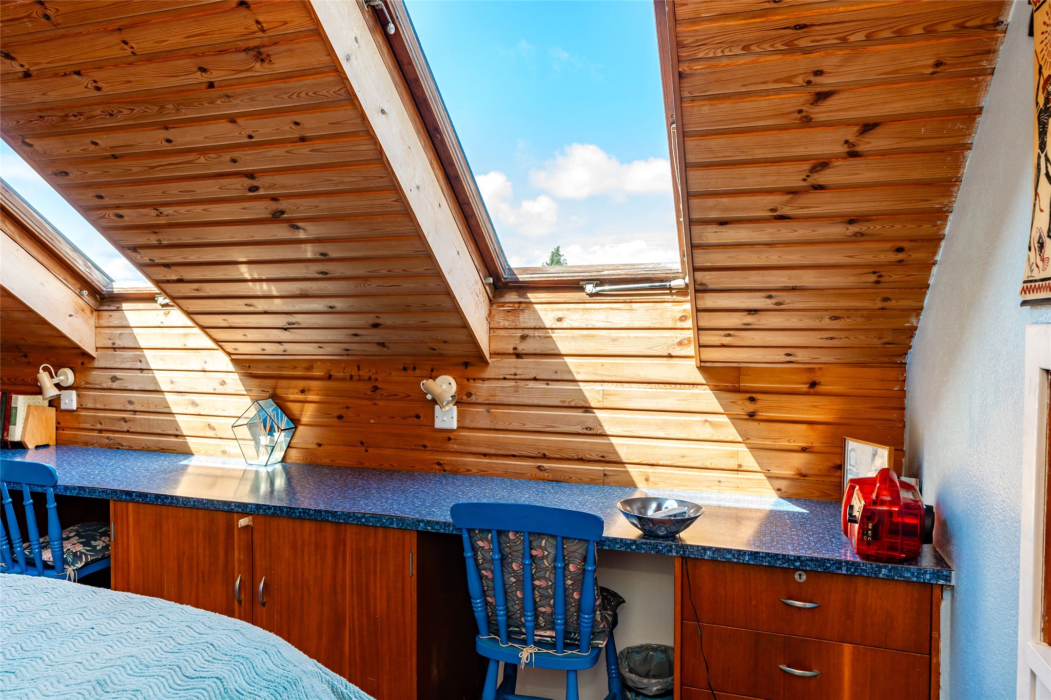 Upstairs, the primary bedroom spans the width of the house and includes dual built-in wardrobes and access to extensive eaves storage.