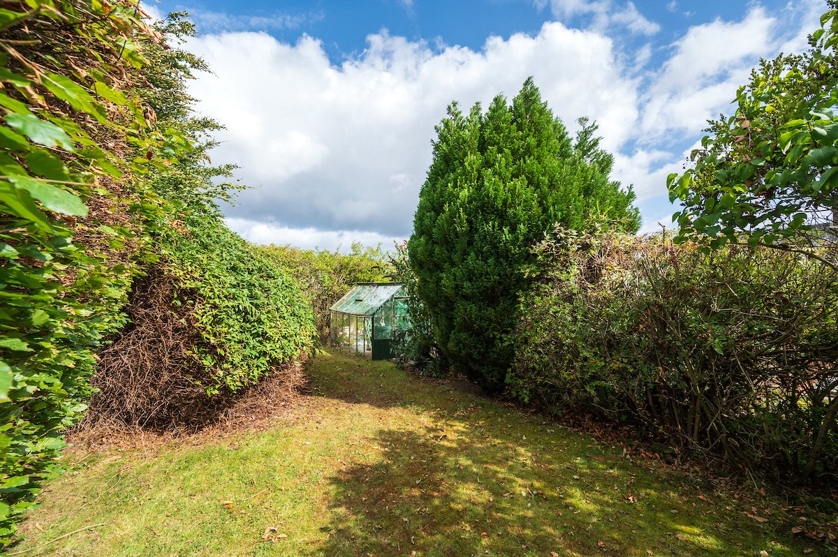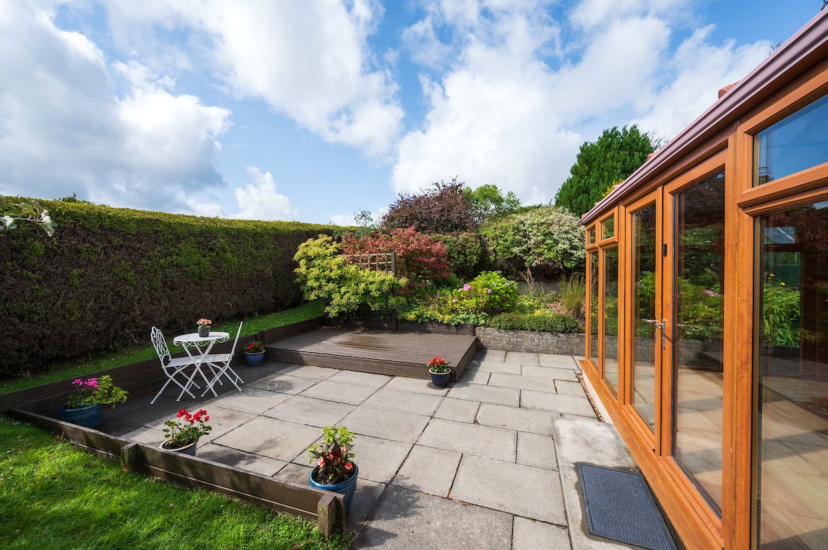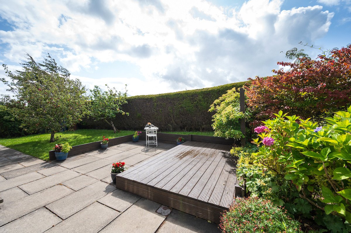 Garden: Mature, colourful garden with a patio/decking area and two areas of lawn to the front and rear surrounded by herbaceous borders.