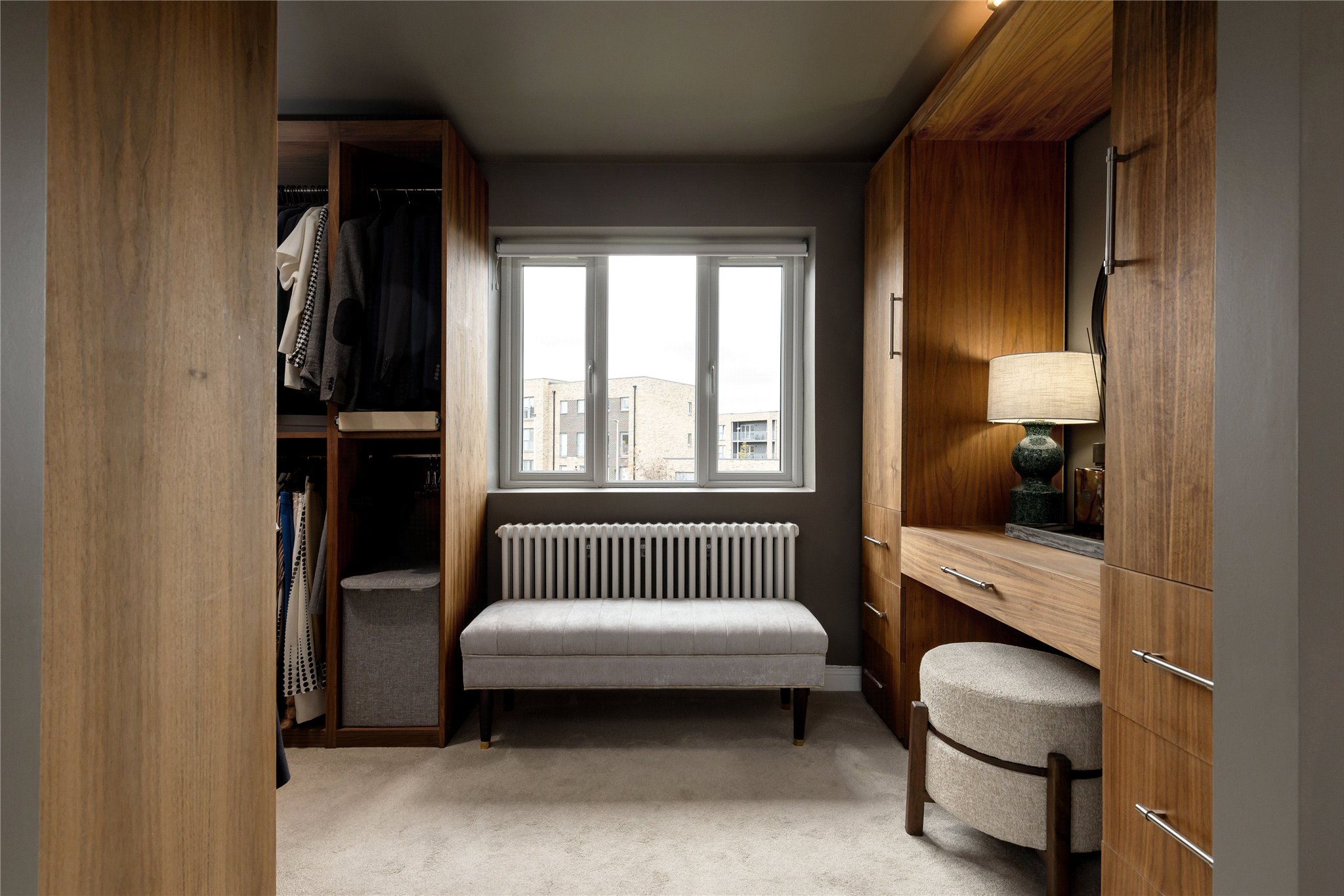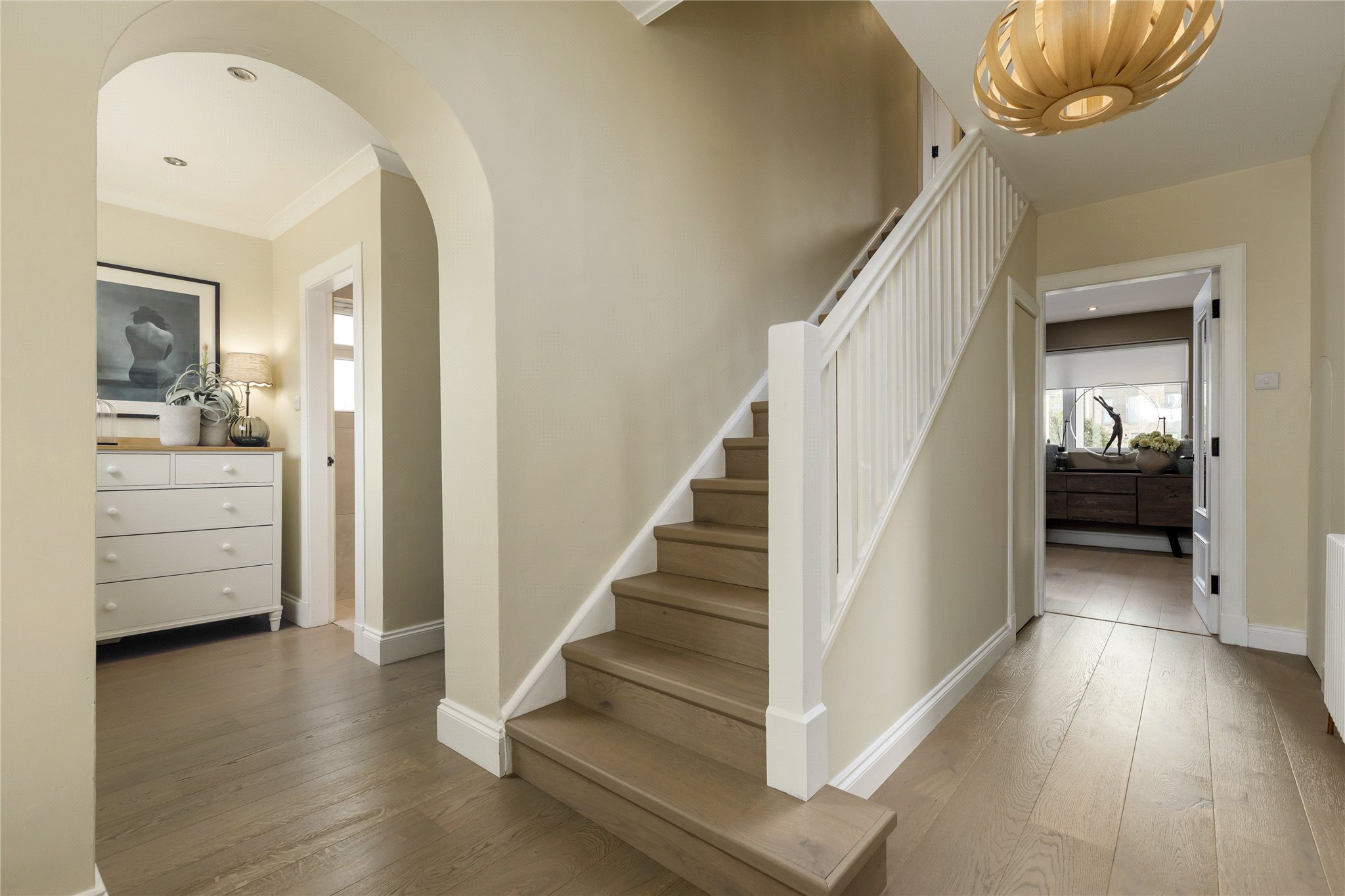 Engineered, water-resistant wood flooring with a soft matt finish graces the principal living spaces, while the bedrooms and upper hallway are fitted with luxury deep-pile carpet. Bespoke carpentry includes fitted wardrobes, a custom dressing area in the principal bedroom, and new internal and external doors with From the Anvil ironmongery.