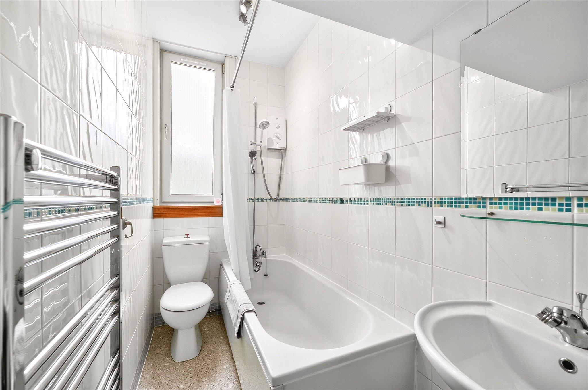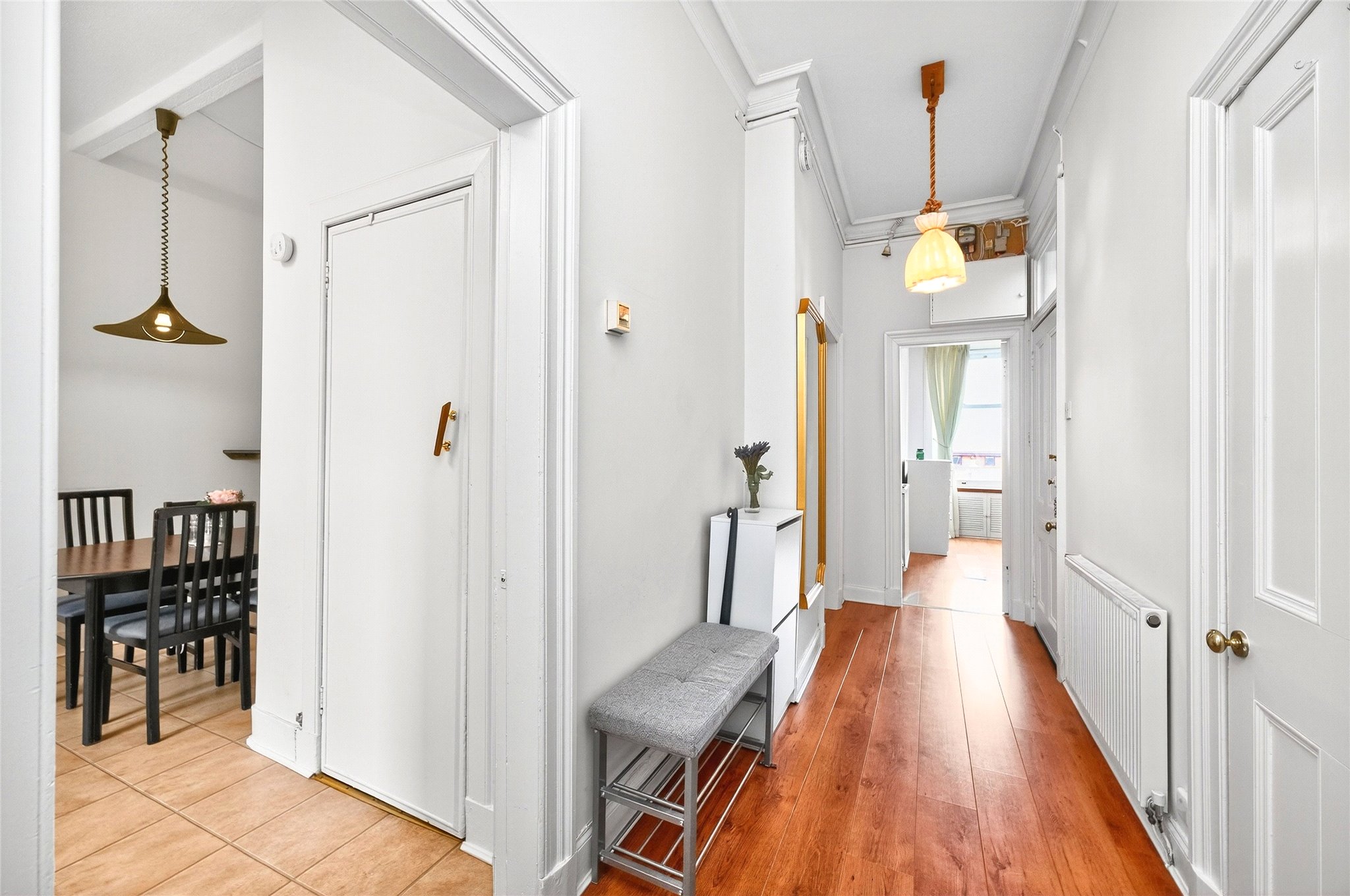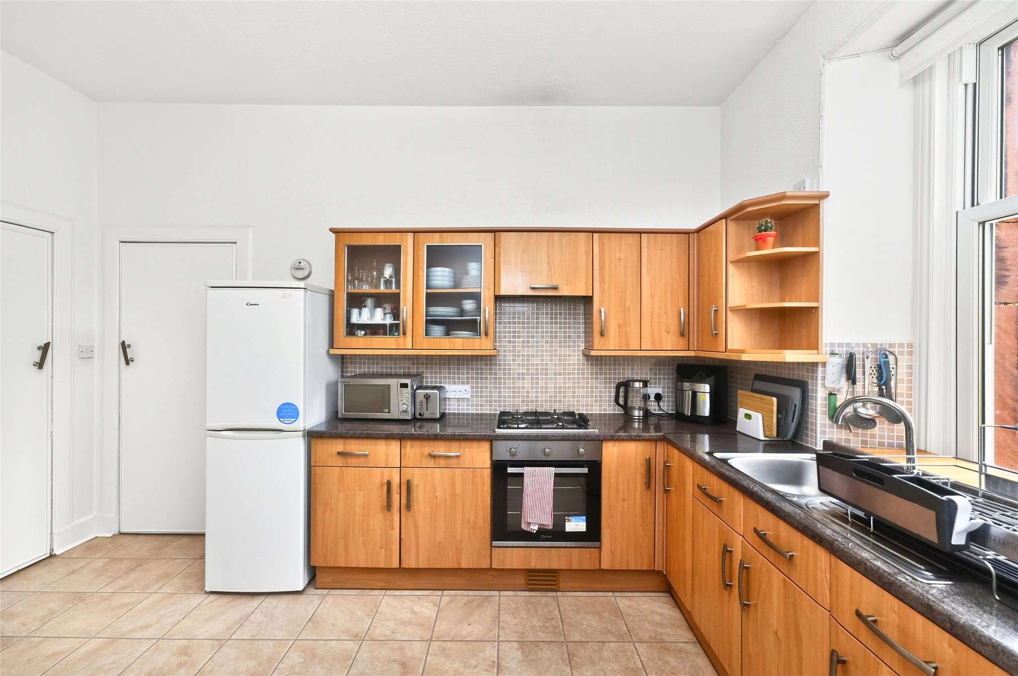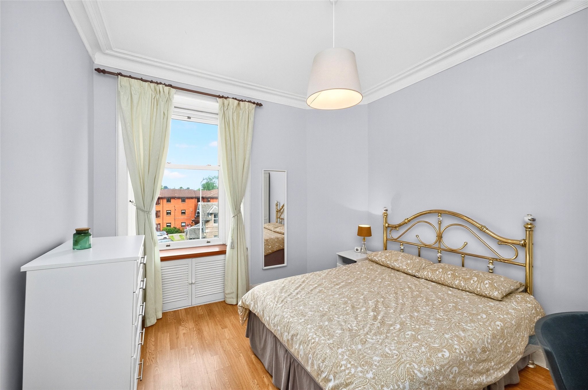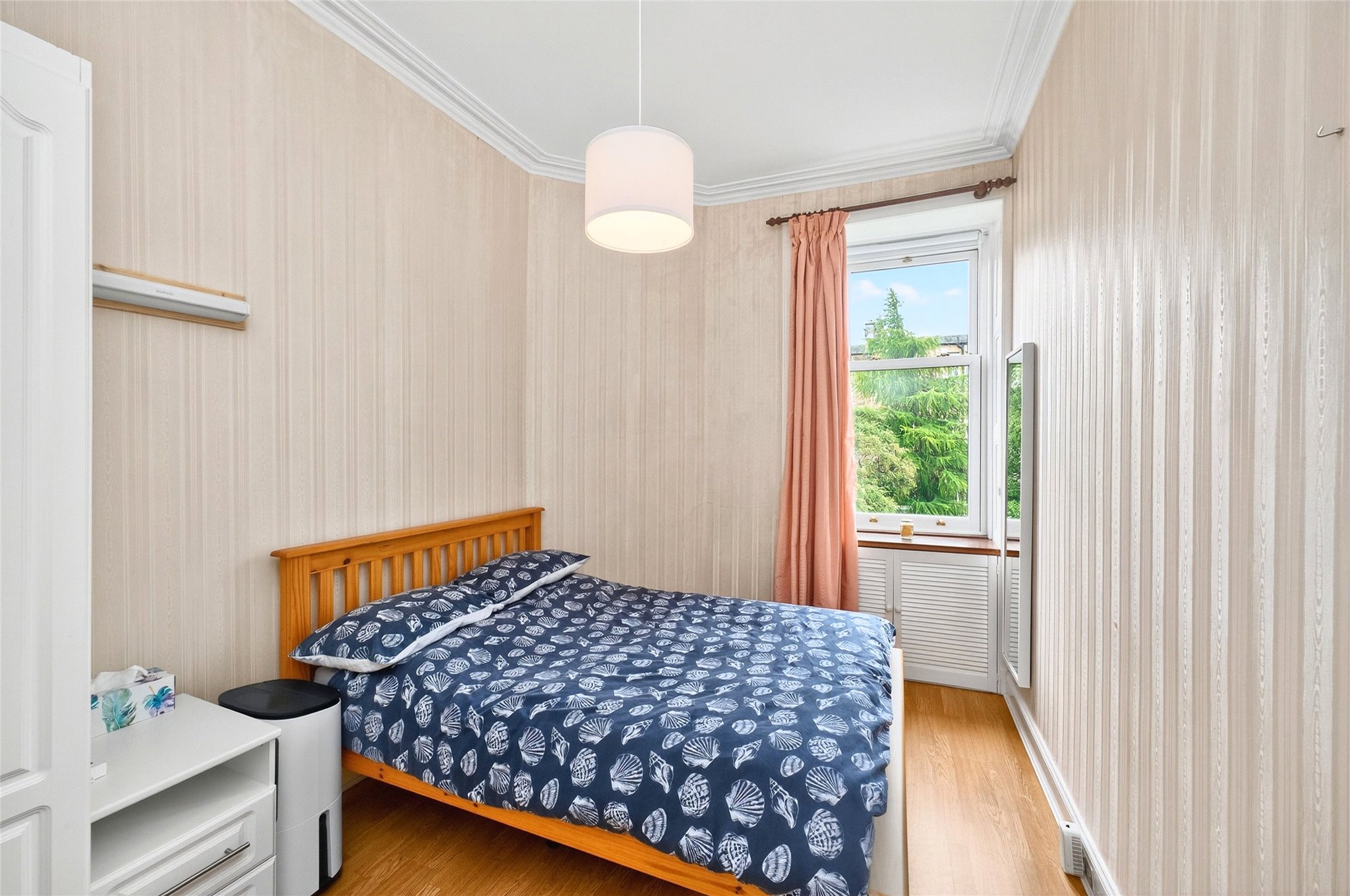 To the front of the property, the principal bedroom offers bright, well-proportions with ample space for freestanding furniture, with the second bedroom to the rear, ideal as a guest room, nursery, or home office, with a quiet rear outlook. Completing the space, a well laid out kitchen, boasting plentiful units, pantry cupboard, generous dining space, and a warm view over the communal garden.