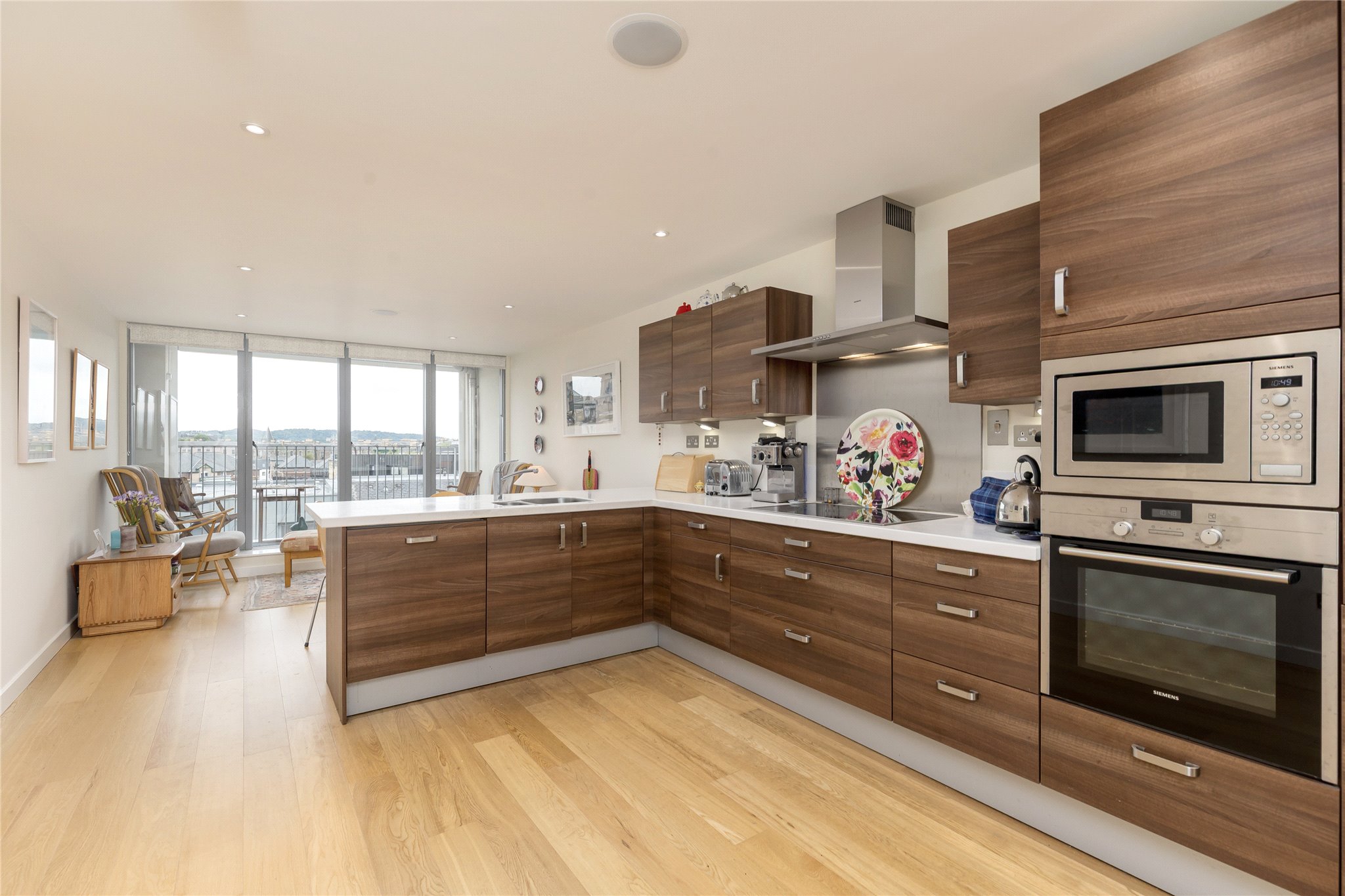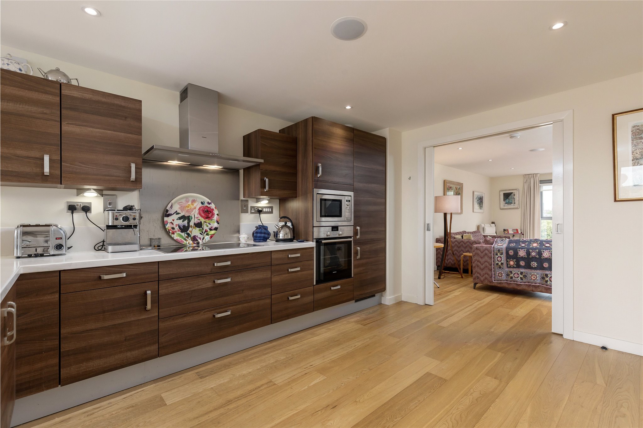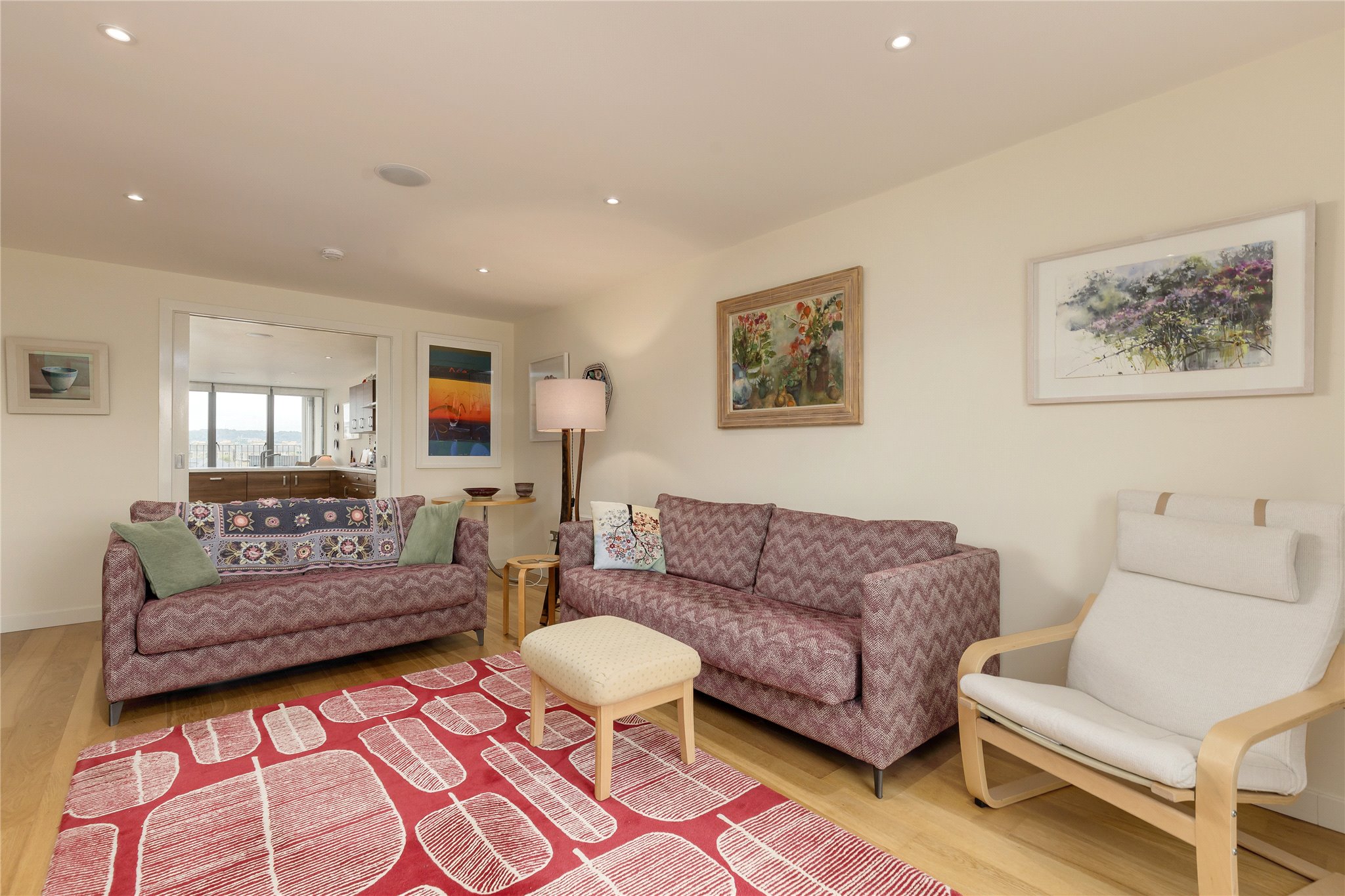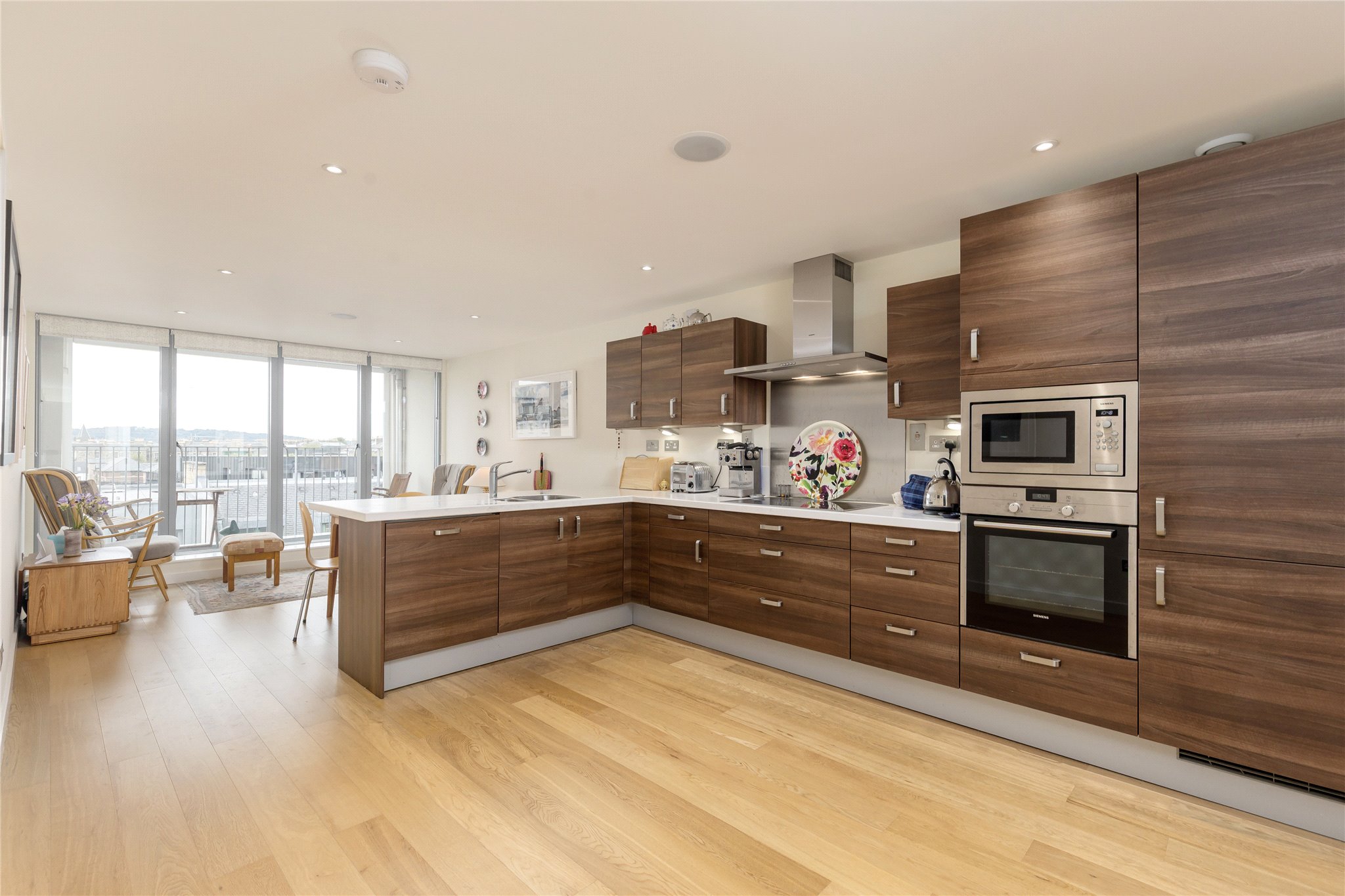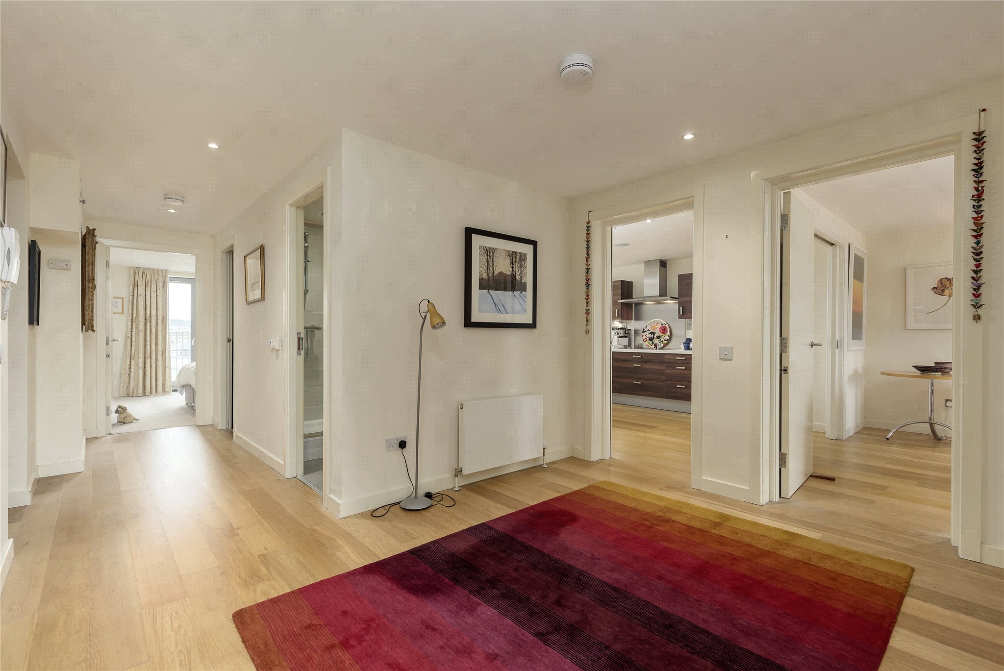 Large hallway, open plan kitchen/ dining room with balcony, leading to sitting room, principal bedroom with ensuite bathroom, two further double bedrooms, shower room and ample storage.
