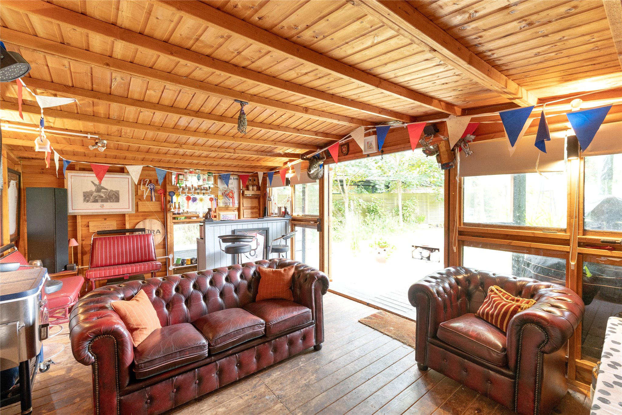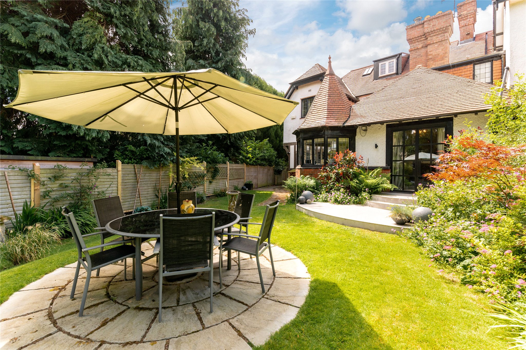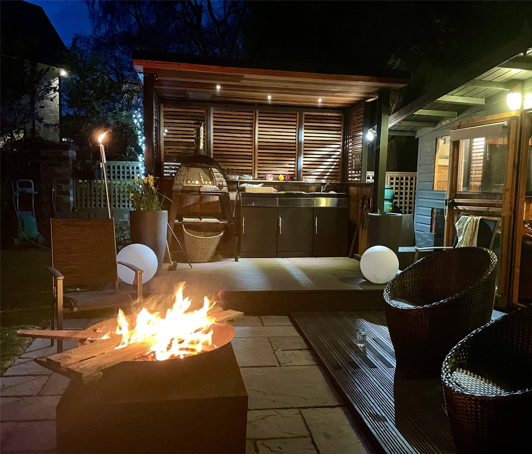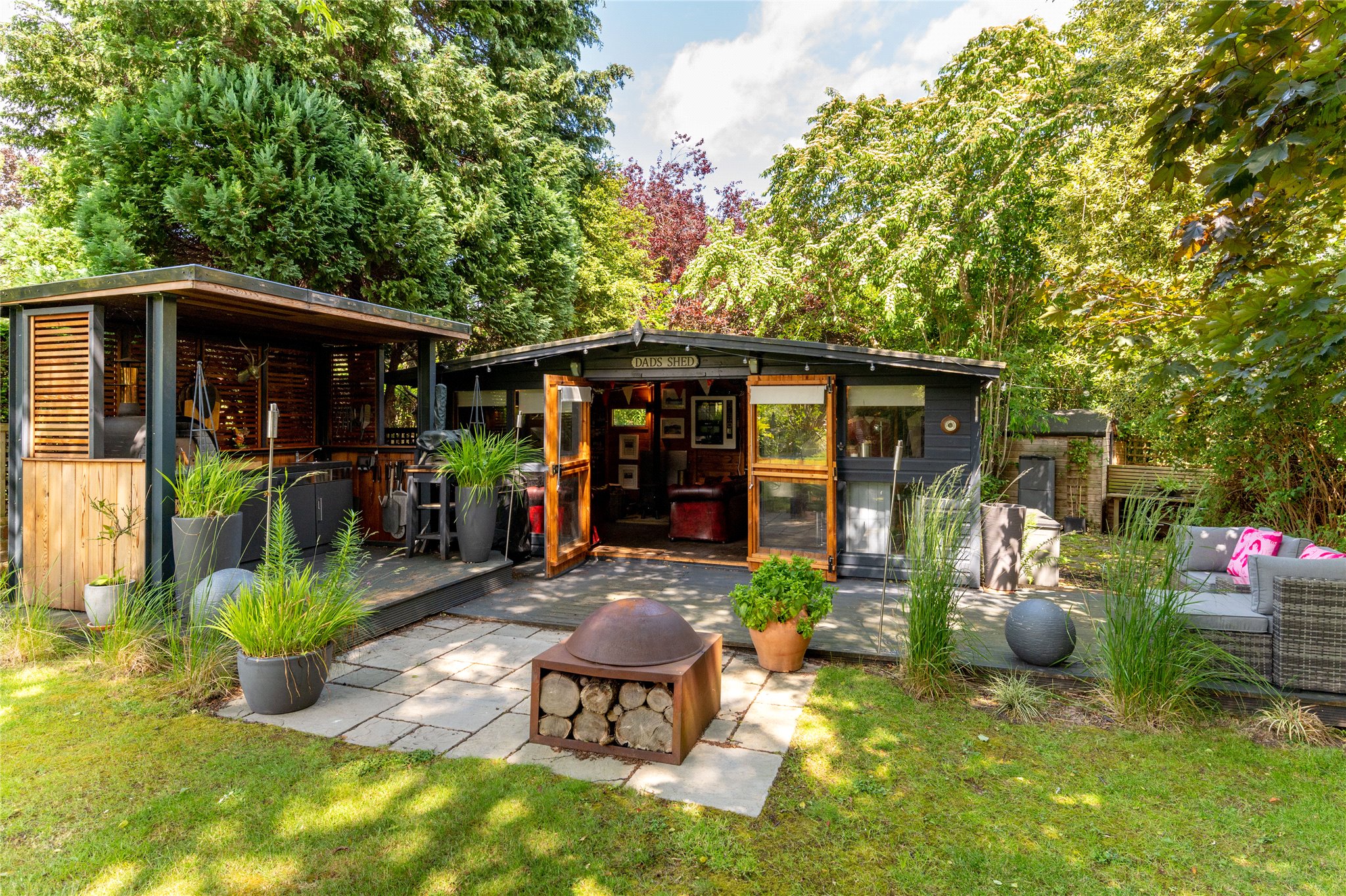 The property enjoys off-road parking for two vehicles, secured by private electric gates, and features an EV charger for convenient electric vehicle charging. To the rear, a beautifully maintained garden offers direct access to a charming summer house and a fully equipped outdoor kitchen, complete with a gas hob, pizza oven, and both hot and cold water taps - perfect for alfresco dining and social gatherings. In addition, there are four useful garden sheds, ideal for storage. The garden and surrounding greenery create a peaceful retreat in a highly sought-after residential location.