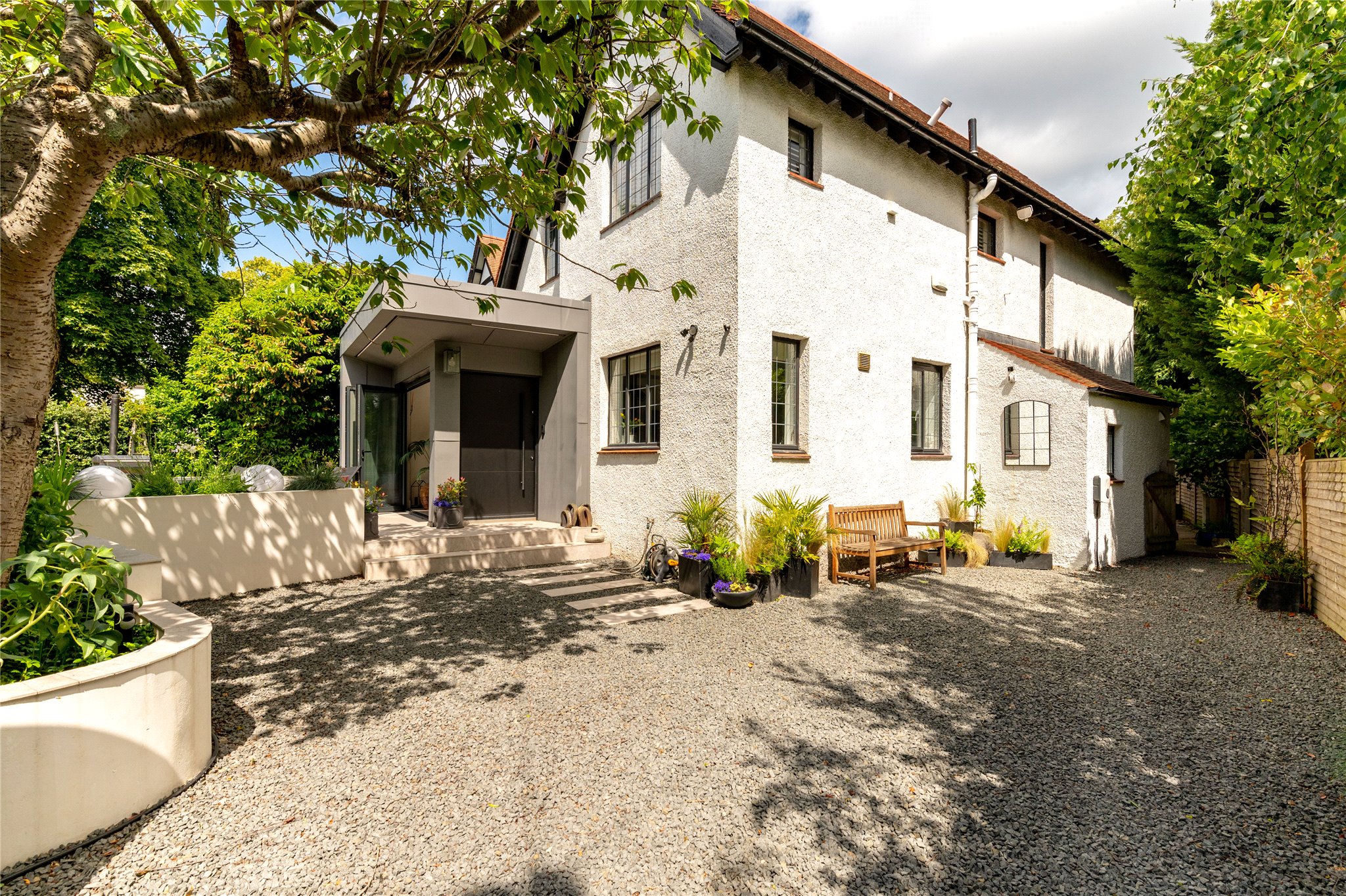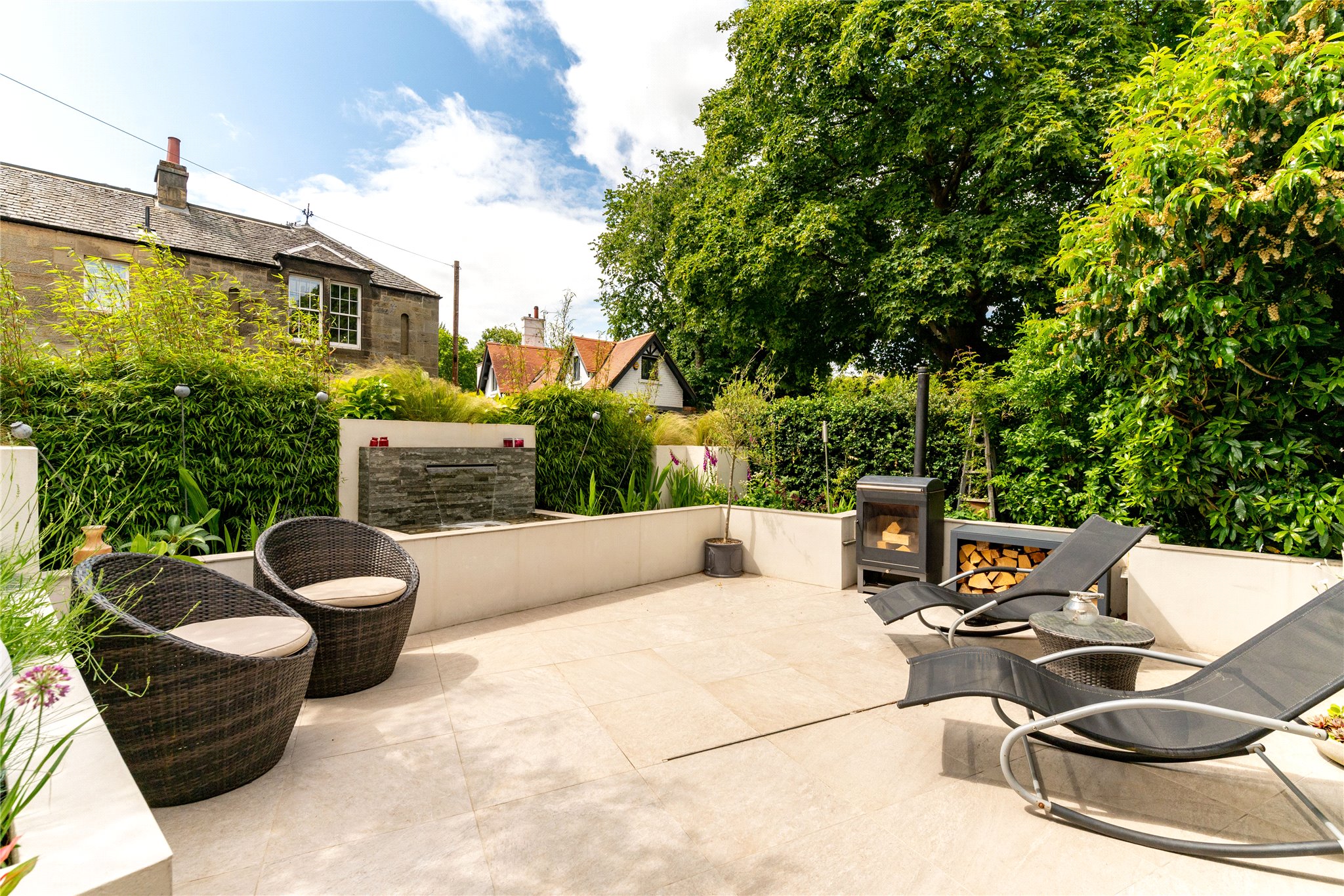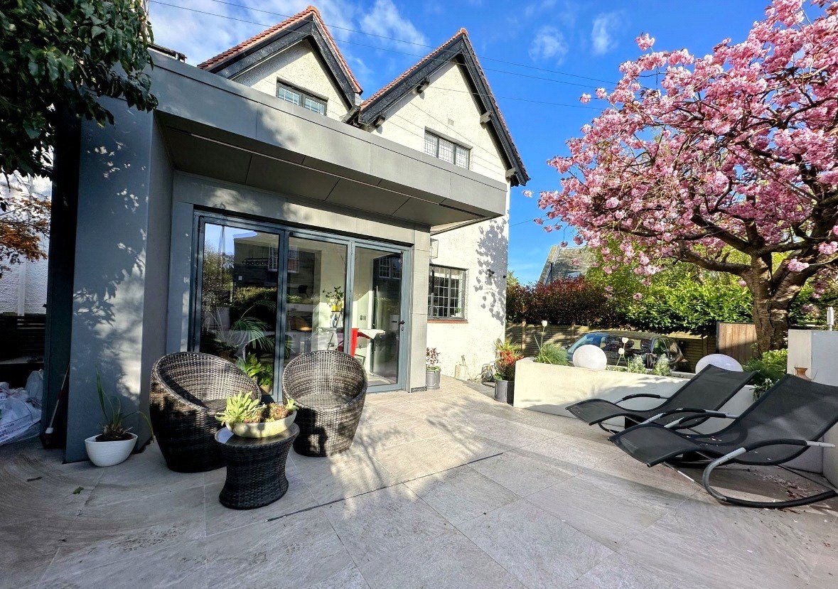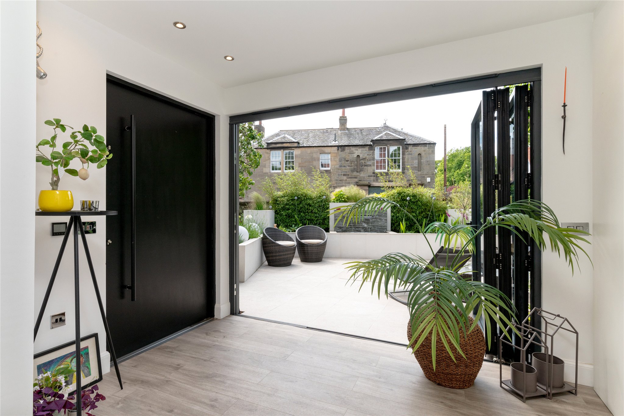 Contemporary Entrance and Sun Terrace: A stylish extension provides a bright open-plan vestibule leading directly onto a magnificent sun terrace complete with a tranquil water feature, perfect for relaxing or entertaining.
