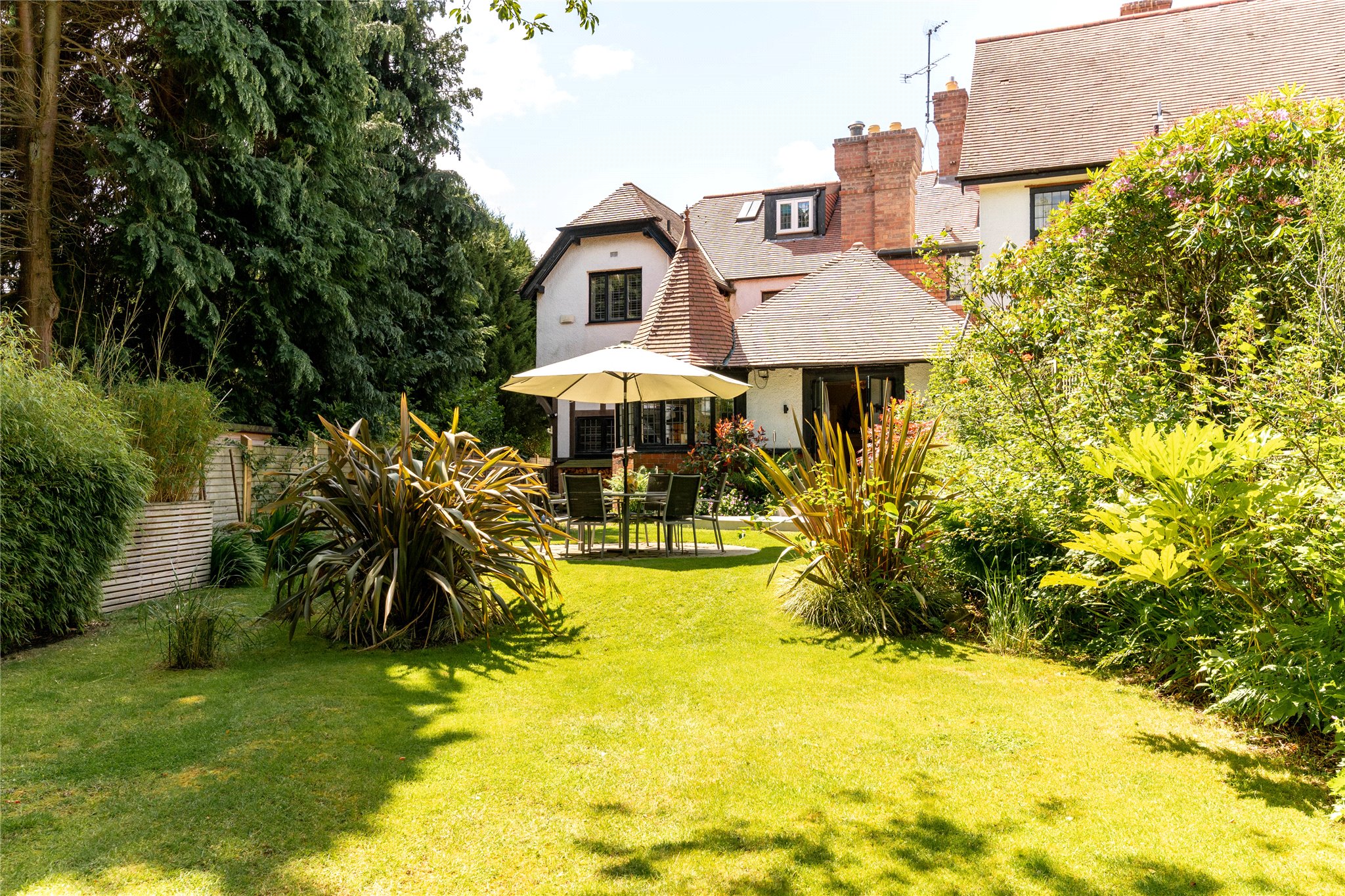 The property is a Category C listed building, designed by architects Cooper & Taylor, and boasts signature Arts and Crafts features including half-timbered detailing, leaded casement windows, and an ornate terrace elevation.