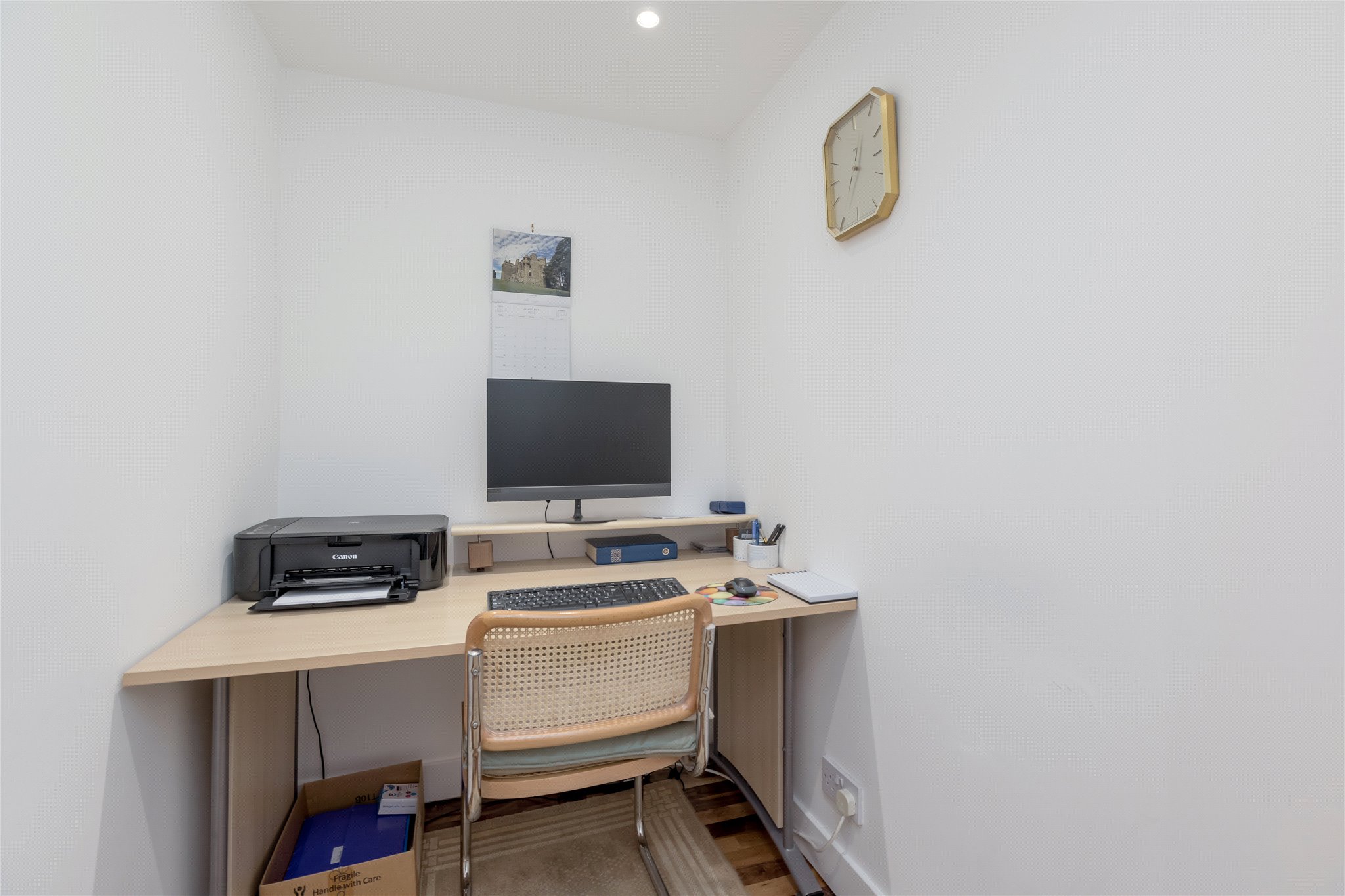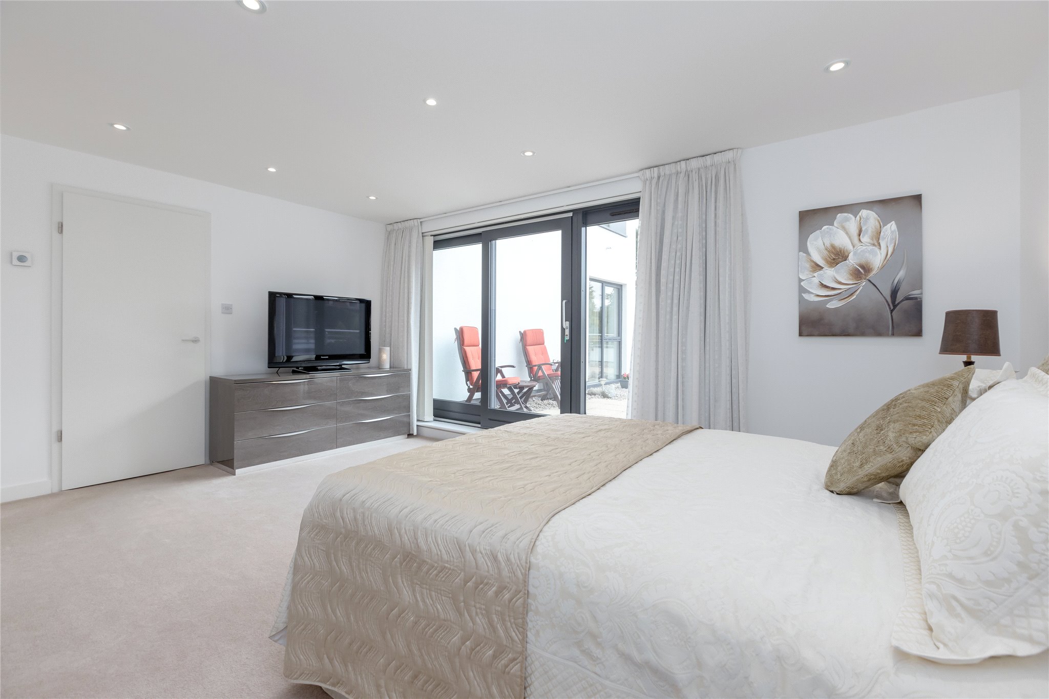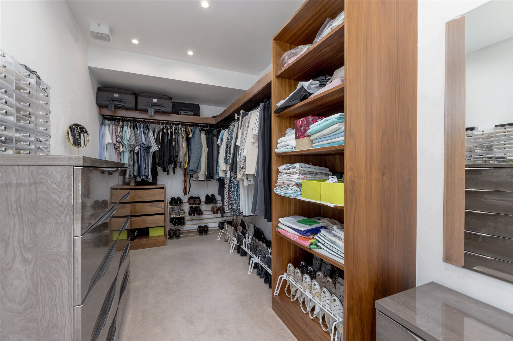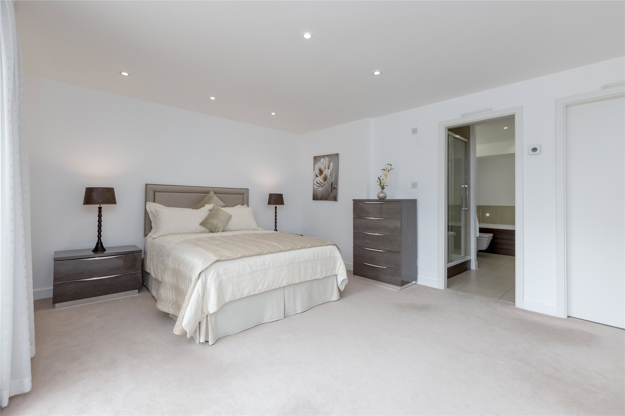 The well-proportioned dining room connects seamlessly to a modern fitted kitchen, thoughtfully designed with ample storage and preparation space. The principal bedroom is a luxurious sanctuary, complete with a spacious dressing room and a stylish ensuite bathroom, while the second double bedroom benefits from its own ensuite shower room. A separate study offers a quiet and comfortable working environment, complemented by a guest WC, utility room, and plentiful built-in storage.