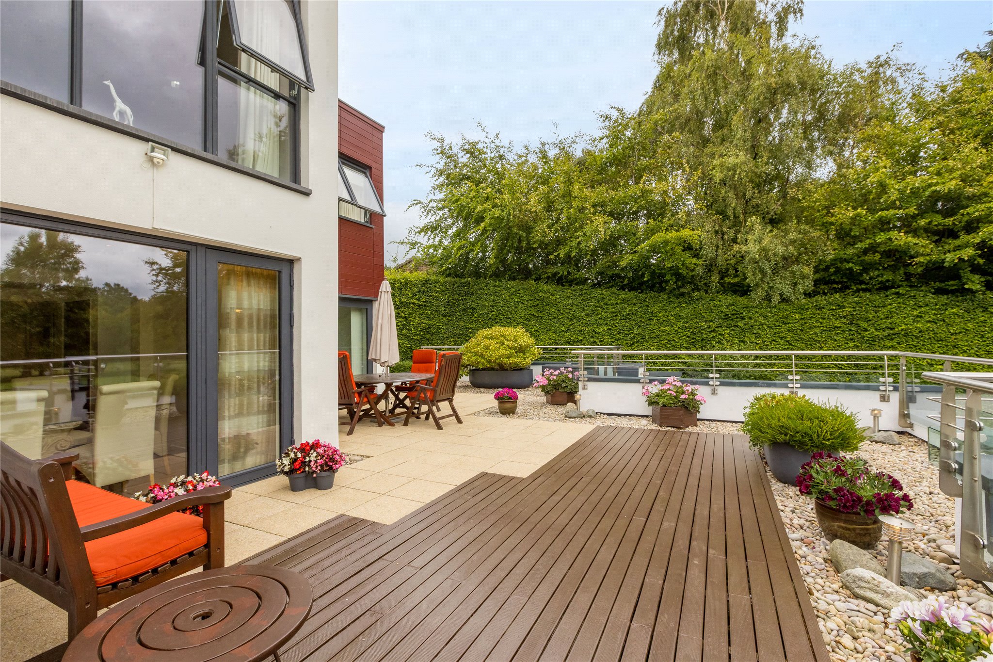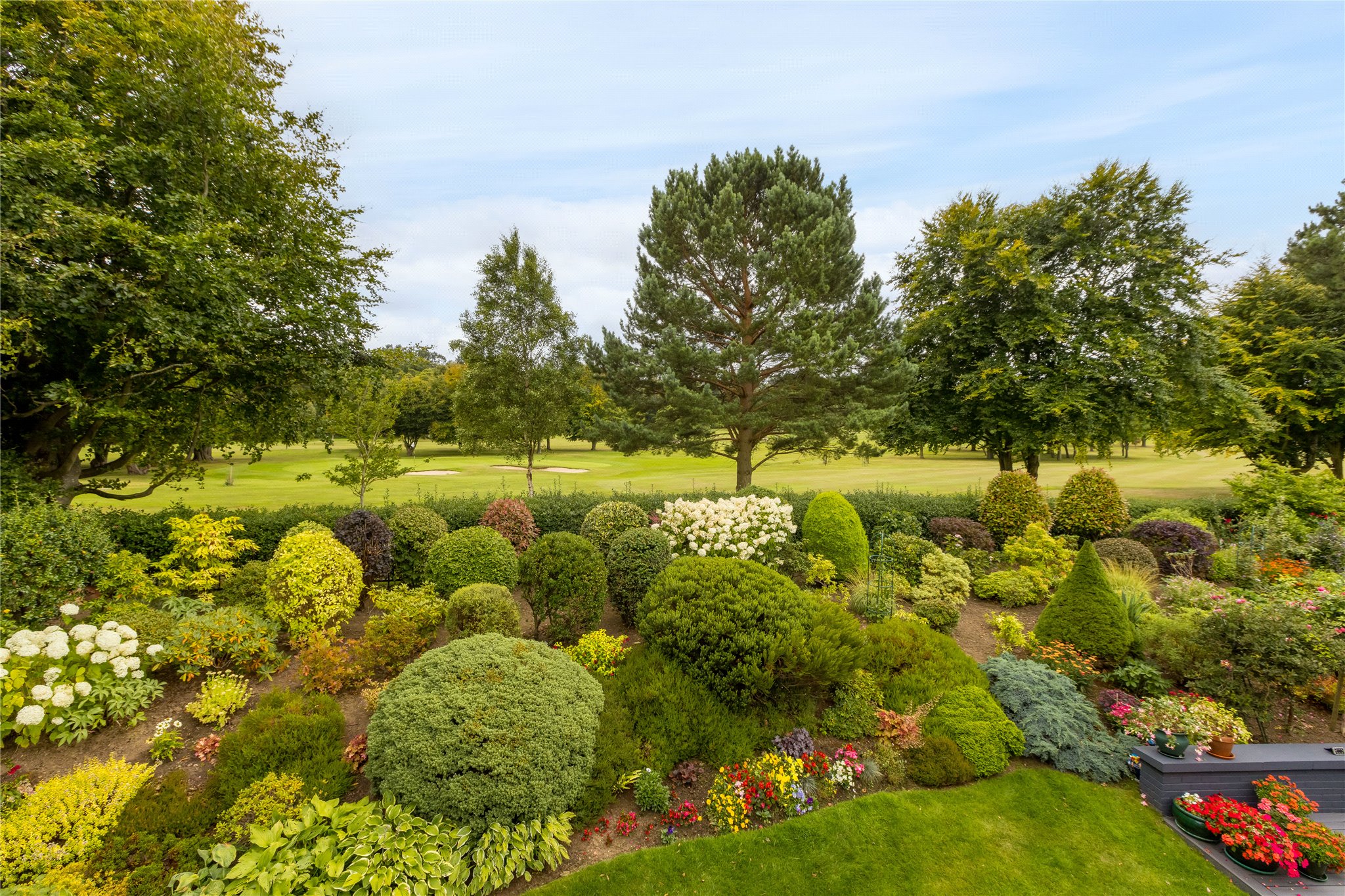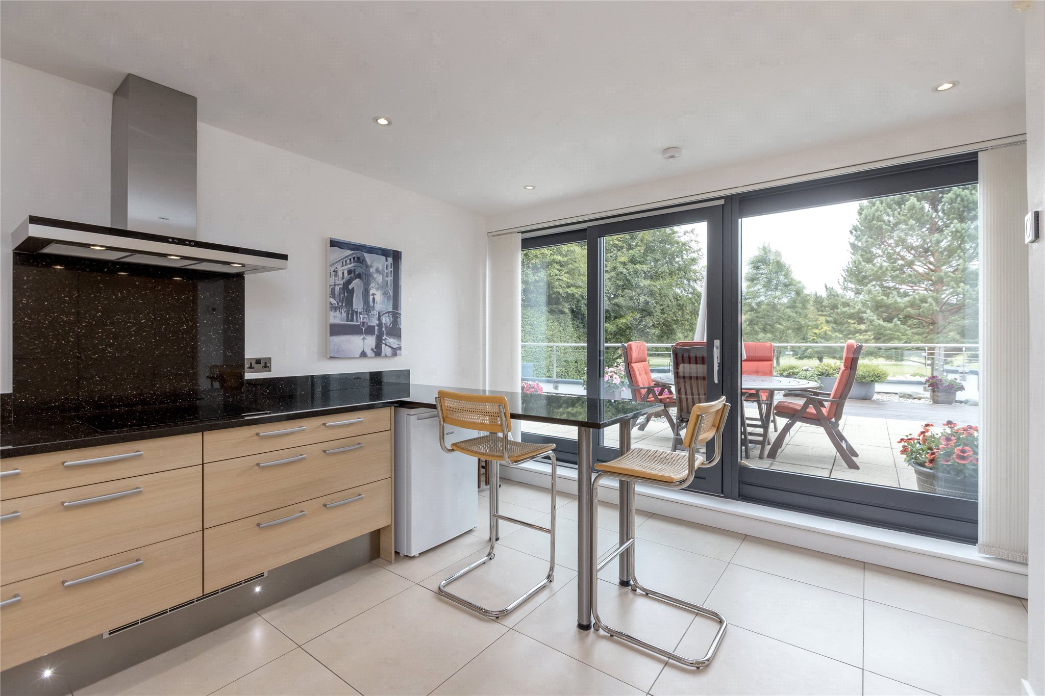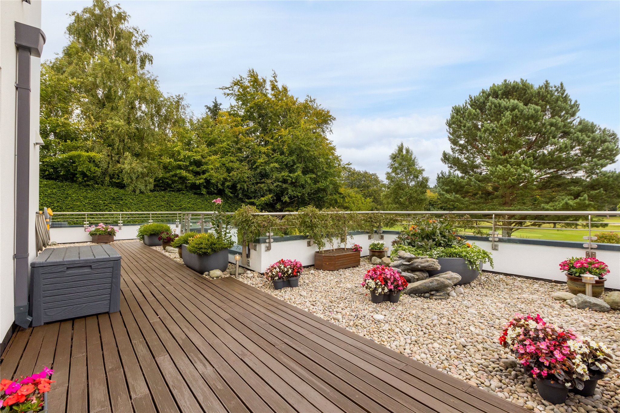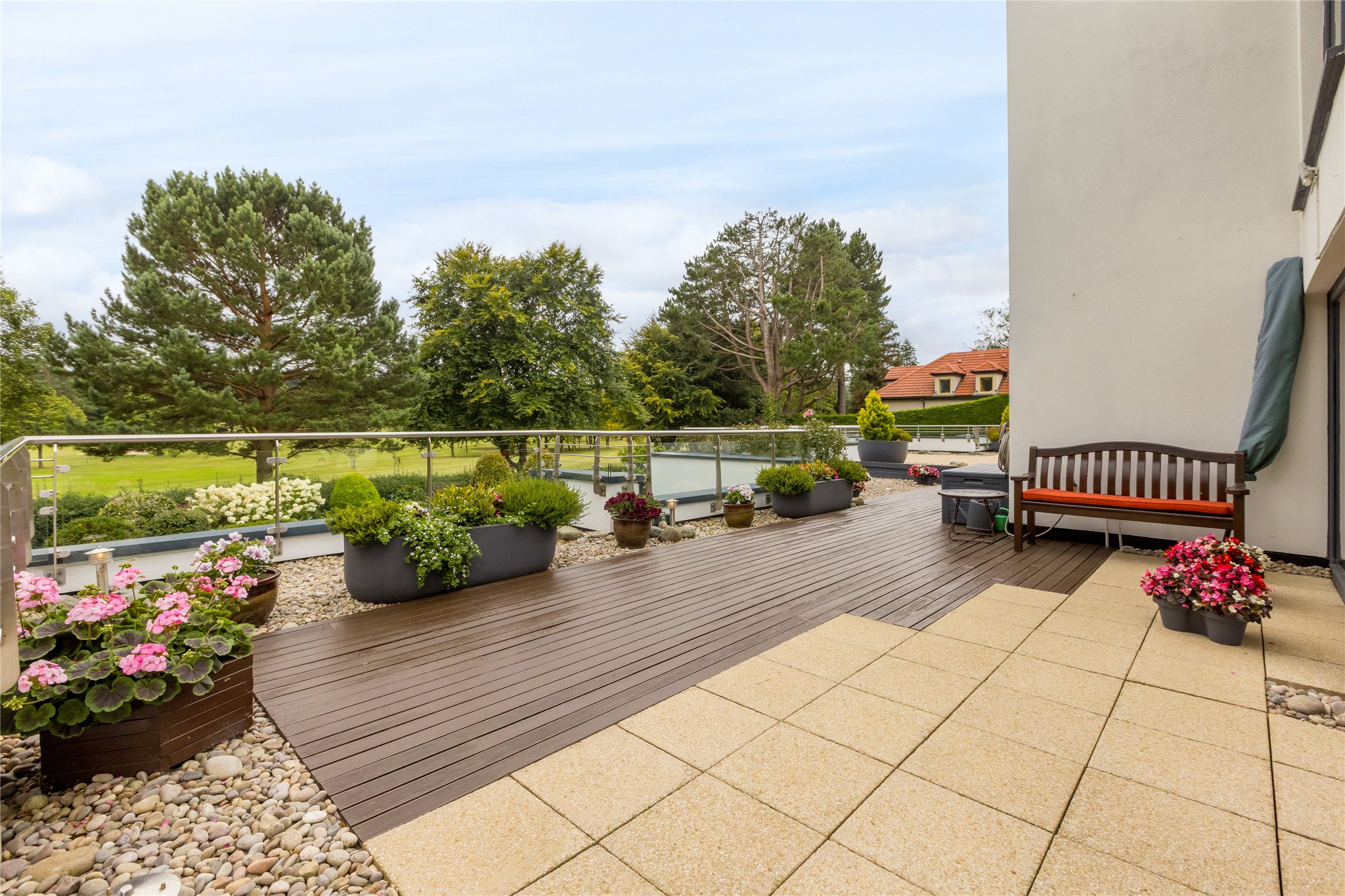 A private main door opens into a welcoming hallway, leading to the impressive sitting room where floor-to-ceiling windows frame uninterrupted south-facing views over the neighbouring golf course. French doors extend this space outdoors to a substantial private terrace – the perfect setting for entertaining, dining al fresco, or simply enjoying the sunshine and tranquillity.