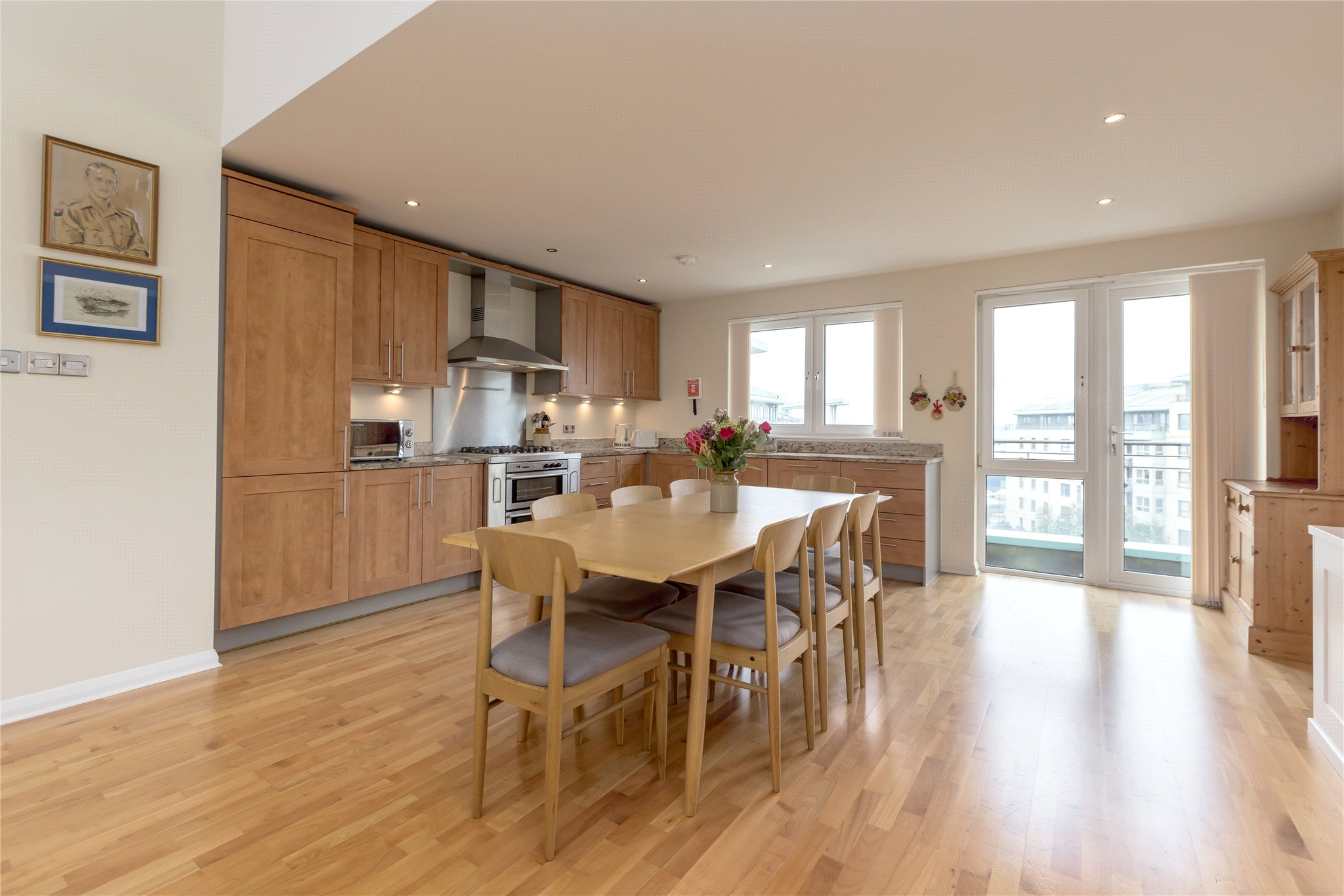 Spacious Open Plan Sitting/Dining/Kitchen - a bright and generously proportioned open-plan living area with dual aspect and access to both terraces, perfect for relaxing or entertaining. The modern kitchen area is well-equipped and stylishly finished with integrated appliances.