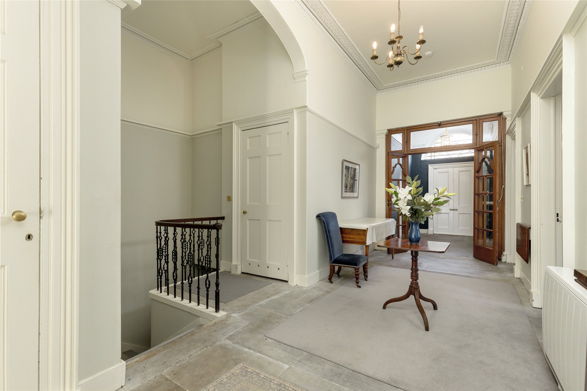 Approached via its own private main door, the property opens into a generous entrance vestibule and hall laid with flagstones, immediately setting a tone of grandeur and heritage