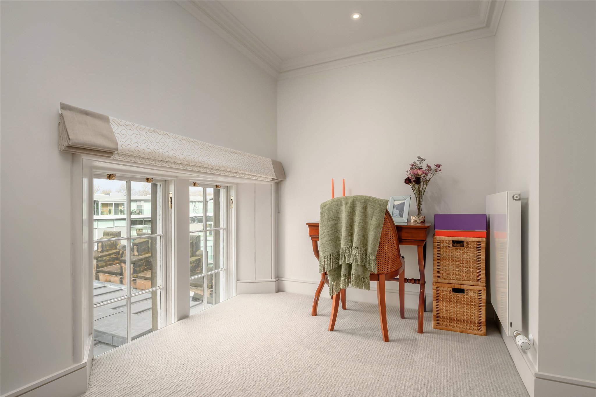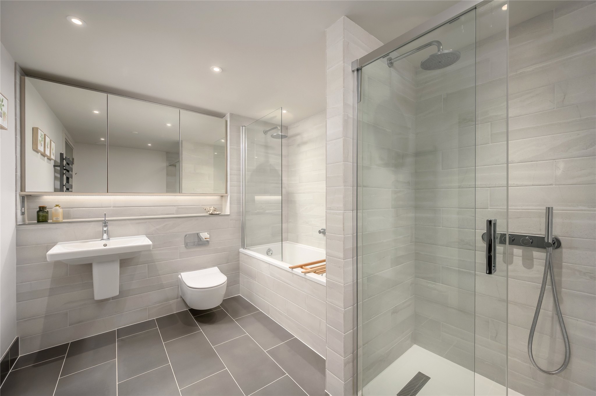 The principal bedroom is situated on this floor and is particularly generous in scale, offering a bright and peaceful retreat, complete with a dedicated dressing area and extensive fitted wardrobe storage. A second stylish bathroom completes the upper accommodation, featuring high-end fixtures, extensive mirrored storage, as well as both a bath and a separate shower.