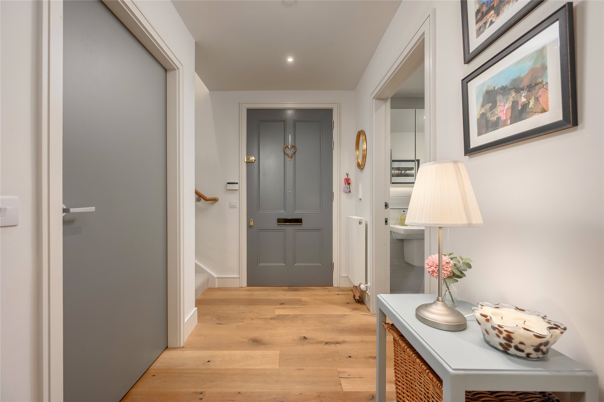 Also located on the lower level is a large and bright double bedroom which enjoys a pleasant outlook and benefits from substantial fitted wardrobe and storage space. A contemporary bathroom finished to a high standard serves this level, featuring high-end fixtures and extensive mirrored wall storage cupboards. A useful utility room off the hall provides additional storage and practicality, while a large understair cupboard further enhances the excellent storage provision on this floor.