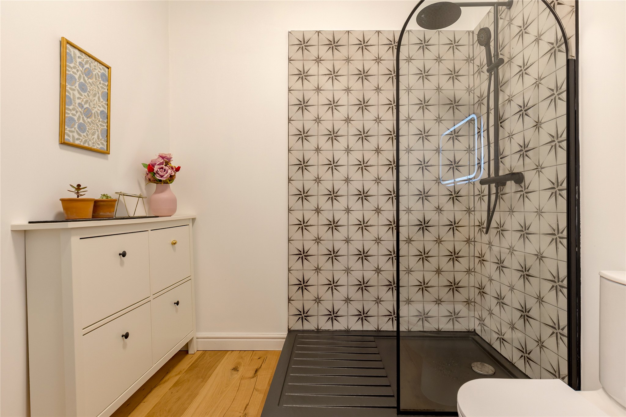 The modern fitted kitchen is well-appointed with generous workspace and storage, while both bedrooms are spacious doubles, offering flexibility for home working or guest accommodation. A striking contemporary shower room, finished with stylish tiling and quality fittings, completes the accommodation.
