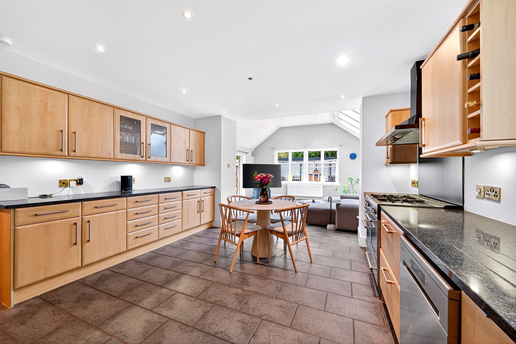The property is set back from the road and offers excellent kerb appeal, with off-street parking for multiple vehicles and a detached garage with additional office. Inside, the ground floor features a welcoming vestibule and grand entrance hallway leading to a bright and spacious formal drawing room, complete with bay window and feature fireplace. A versatile fifth bedroom is also located on this level, ideal as a guest suite or home office. An additional grand open-plan sitting/dining room with bay window and feature fire place provides a further expansive living space. The bright and spacious kitchen leading on to an additional family room is a particular highlight, featuring integrated appliances, multiple skylights, and direct access to the expansive rear garden, making it the heart of the home for both family life and entertaining.