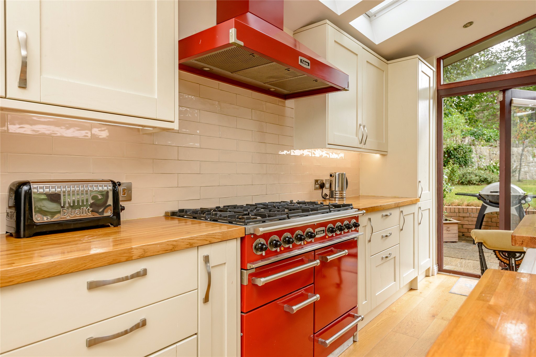 The ground floor features a generous double-aspect living room, complete with a fireplace, creating a welcoming space for relaxing or entertaining. To the rear, the heart of the home is the extended dining kitchen, beautifully styled, flooded with natural light and well-equipped with a range cooker, Belfast sink, integrated appliances, boiling water tap, American fridge/freezer, log burning stove, and a large central island with seating. Two sets of French doors open directly onto the garden, seamlessly blending indoor and outdoor living. A separate dining room provides additional space for family meals or formal entertaining, there is a fifth bedroom or study, while a useful utility room and a convenient downstairs WC complete the ground floor.