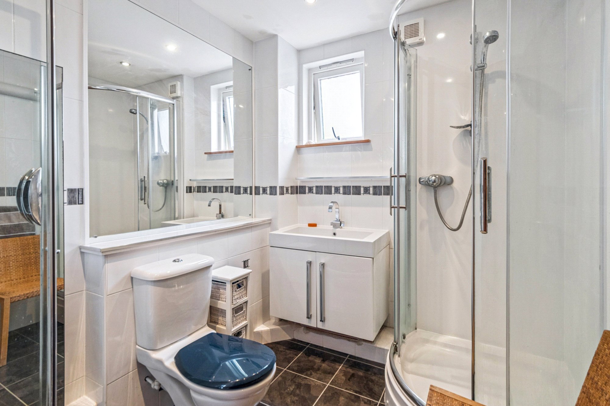 The accommodation comprises a welcoming entrance hallway leading into a generously proportioned lounge and dining area, which enjoys stunning sea views through large windows that flood the space with natural light. The separate kitchen is fully fitted and well-appointed, offering ample workspace and storage. There are two spacious double bedrooms, one of which features extensive fitted wardrobes, and a shower room finished to a high standard. Two deep storage cupboards off the hallway provide excellent additional storage.