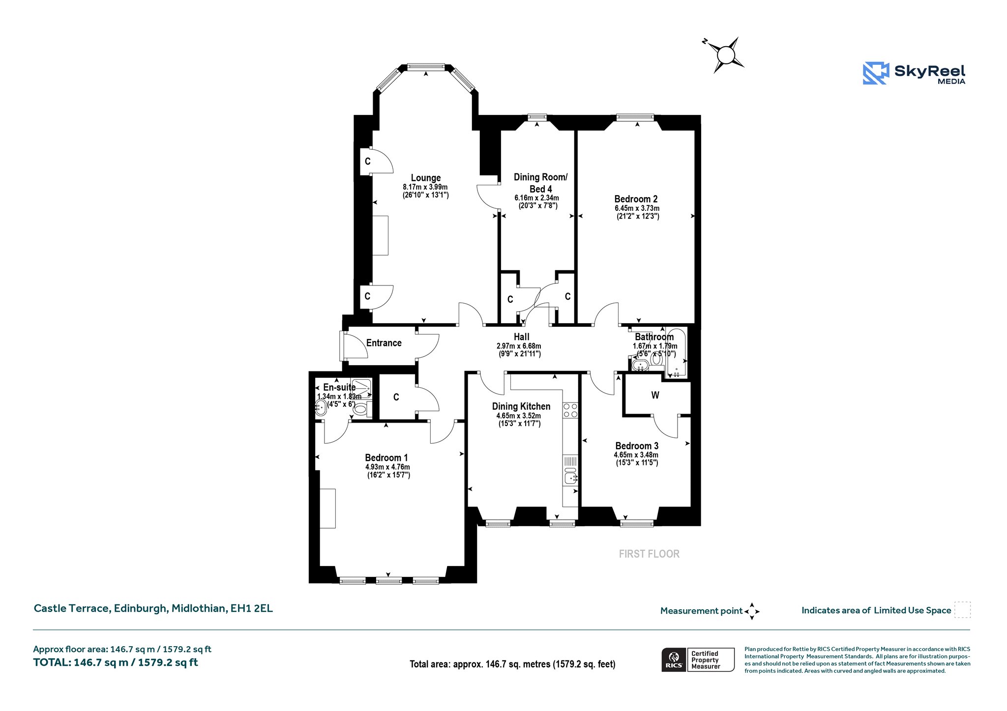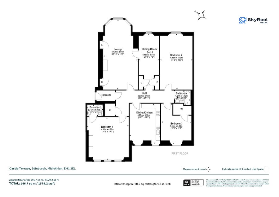Set in one of Edinburgh’s most iconic addresses, this magnificent four-bedroom first-floor flat on Castle Terrace offers an exceptional opportunity to acquire a spacious city-centre home brimming with period character and potential for modernisation. Occupying approximately 1,579.2 sq.ft, the property forms part of a distinguished traditional tenement and is perfectly positioned to enjoy uninterrupted views of Edinburgh Castle and the historic skyline.