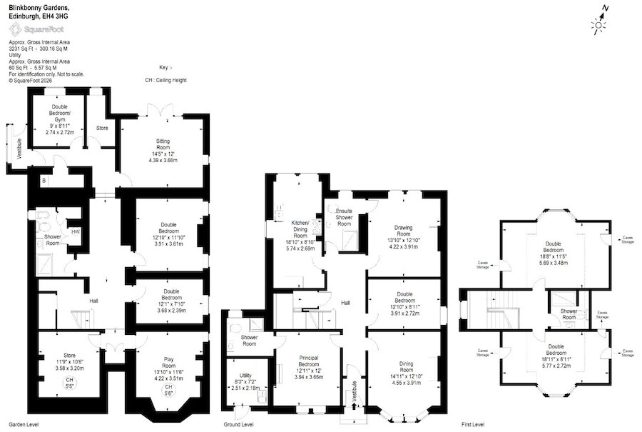 Inside, the property provides extensive living space. The garden level features a sitting room overlooking the garden, two double bedrooms, multiple store rooms, a shower room, and direct access outside. The ground floor offers a spacious kitchen/dining room, an impressive drawing room, two further double bedrooms, an additional dining or reception room, the principal bedroom with ensuite shower room, a utility room, and a separate shower room.