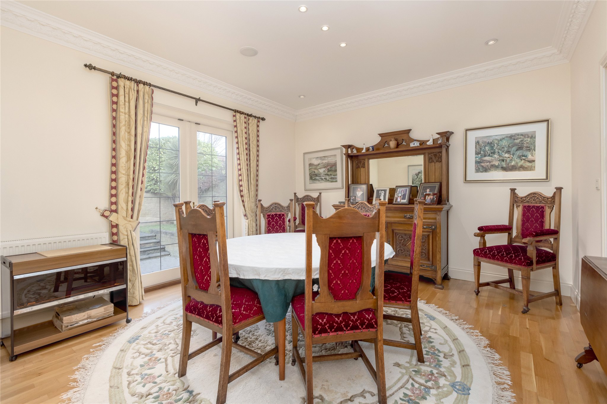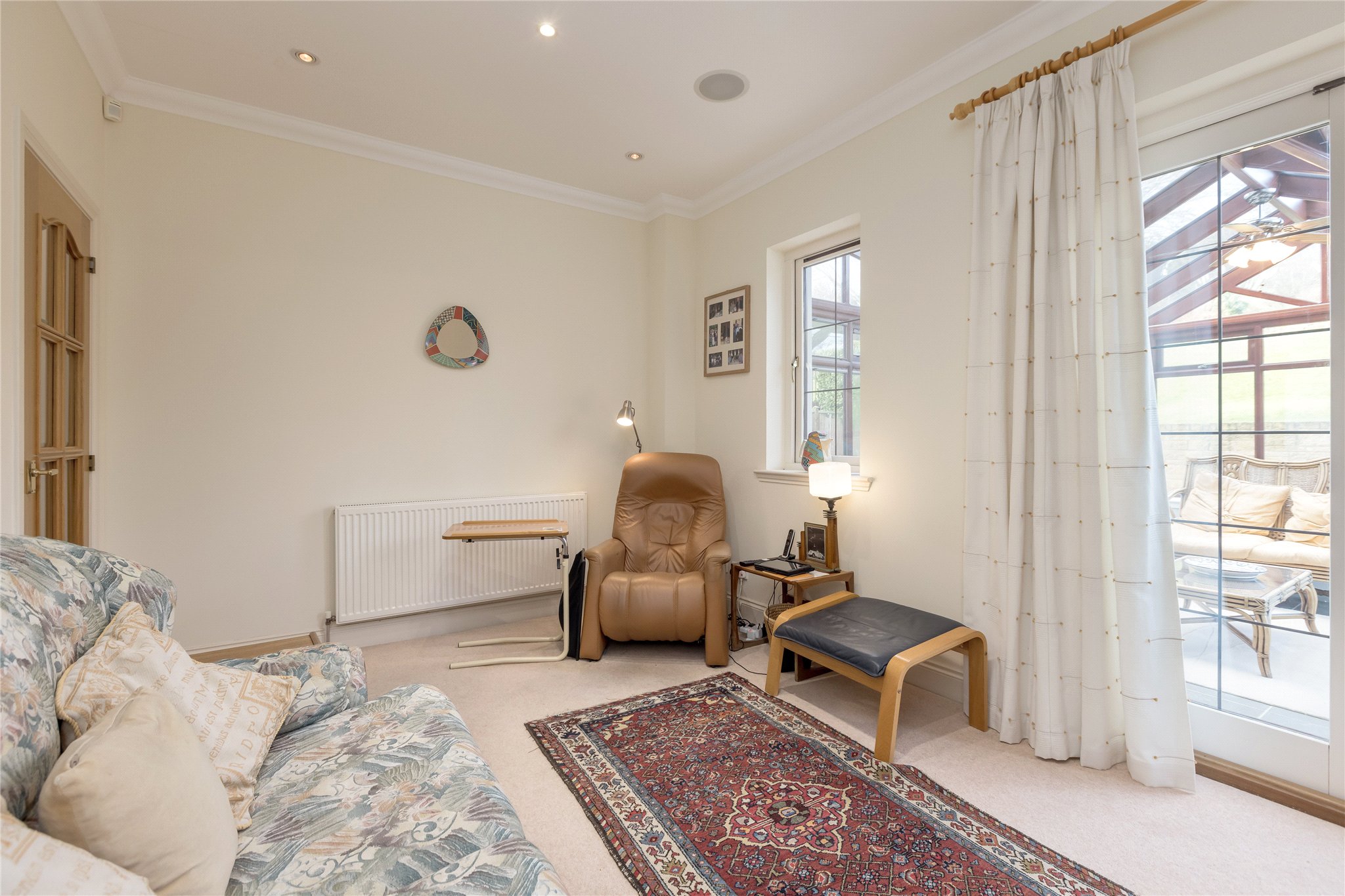 The accommodation on the ground floor begins with a welcoming vestibule leading into a central hall which provides access to the principal reception rooms. The impressive drawing room is a particularly fine space with large windows allowing for excellent natural light and offering an elegant setting for entertaining. A separate dining room provides a more formal space for family meals and gatherings, while the spacious family room sits to the rear of the property and connects directly to a bright conservatory overlooking the garden, creating a relaxed everyday living area. The kitchen is well proportioned and offers good storage and workspace, with the adjoining utility room providing additional practicality and access to the exterior. A study or library offers an ideal space for home working, reading or quiet retreat, and a convenient guest WC completes the ground floor accommodation.
