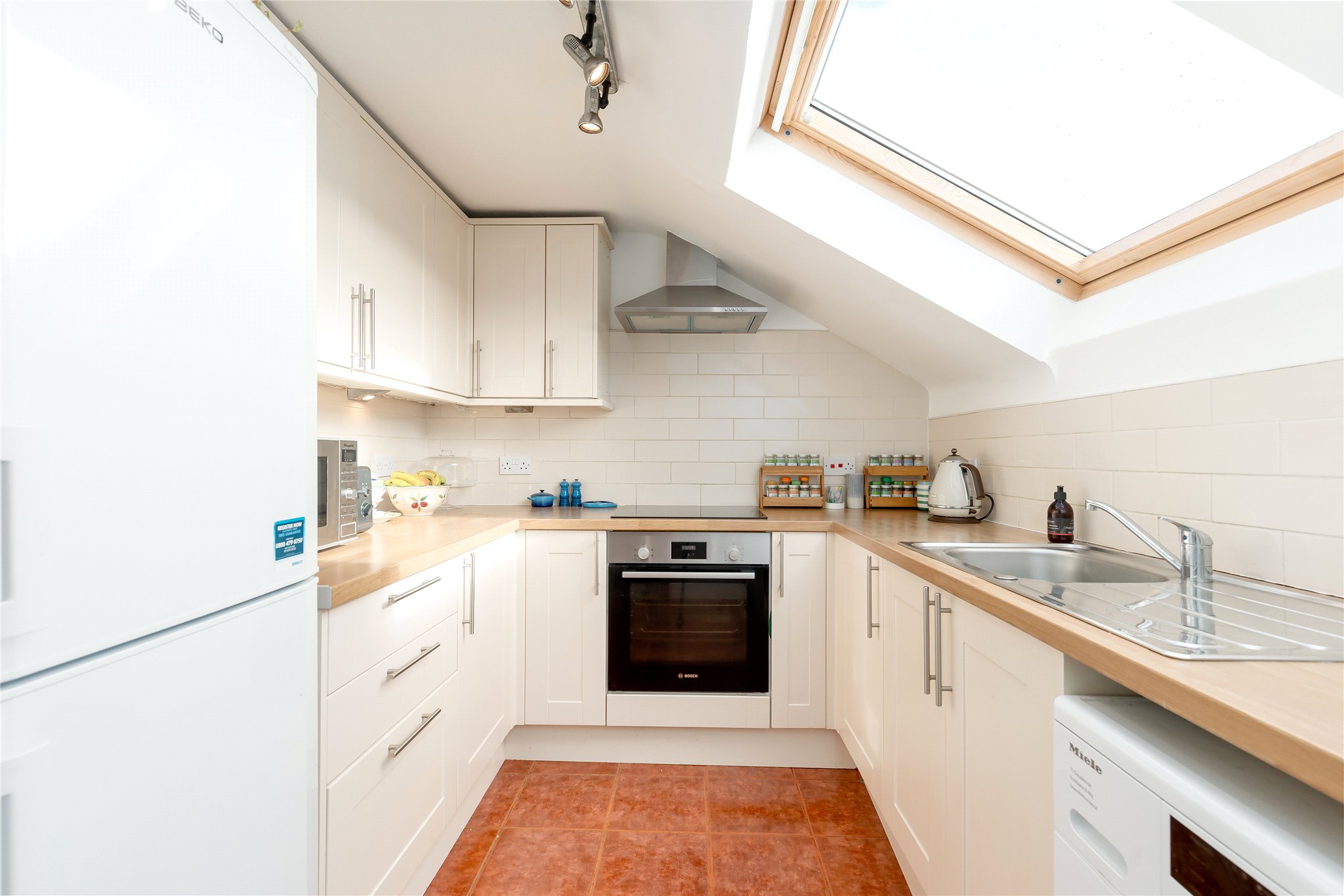 The generously proportioned living and dining room is flooded with natural light from a south-facing window and benefits from a traditional style open fireplace with marble hearth, a traditional style radiator and a built in bookshelf. It also offers direct access to the fitted kitchen with a south facing Velux window and fitted with a range of units with worktop and appliances to include a built-in electric hob and oven with extractor and a freestanding fridge/freezer.