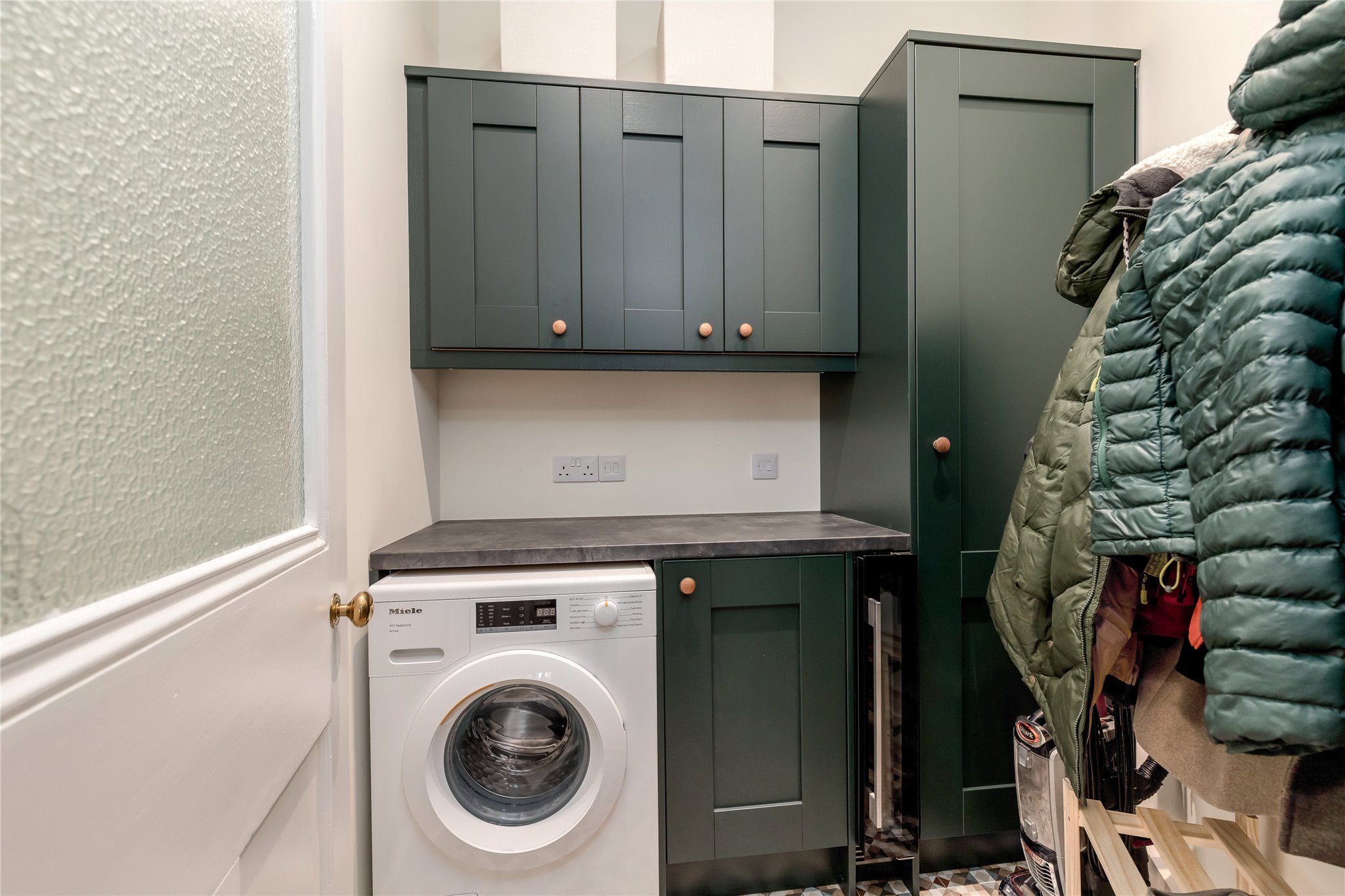 A separate utility room provides additional storage and houses a Miele washing machine, and a slimline wine fridge.