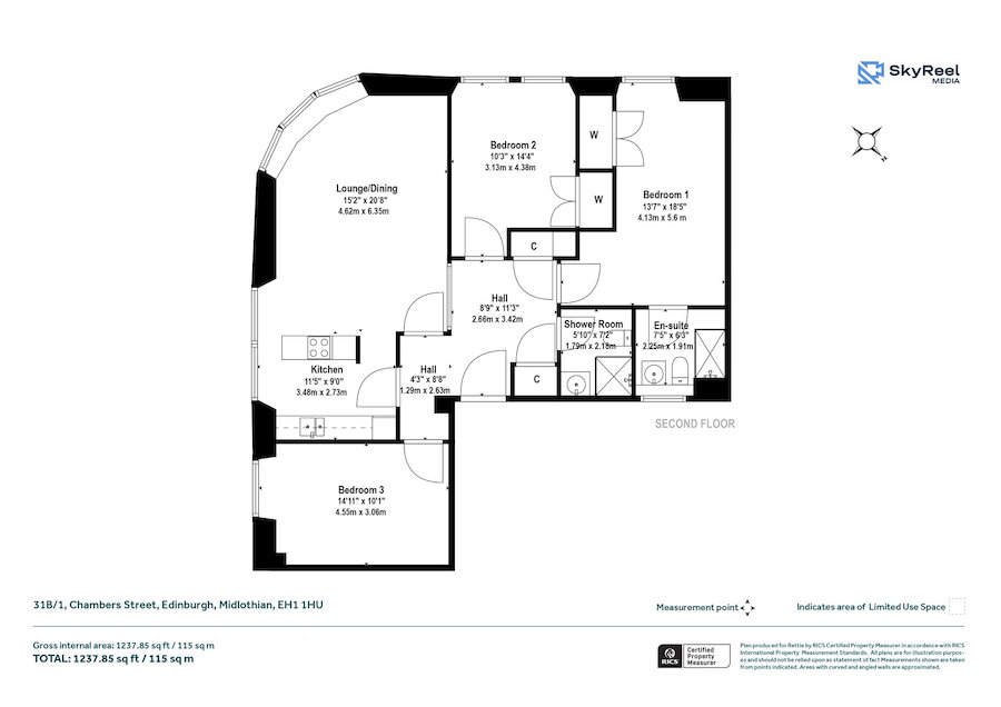 31B/1 Chambers Street is an exceptional threebedroom, twobathroom apartment forming part of the iconic former Dental Hospital at the top of Chambers Street, perfectly positioned on the second floor. Offering a generous 1237sqft of welldesigned accommodation, the property features a welcoming hallway leading into a superb lounge and dining room with a distinctive angled bay section that floods the space with natural light. The modern fitted kitchen sits conveniently off the main living area, while the principal bedroom provides extensive builtin storage and a private ensuite shower room. A further two double bedrooms, one particularly spacious and located off the secondary hallway, offer excellent flexibility for guests, family or workspace use, complemented by a contemporary shower room and multiple builtin cupboards throughout.