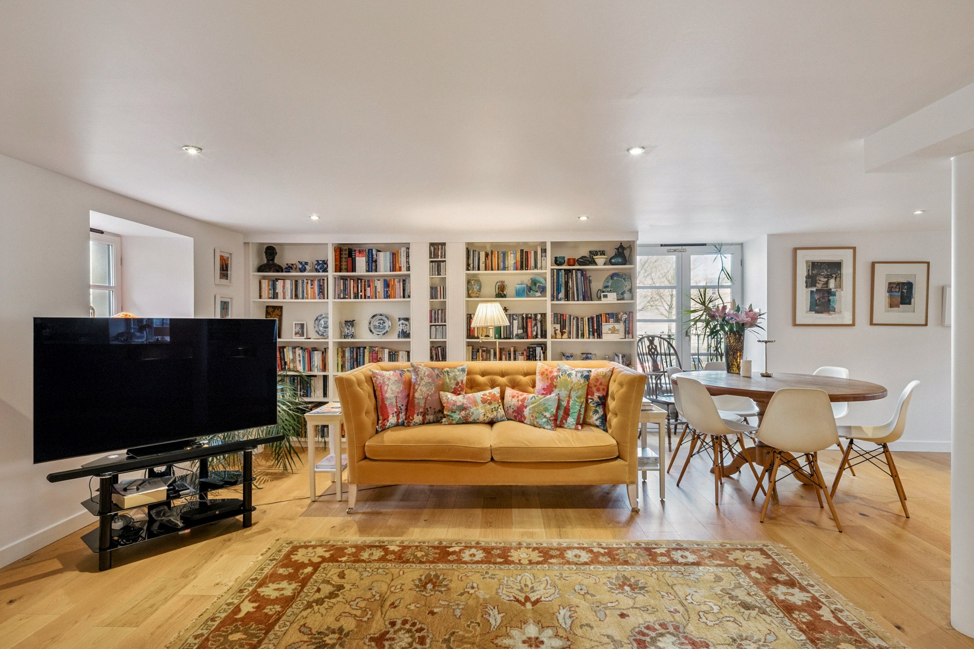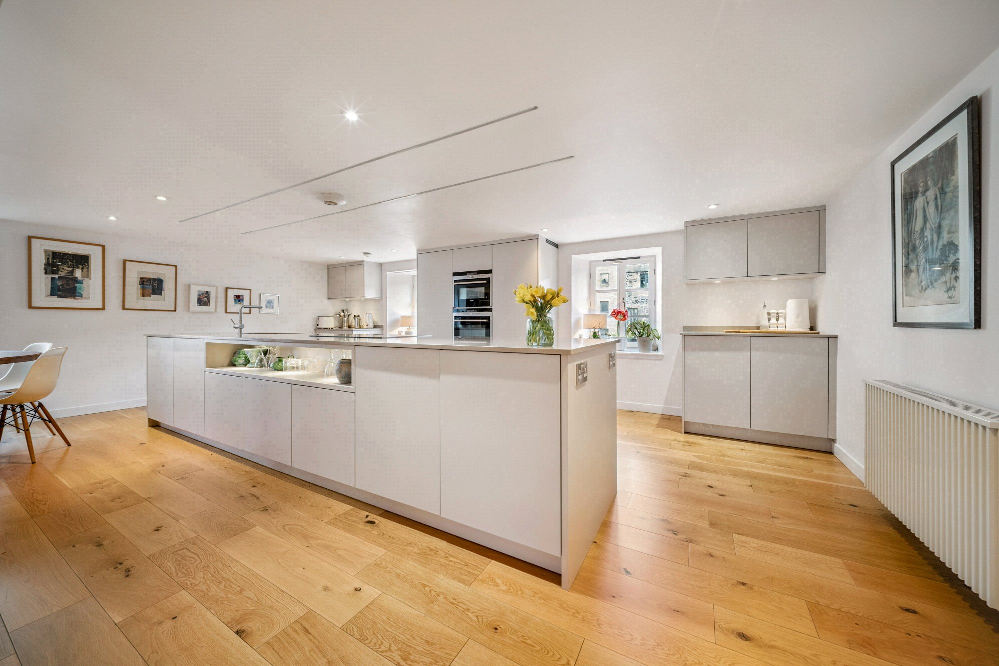 The contemporary kitchen is thoughtfully designed with an extensive range of storage and a striking central island incorporating the hob and sink. High-quality integrated Siemens appliances include an oven, microwave, warming drawer, full-height fridge and freezer, and dishwasher. The sitting area is enhanced by fitted bookshelves and French doors opening onto a Juliette balcony. A separate utility cupboard houses a Siemens washing machine and tumble dryer.
