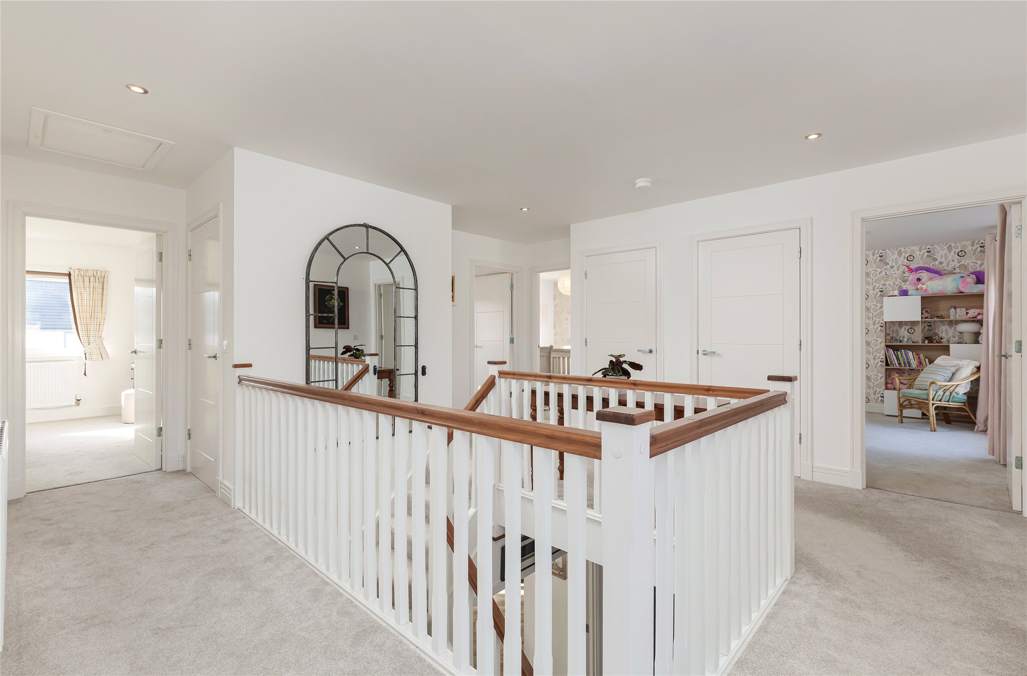 Upstairs, there is a galleried landing and the luxurious principal bedroom suite boasts a dressing room and stylish en-suite shower room. Four further bedrooms provide excellent family or guest accommodation, three of which include fitted wardrobes, with one also benefiting from its own en-suite. A contemporary family bathroom with a separate shower serves the remaining rooms.