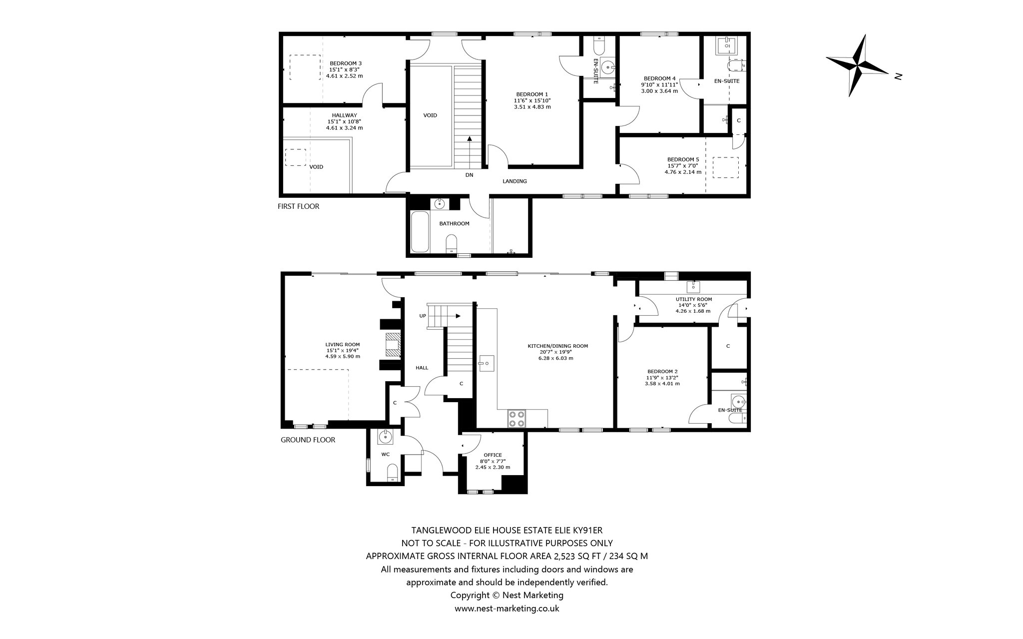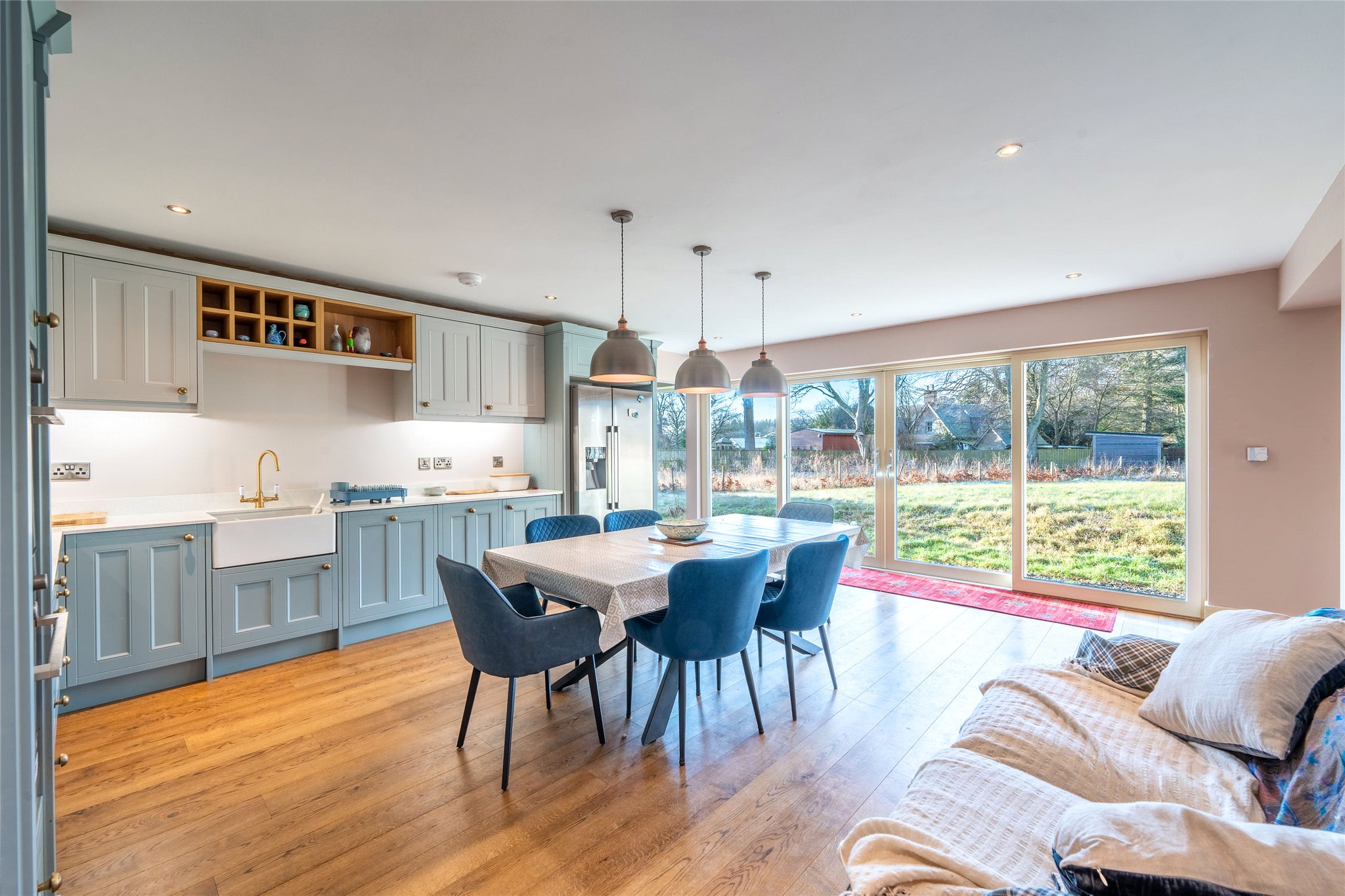 Meticulously designed two years ago by the current owner, this stunning five-bedroom detached stone-built residence located within the scenic Elie House Estate presents a rare opportunity. Characterised by an abundance of space, natural light, and an exquisite attention to detail it will make an exceptional home. Approached via a gated pathway, an arched porch ushers you into the entrance vestibule and a tastefully decorated hallway with handsome wooden flooring and built-in storage. To your left a warm and inviting living room awaits. Enjoying a dual-aspect and offering access to the rear garden it is flooded with natural light and boasts a stylish interior design including a log-burning stove. Opposite lies a generously proportioned and bright dining kitchen, a true highlight of the home. Overlooking both the front and rear of the property, full-height windows and sliding doors allow for a wonderful aspect of the south-west-facing rear garden and create a seamless indoor and outdoor connection. L-shaped in design the handcrafted kitchen showcases under-base-lit wall and floor cabinetry in a soft duck egg blue complemented by white stone worktops. Alongside a Belfast sink, high-spec integrated appliances include an eye-level grill, oven, hob, and American-style fridge/freezer. The adjacent utility provides for additional storage and ensures the dining kitchen remains streamlined. A versatile office, guest WC, and a light and airy double bedroom enhanced by a stylish contemporary en-suite shower room complete the ground floor layout. Ascending the custom-made oak staircase, the first floor unveils four generously sized double bedrooms, each designed to offer a peaceful retreat. Two of these bedrooms boast luxurious en-suite shower rooms, while the remaining bedrooms share access to a high-spec family bathroom. This eye-catching space includes a rainfall shower enclosure, a countertop washbasin, a wall-hung hidden-cistern WC, and a stunning freestanding double-ended slipper copper-effect bath. PV solar panels and air source heating ensure the home is warm and energy efficient. There is mains water with private drainage.