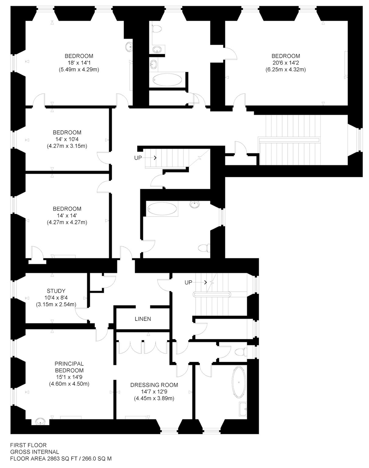 First Floor - Bedroom 1 with ensuite Bathroom, Bedroom 2, Bedroom 3/Dressing Room, Bedroom 4, Bathroom, Study, Principal Bedroom with ensuite Bathroom and Dressing Room.