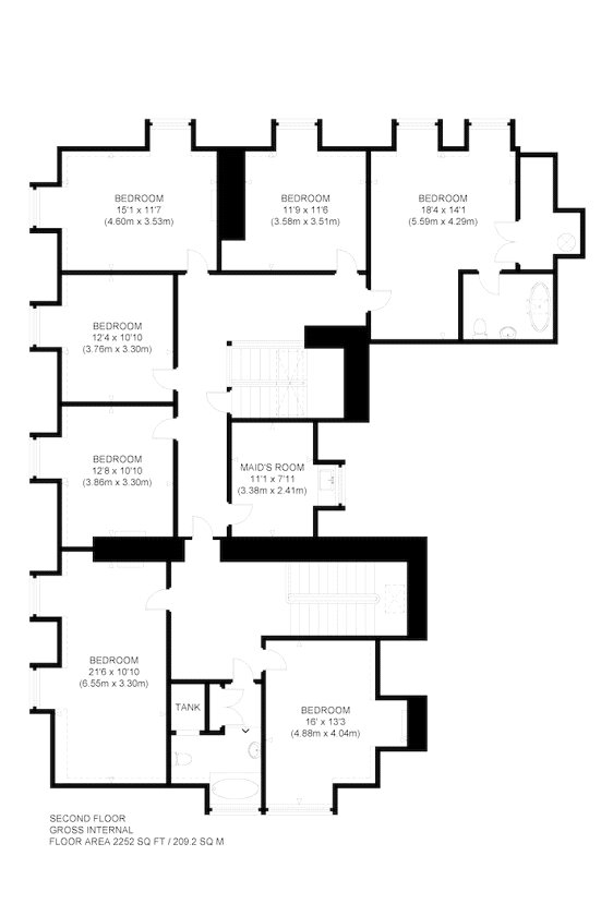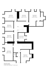 Second Floor – Bedroom 6 with ensuite, 6 Further Bedrooms, Bathroom, former Kitchen.