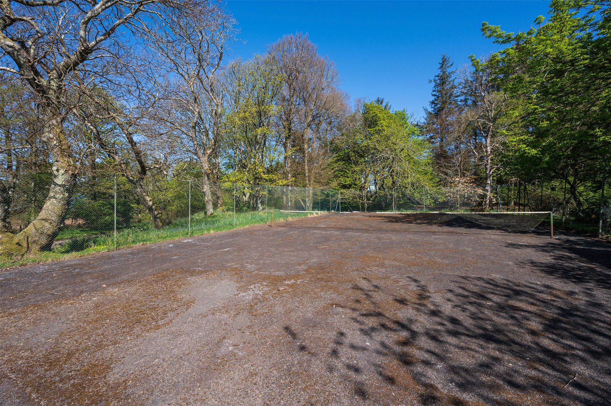 Gardens including sweeping lawns, partly walled garden, all-weather tennis court and broadleaf woodlands.