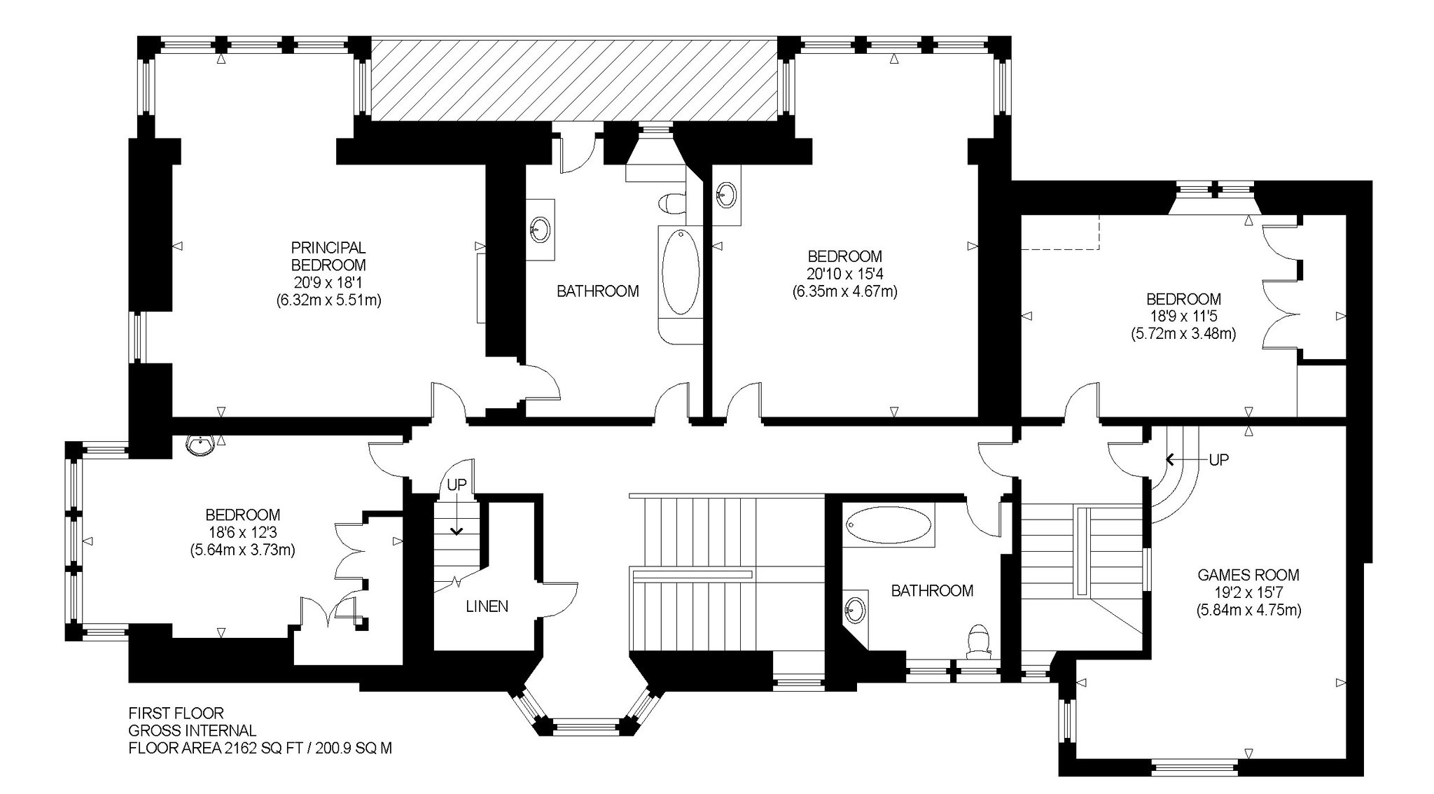 First Floor: Landing, Principal Bedroom with En Suite Bathroom and Balcony, Three Further Double Bedrooms, a Games Room/Bedroom, Family Bathroom and a Linen Cupboard.