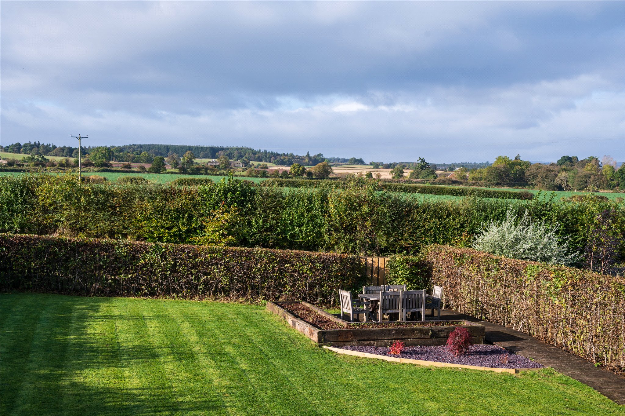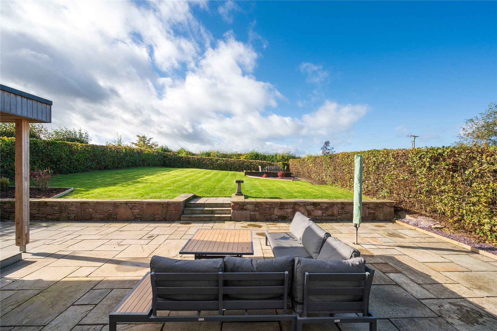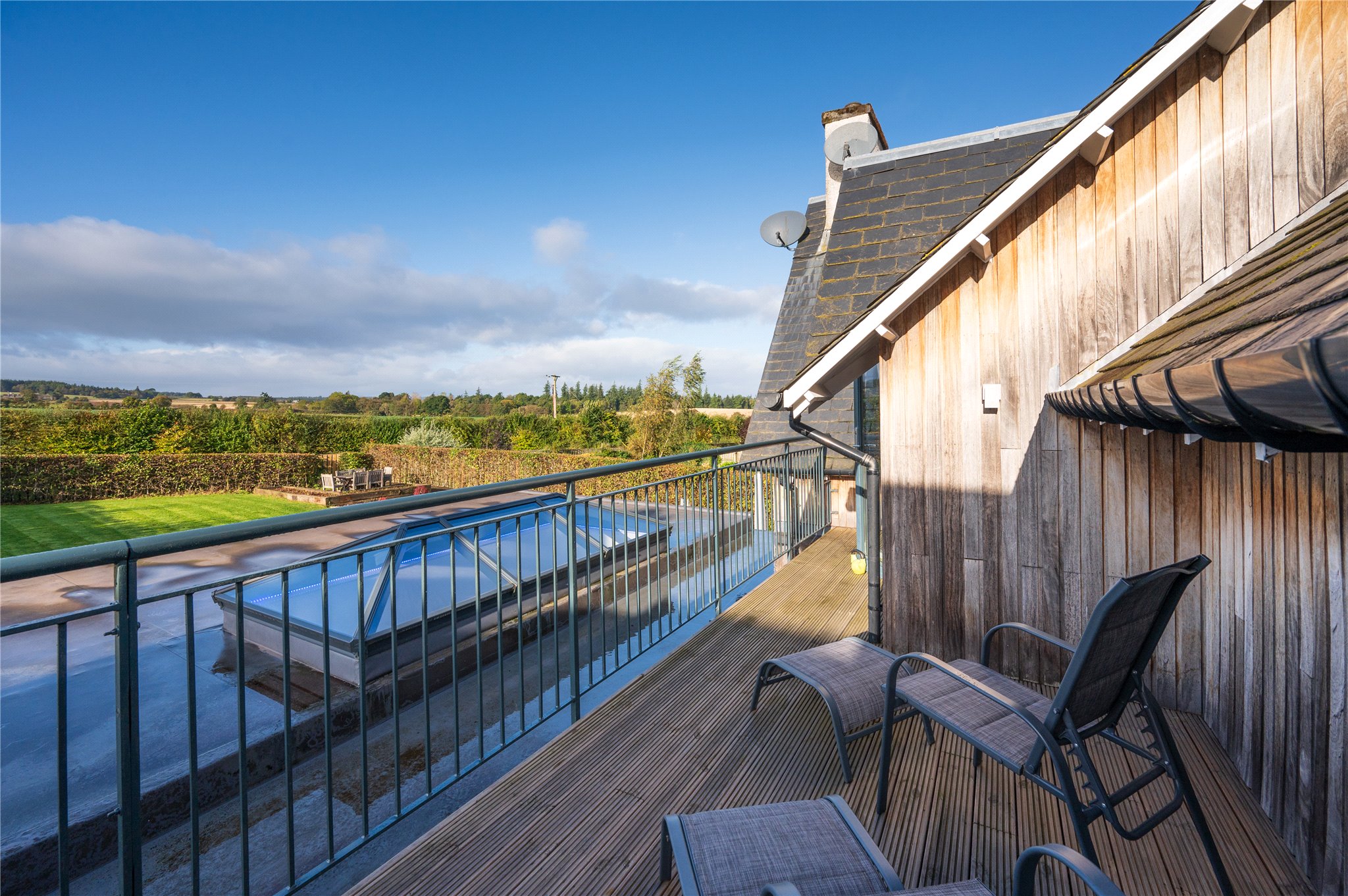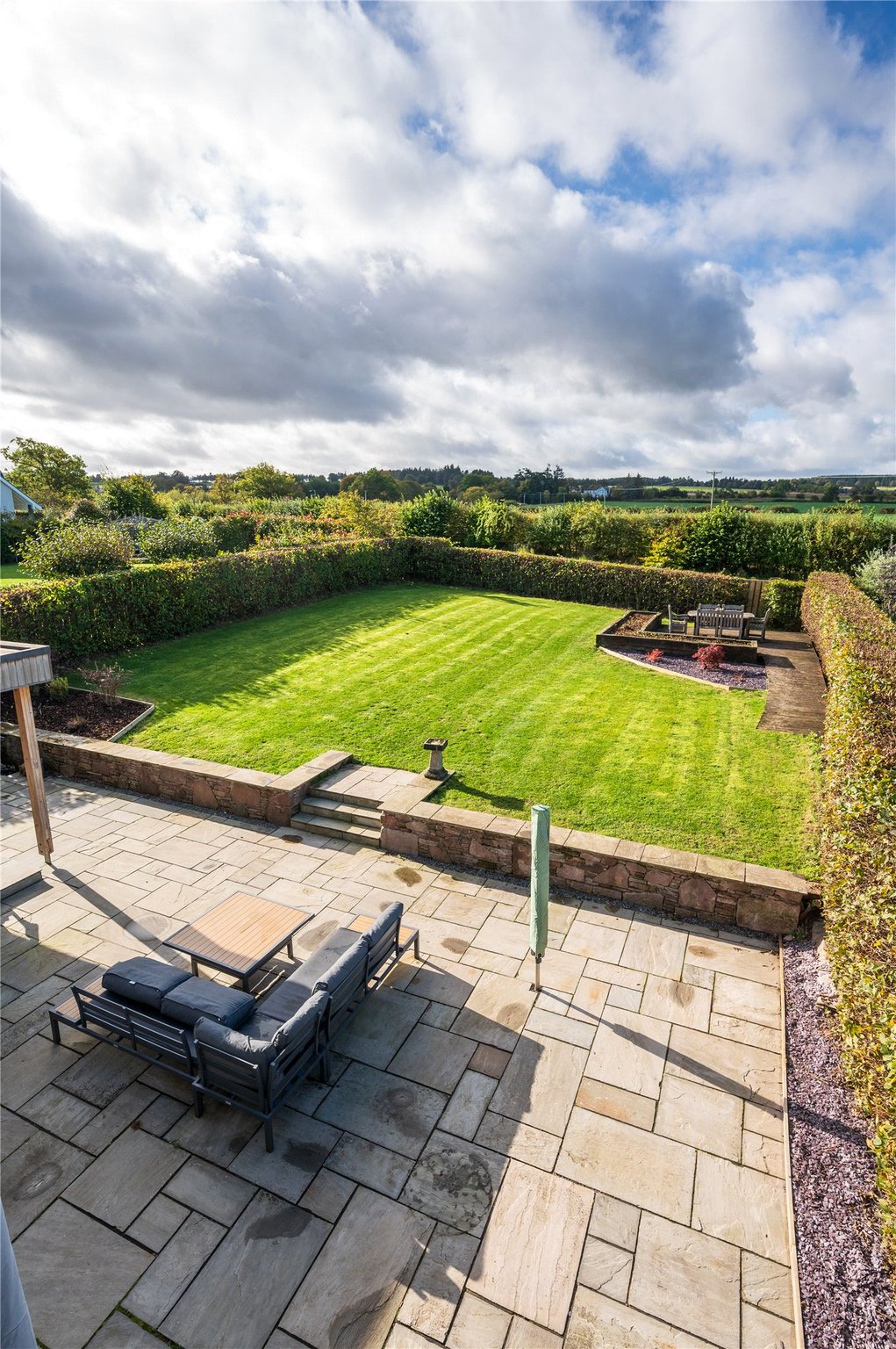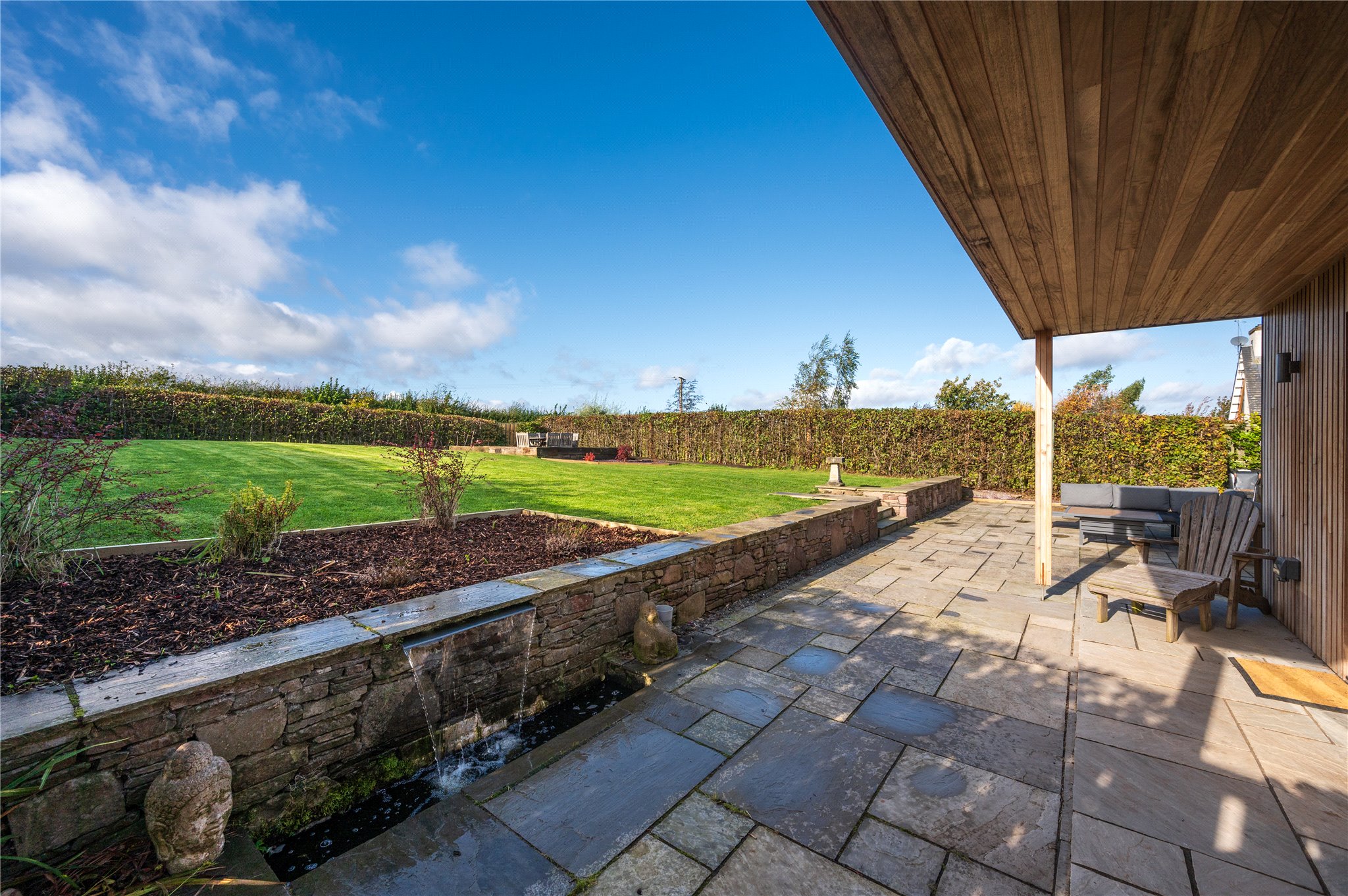 The mainstay of the garden extends outwards from the rear of the house, indulging in the open aspect over the fields to the West. It has been landscaped to a high standard, with natural stone finishes, and features a generous lawn bounded by mature, verdant hedgerows. It has been designed with alfresco living and entertaining in mind, with terraces and verandas positioned to catch the sun at different times of the day. Stretching the width of the rear elevation, there is a sweeping patio terrace finished with natural flagstones, external wall lighting and a contemporary water feature. It incorporates a sheltered veranda, accessed via patio doors from the family/dining room. In the northwest corner of the garden, there is a South and West facing timber decked terrace trimmed with raised beds.