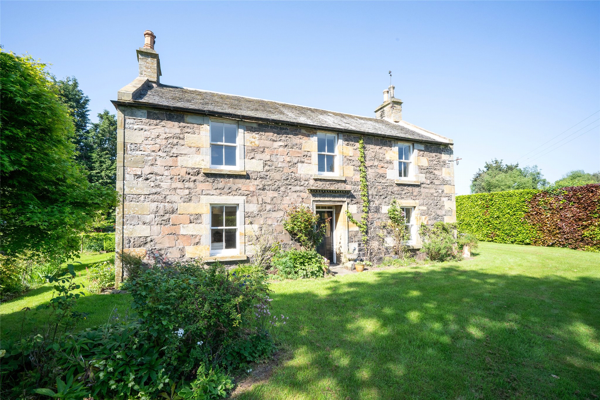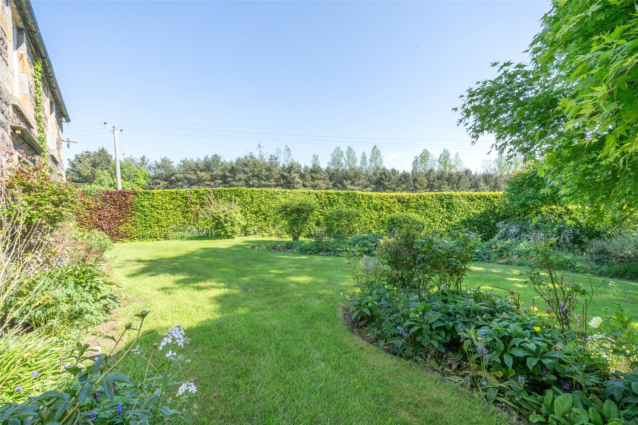 Extensive mature gardens with lawn, herbaceous borders, hedges, trees, and shrubbery