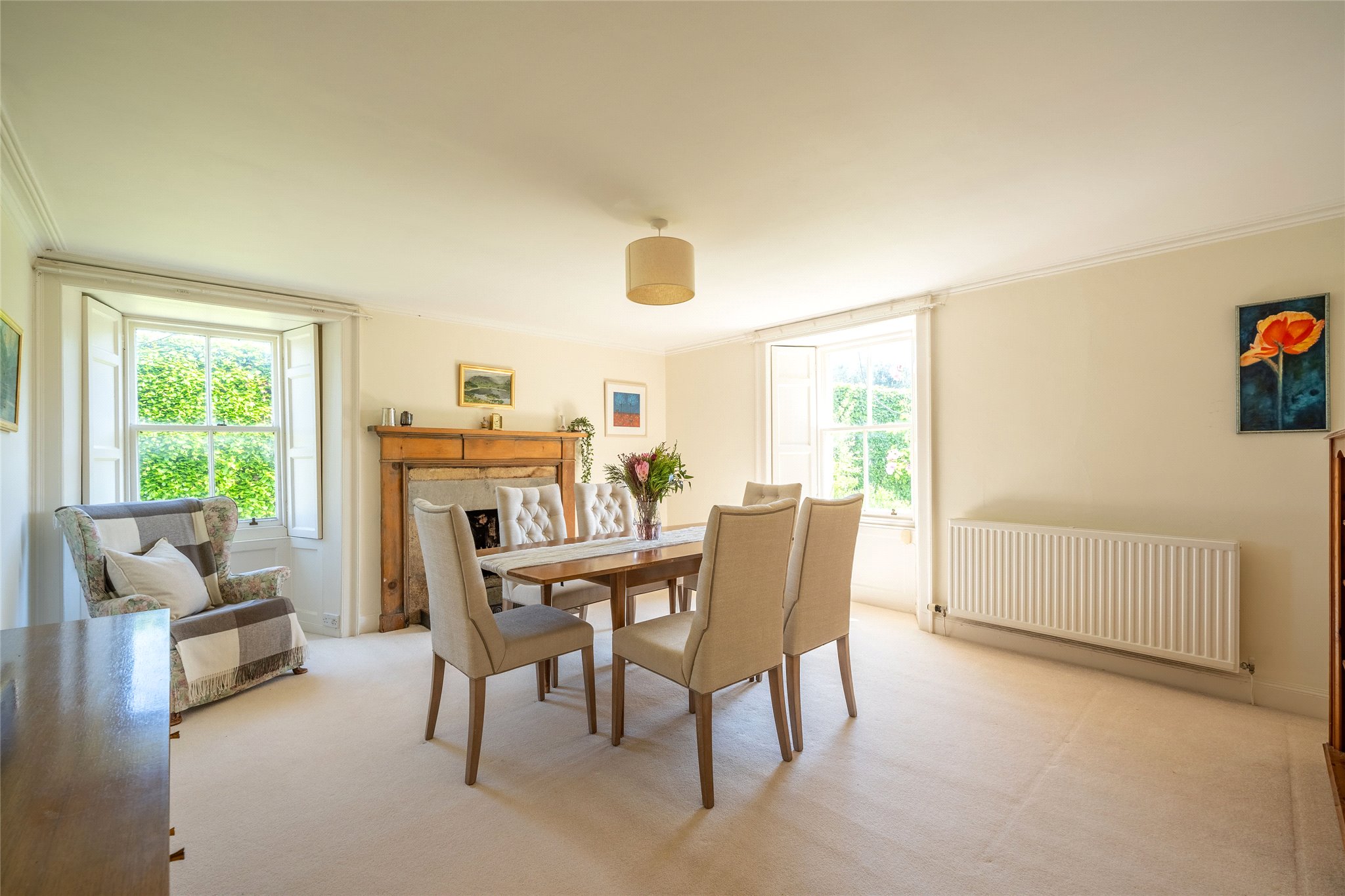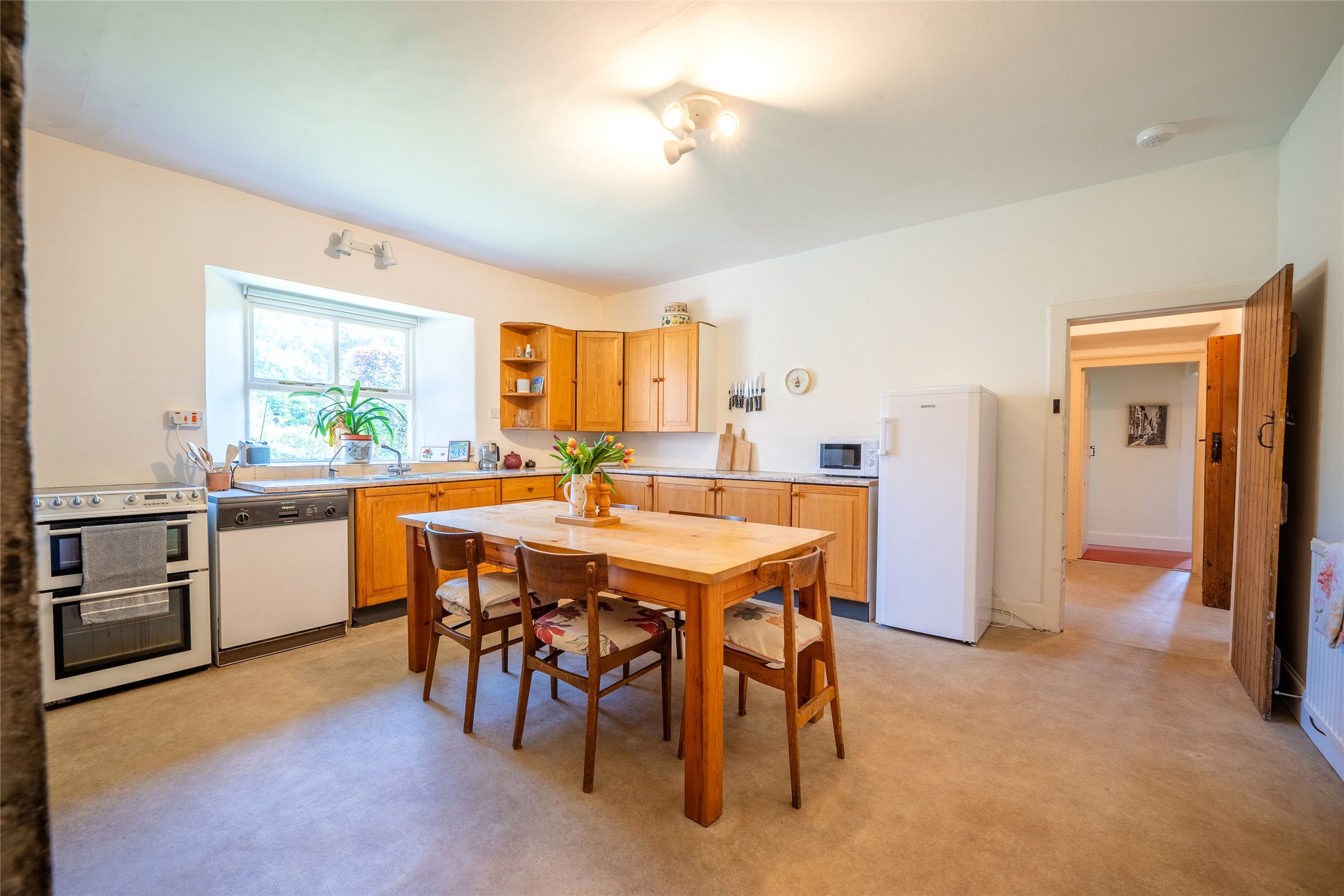 Enjoying a truly idyllic countryside setting minutes from both Leuchars and St Andrews, Strathburn Farmhouse nestled in delightful gardens and grounds boasts light-filled, versatile, and spacious accommodation to offer a wonderful family home. With a charming stone-built facade the front door welcomes you into a light and airy carpeted hallway. On your left lies the spacious and bright south-facing living room. Boasting a wonderful triple-aspect over the gardens, it enjoys a sophisticated yet cosy interior design with a calm colour palette, plush carpeting, and a log-burning stove set in a stone hearth. Opposite the elegant dining room provides the perfect place to entertain friends or host memorable family gatherings. Bathed in natural light, plush carpeting, neutral wall finishes, and an open fireplace combine to create an inviting ambience. Moving further into the property, you pass a bathroom that now requires a cosmetic upgrade and a modern shower room. From here you arrive at a generously proportioned dining kitchen. Soild oak and oak-effect shaker-style wall and floor units are complemented by smooth worktops and freestanding appliances making it a functional and aesthetically appealing space at the heart of the home. Beyond the dining kitchen area is an office along with a versatile and sizeable utility and storeroom. Above the kitchen and office, and accessed by the rear stair is a floored attic ideal for additional storage or possibly another living and reception area, bedroom or office. Returning to the hallway, carpeted stairs take you to the first-floor landing where three south-facing double bedrooms await. Each enjoys enchanting countryside views and a tasteful interior design.