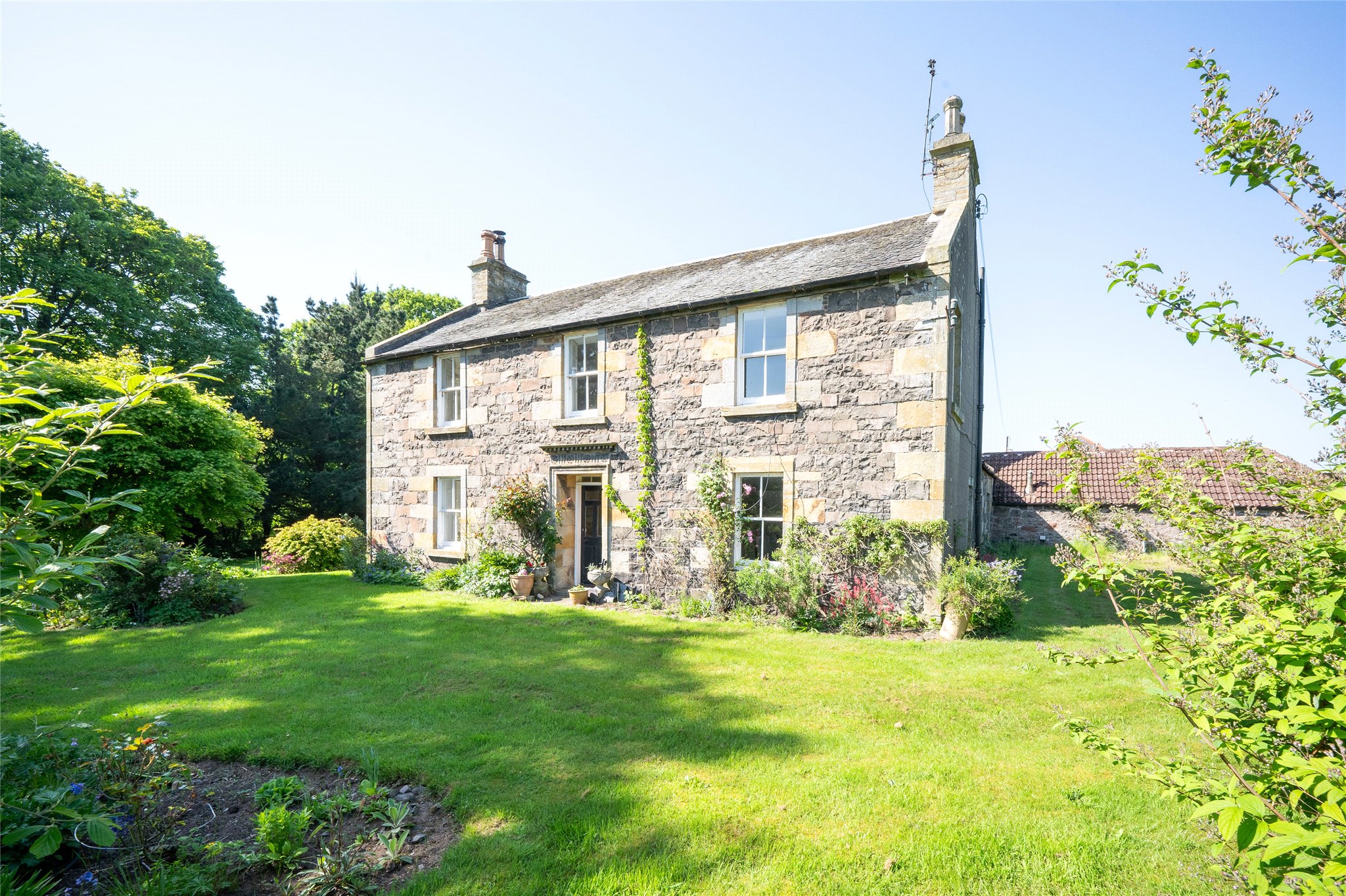 Delightful farmhouse near St Andrews with extensive gardens and grounds, ponds, arboretum and dilapidated steading.