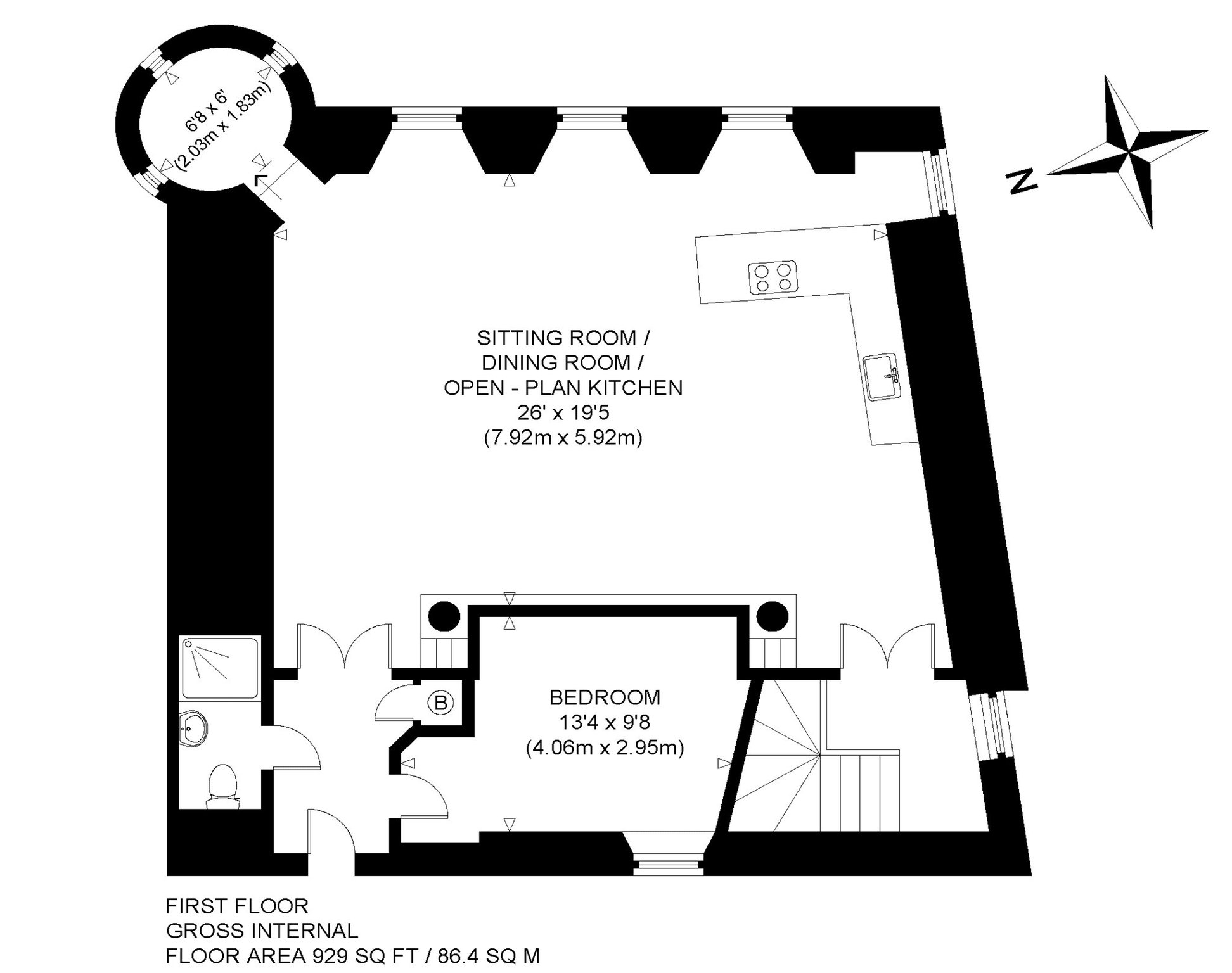 Entrance Hall, open-plan Living/Dining Room and Kitchen, Turret, Double Bedroom, and Shower Room.