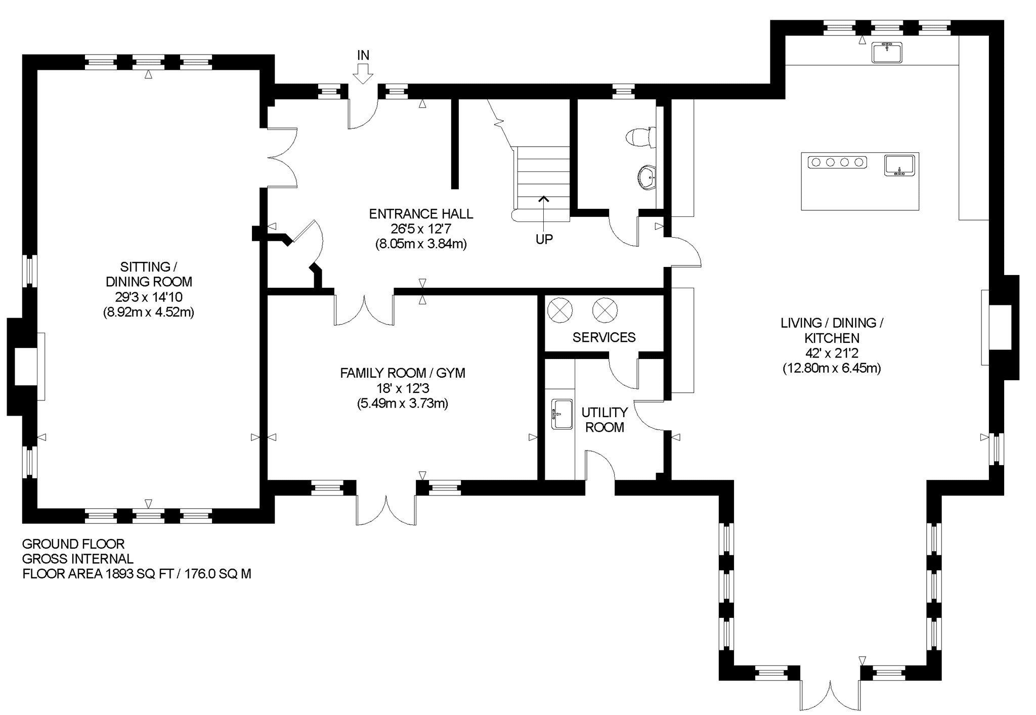 Ground Floor: Entrance Hall, Living Dining Kitchen Room, Utility and Services Room, Sitting Dining Room, Family Room/Gym and WC.