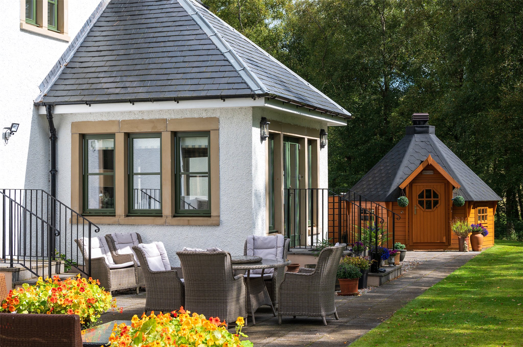Garden: Garden mainly laid to lawn with private, mature woodland to the rear, a large rear patio and timber hexagonal BBQ hut.