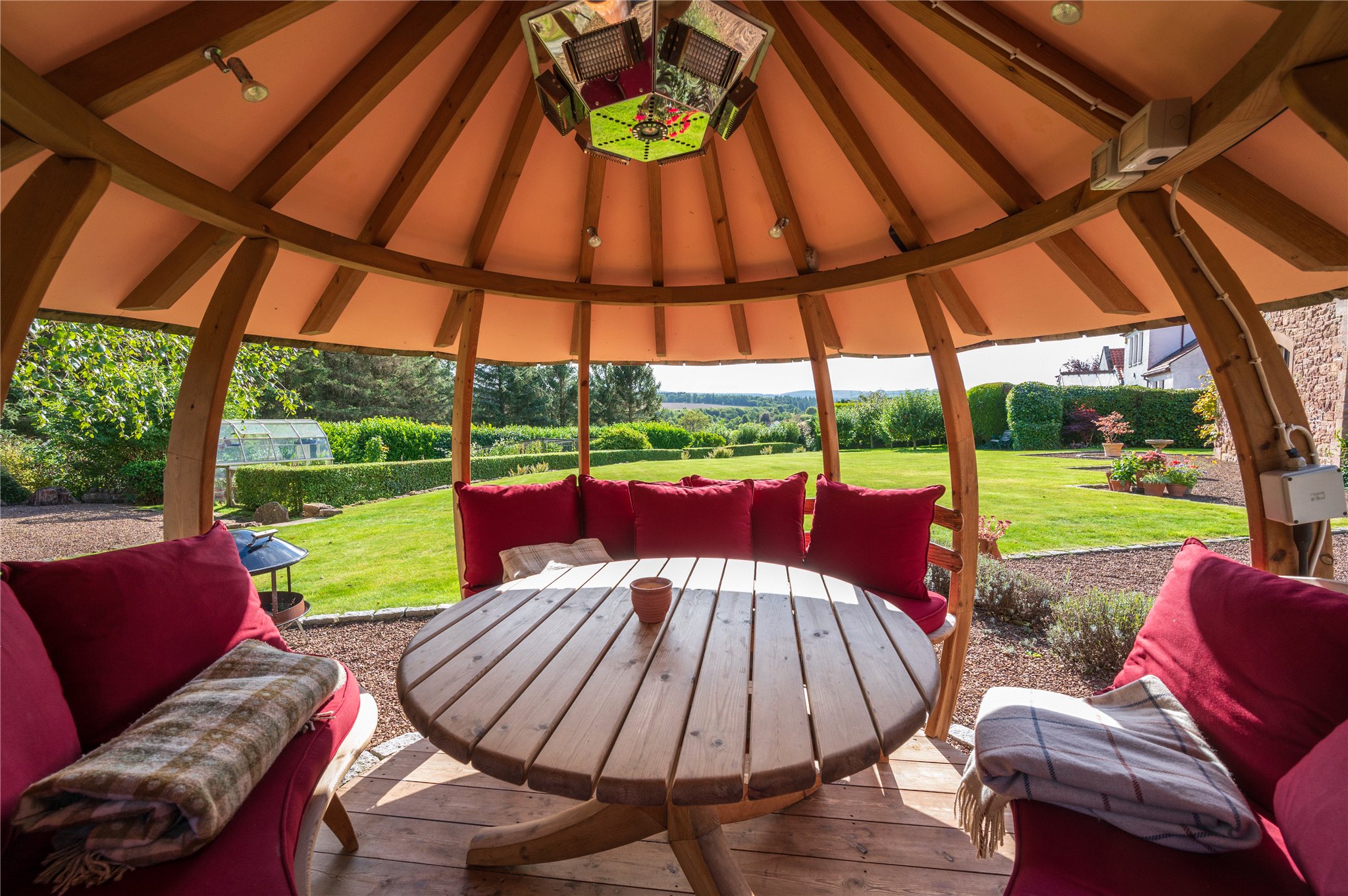 Outbuildings: English Heritage Oak Framed Garage with Carport, Workshop and Wood Store, together with a Hartley Botanics Greenhouse and a Julian Christian ‘Pumpkin’ Gazebo