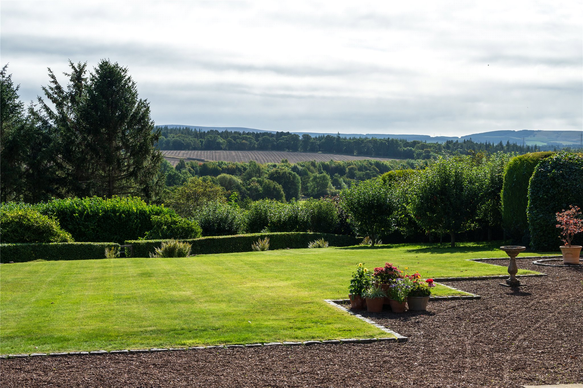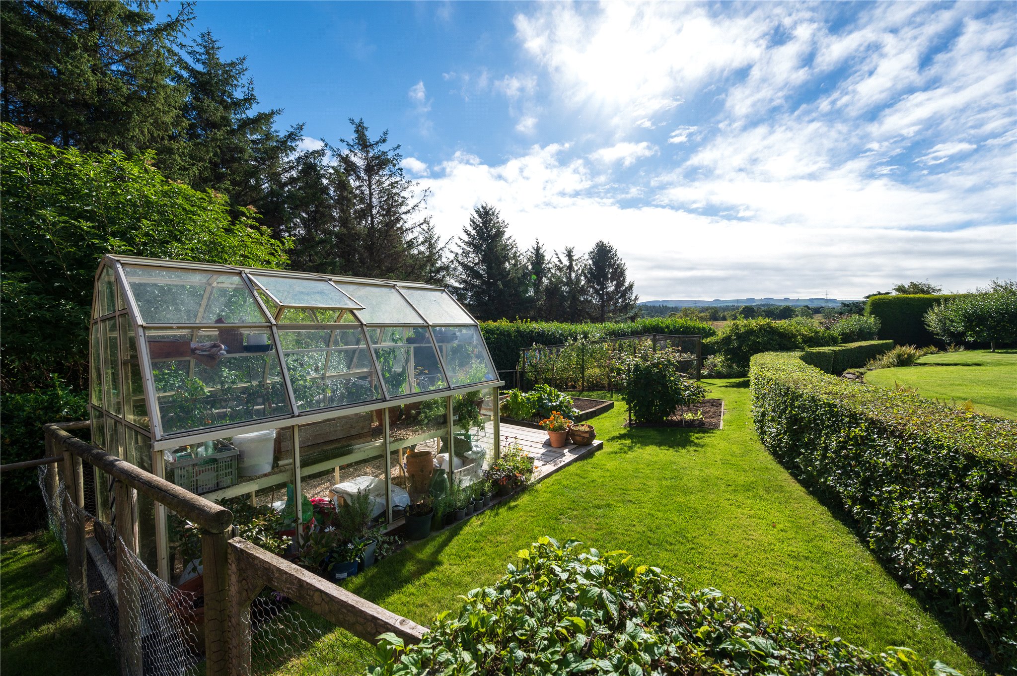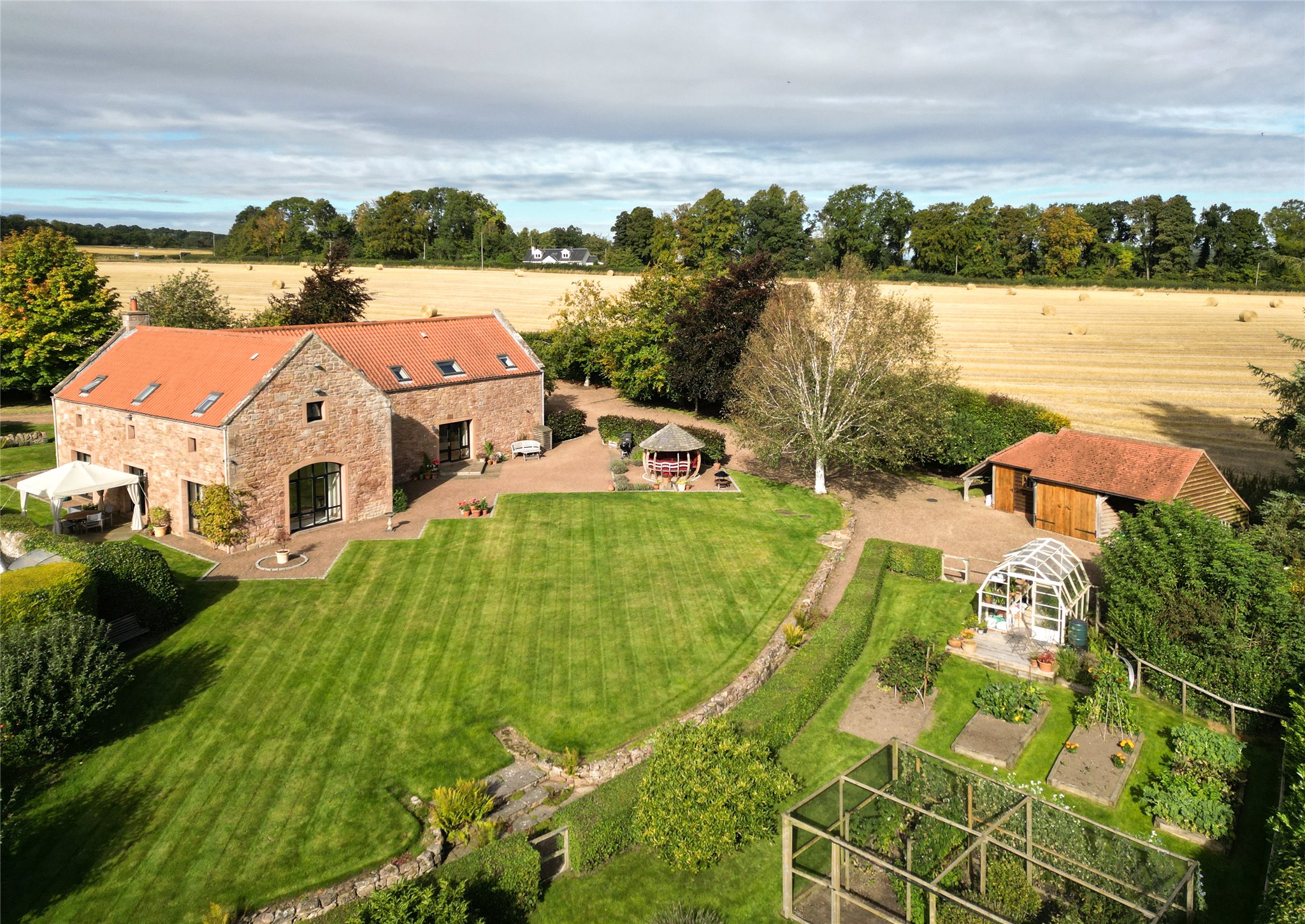 Garden: Beautifully manicured gardens surround the property with various sun terraces, mature herbaceous borders, raised vegetable beds, mature woodland, an apple orchard and a gravel driveway