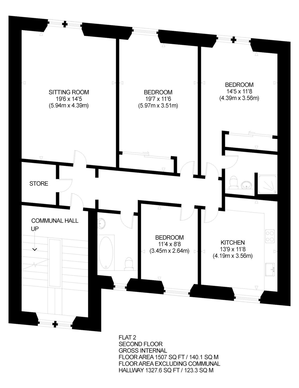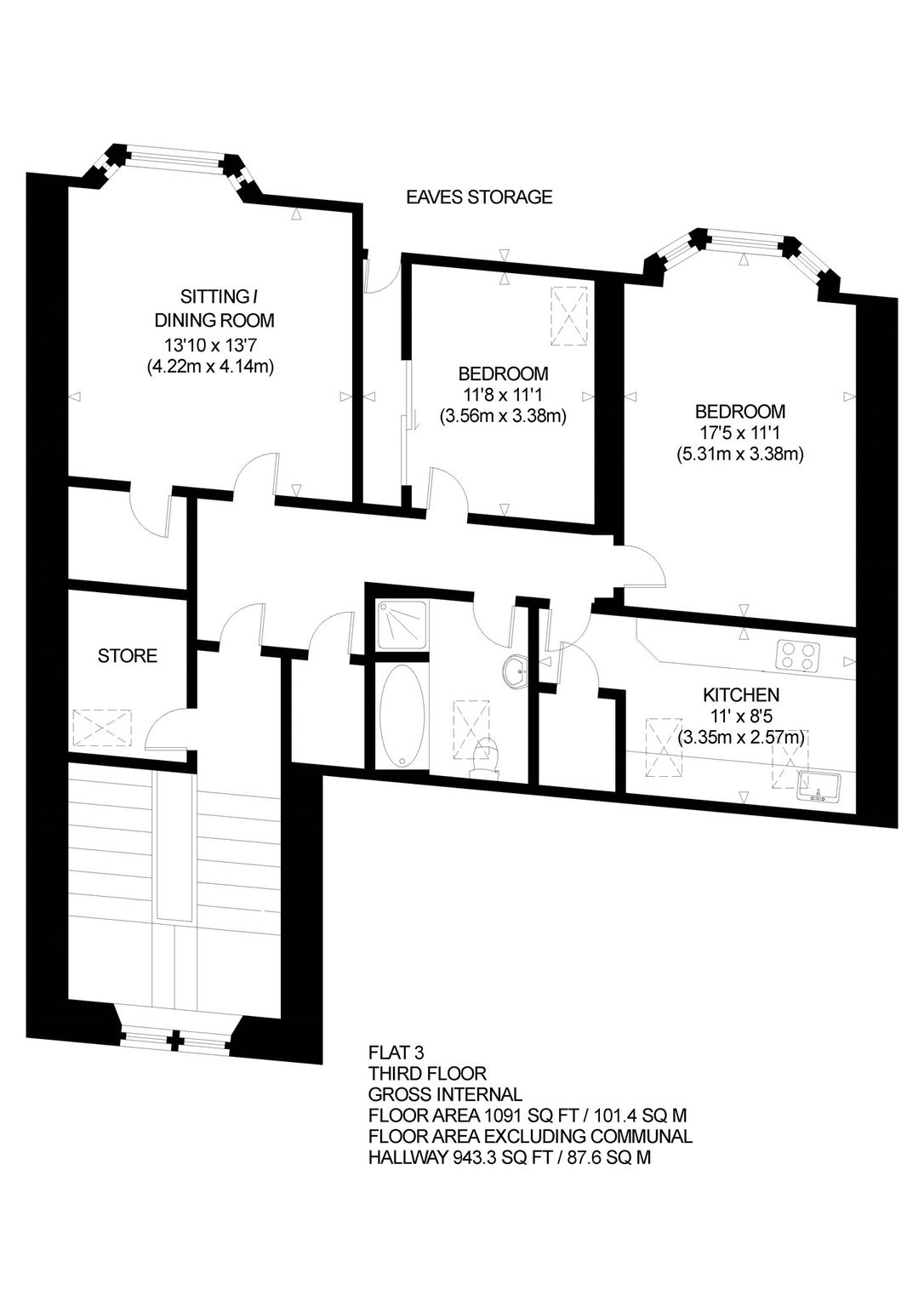 Third Floor: Flat 3: Hall, Sitting Room, Dining Room, Kitchen, Two double bedrooms and bathroom.