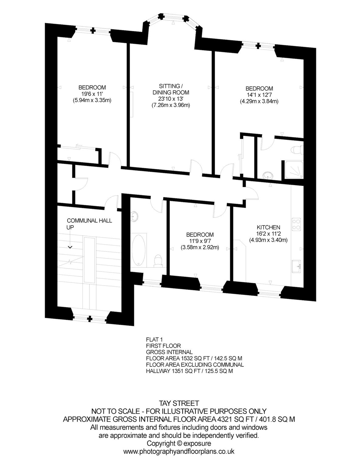 First Floor: Flat 1: Hall, sitting room, kitchen/breakfast room, Principal bedroom with ensuite shower room, two double bedrooms and family bathroom.