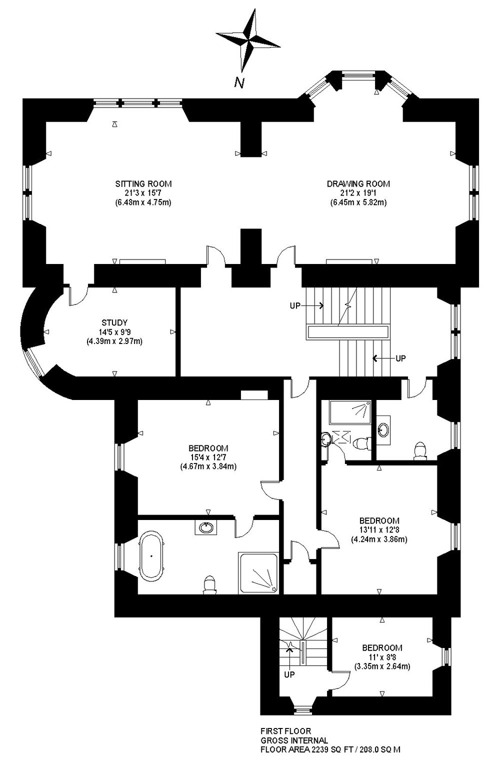 First Floor: Landing, Drawing Room, Study, Double Bedroom with en suite Bathroom, Double Bedroom with en suite Shower Room, and Cloakroom with WC. Double Bedroom via secondary staircase.