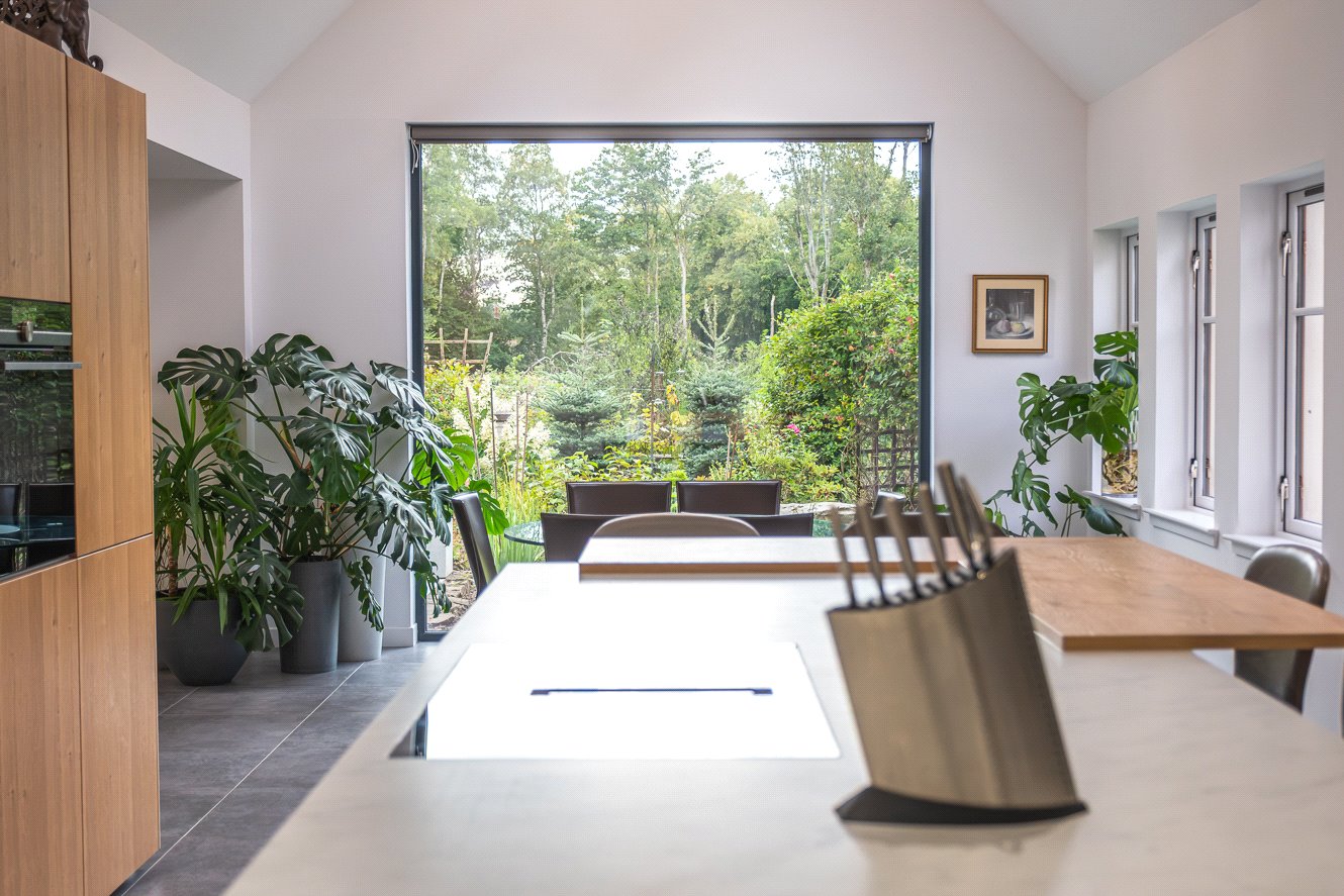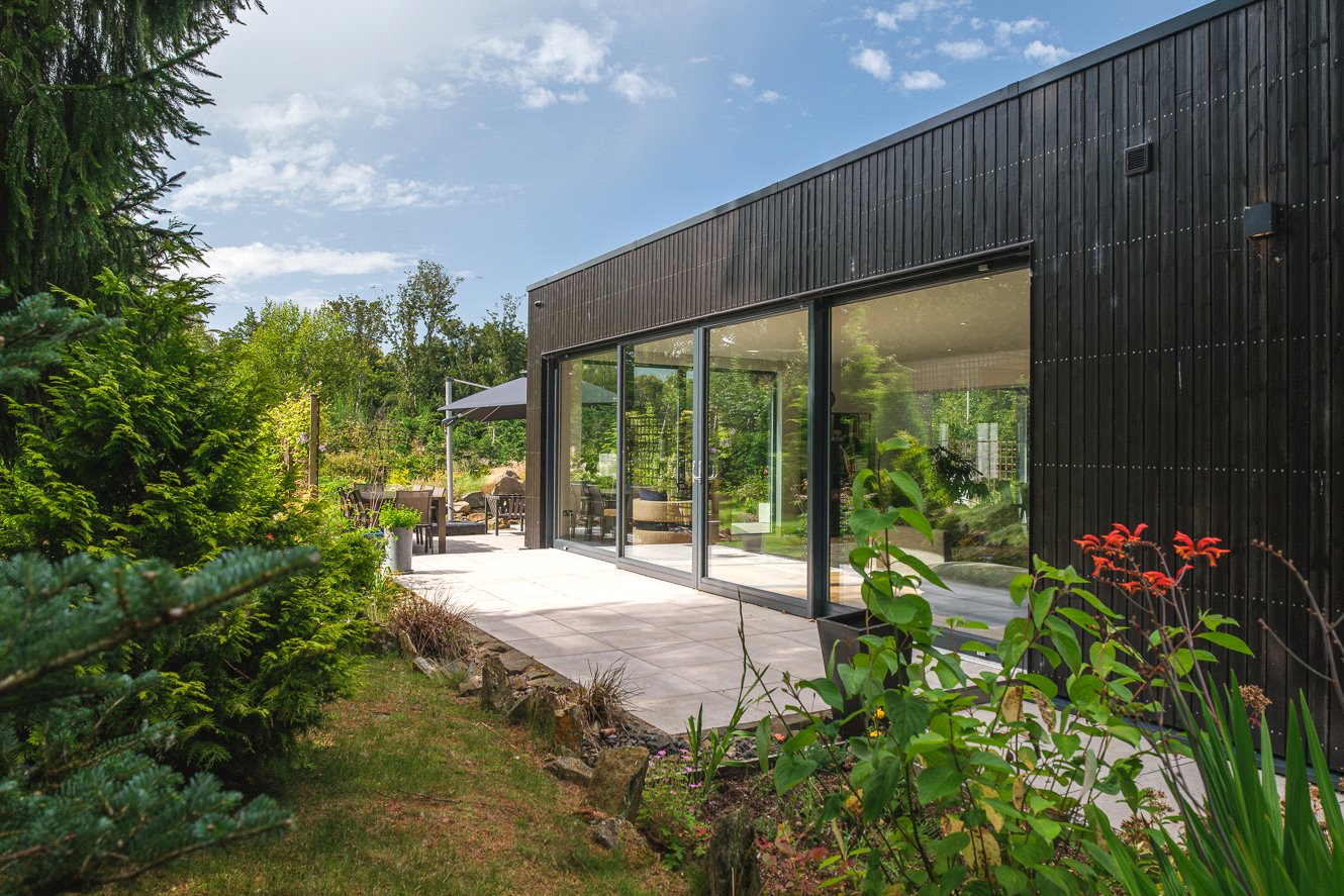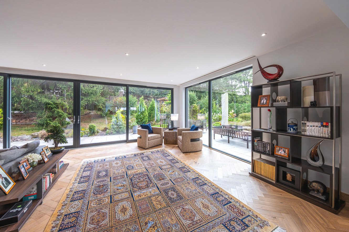Exterior: Established garden with lawn areas, feature rockery and mature trees and shrubs. Substantial wrap-around patio terrace with firepit.