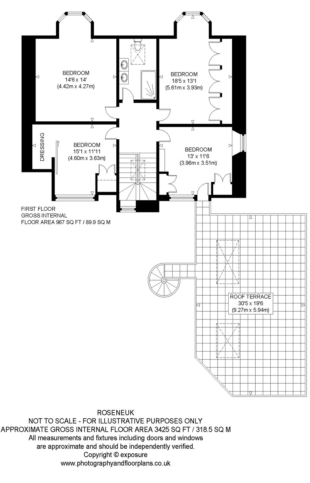 First Floor: Four Double Bedrooms and a Family Bathroom, access a large Roof Terrace, extensive Eaves storage and access to a partially floored Loft.